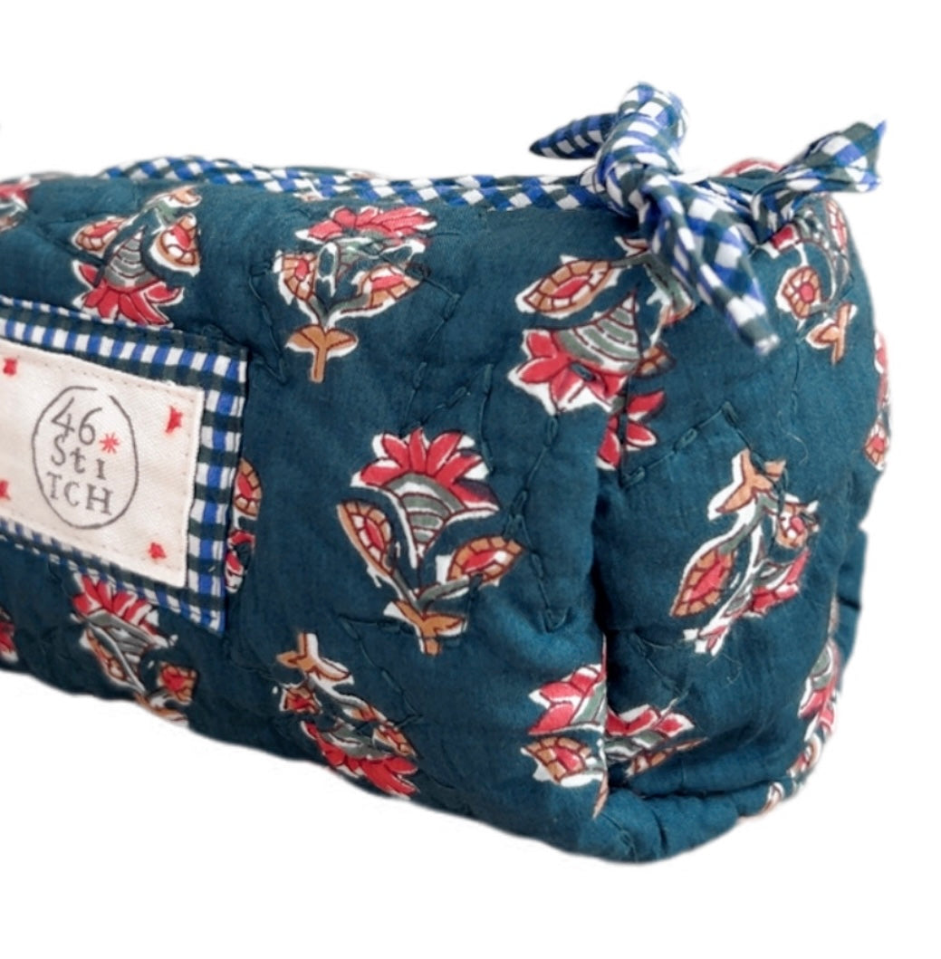 Handmade using leftover cotton quilting with a recycled-nylon waterproof lining pouch.