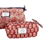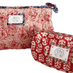 The Beth Make-Up Bag in Coral is a compact cosmetic bag made from surplus quilted cloth, small, sturdy and sustainably minded.
