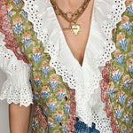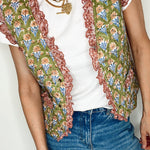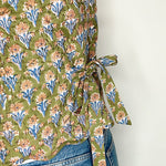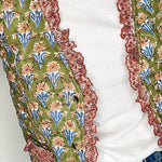 This beautiful cotton gilet is crafted from a khaki cotton deadstock hand-printed with pink, white, and blue floral highlights. Filled with soft 100% cotton wadding for a lightly padded silhouette. Contrast scallop-edged broderie trims add the perfect detail.