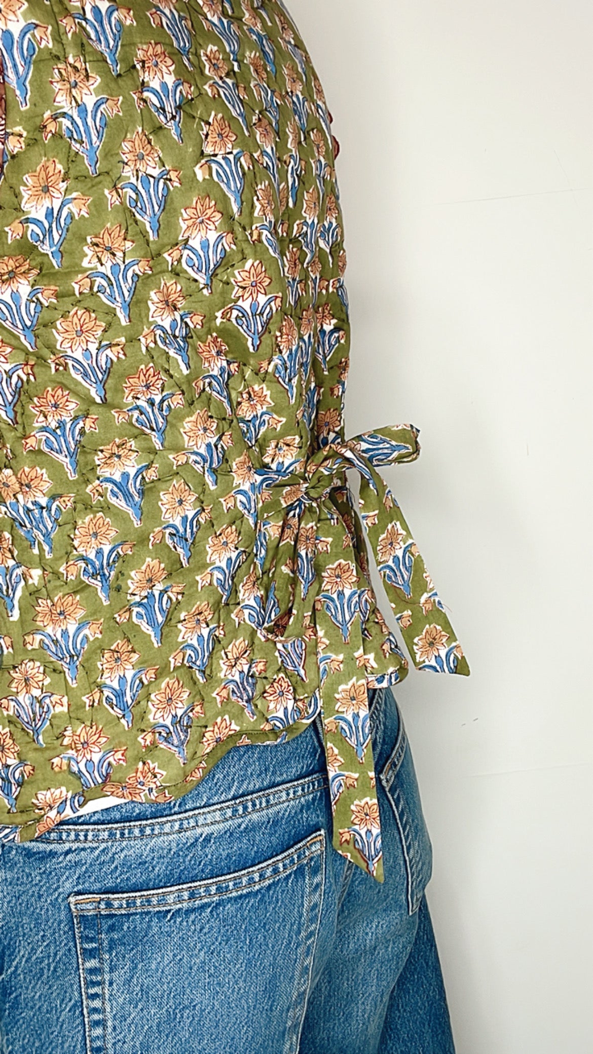 Say hello to structured charm with this fitted quilted waistcoat in a khaki floral woodblock print. This floral cotton quilted waistcoat is a perfect choice. A fresh take on your favourite jacket silhouette, designed to be worn solo or layered.