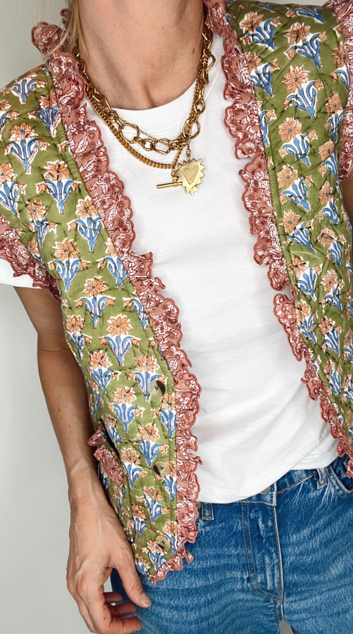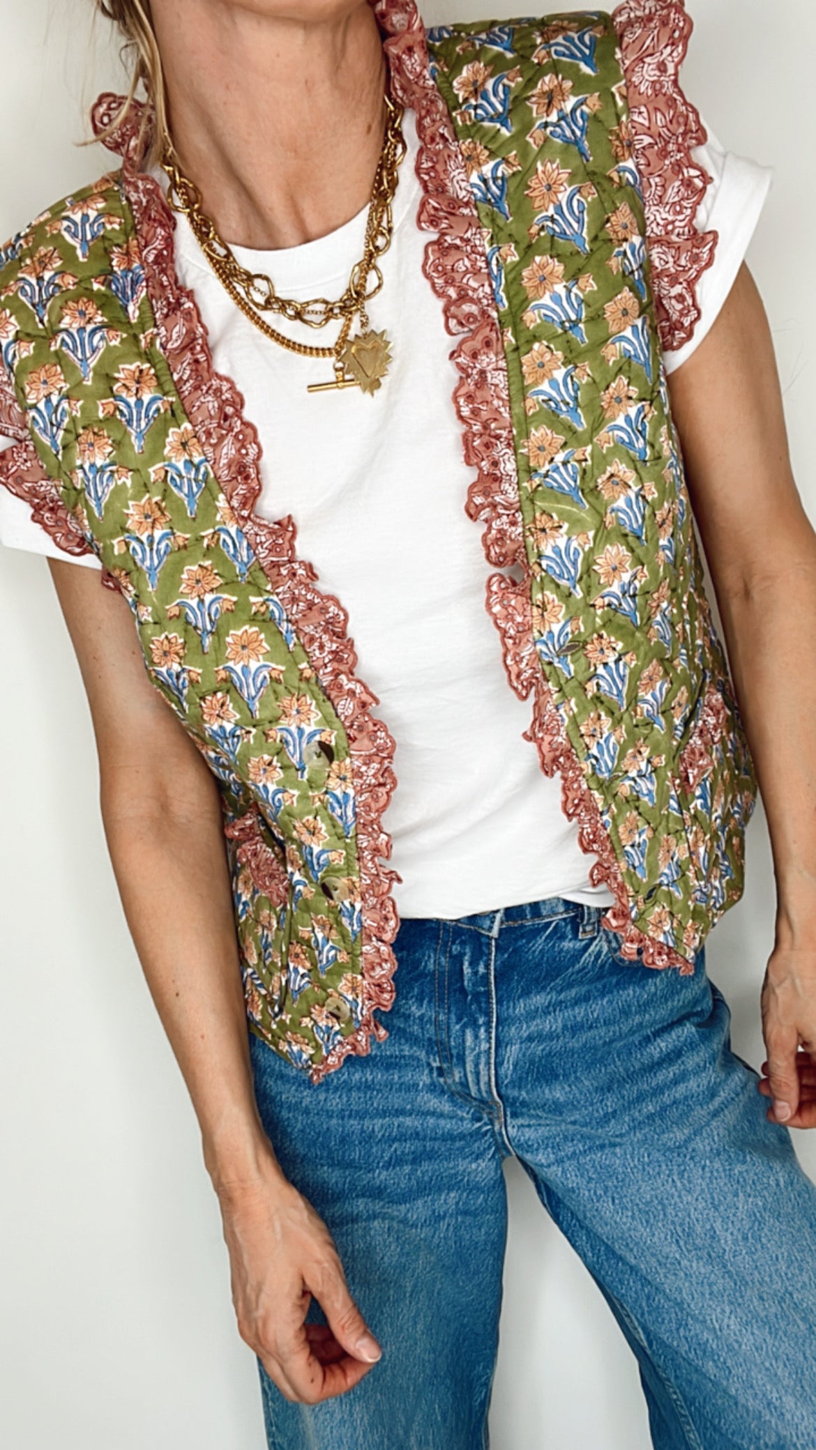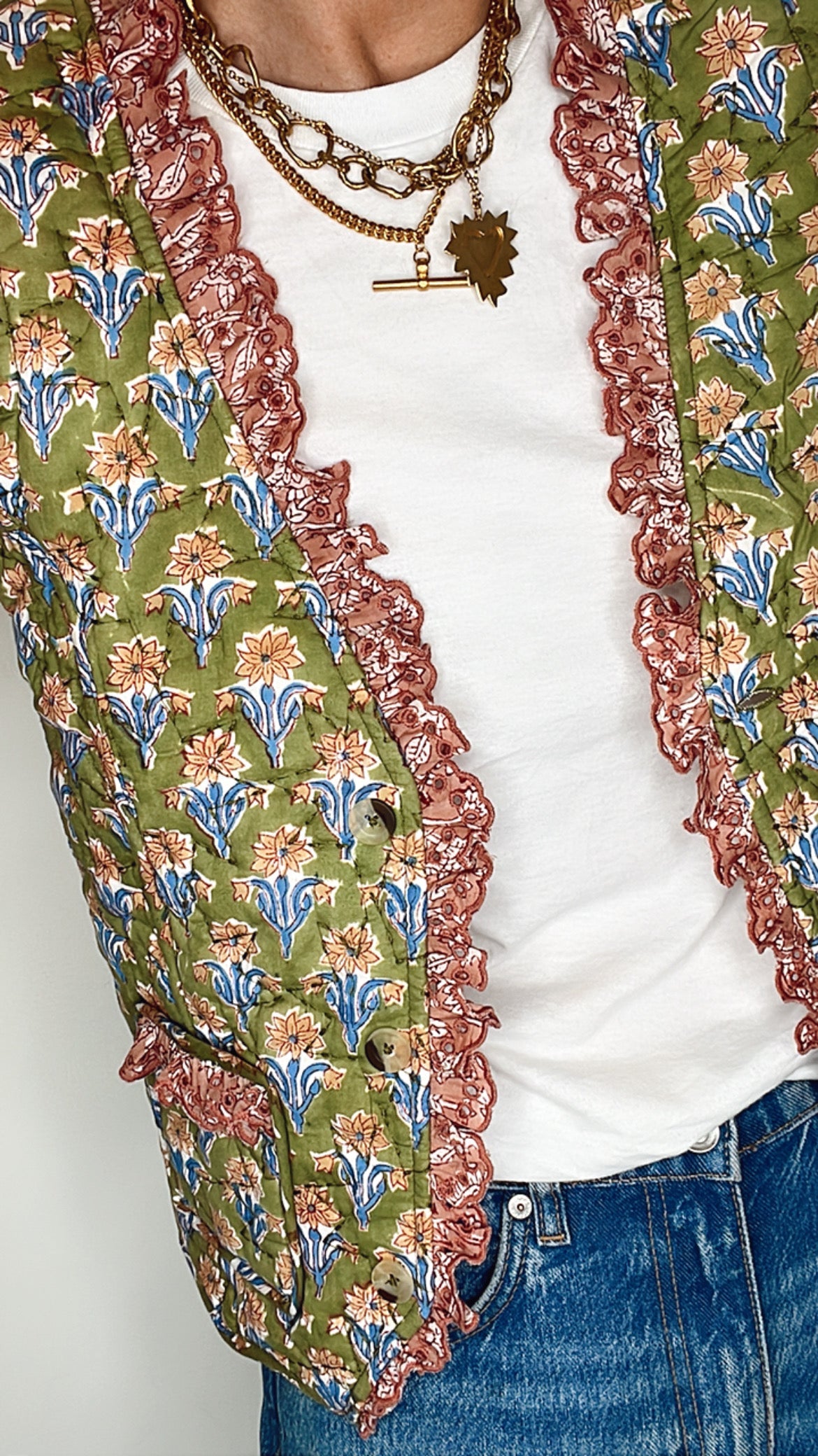 Kiki Cotton Quilted Waistcoat in Green and Pink