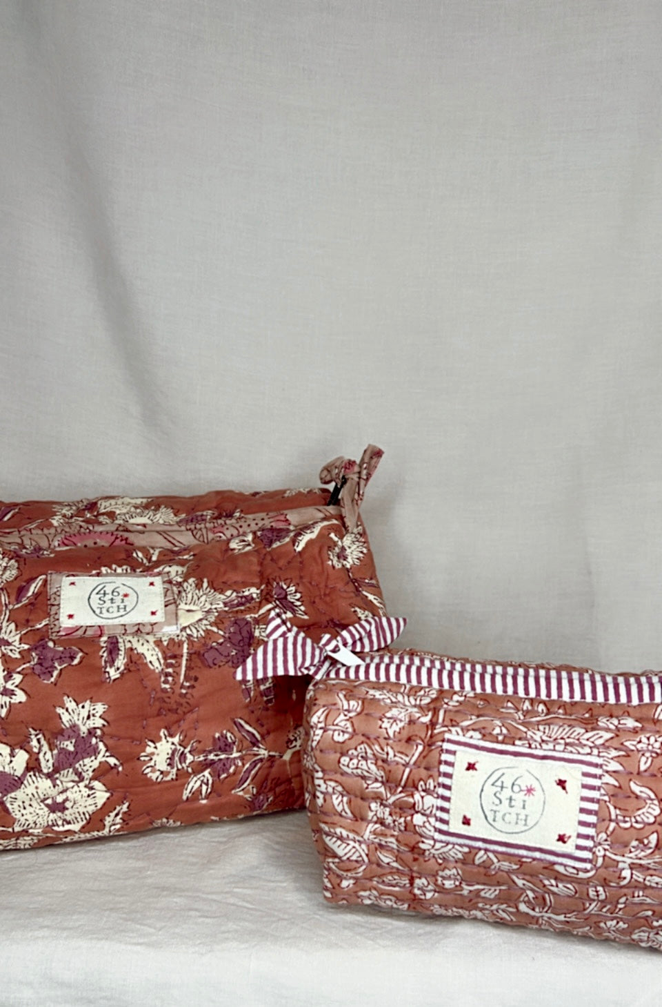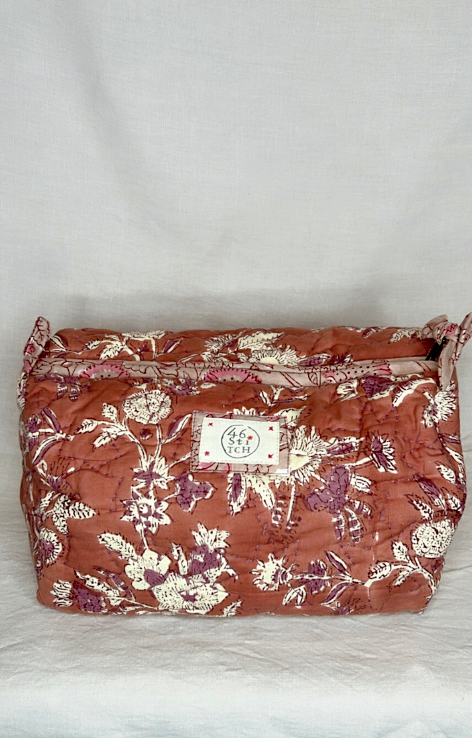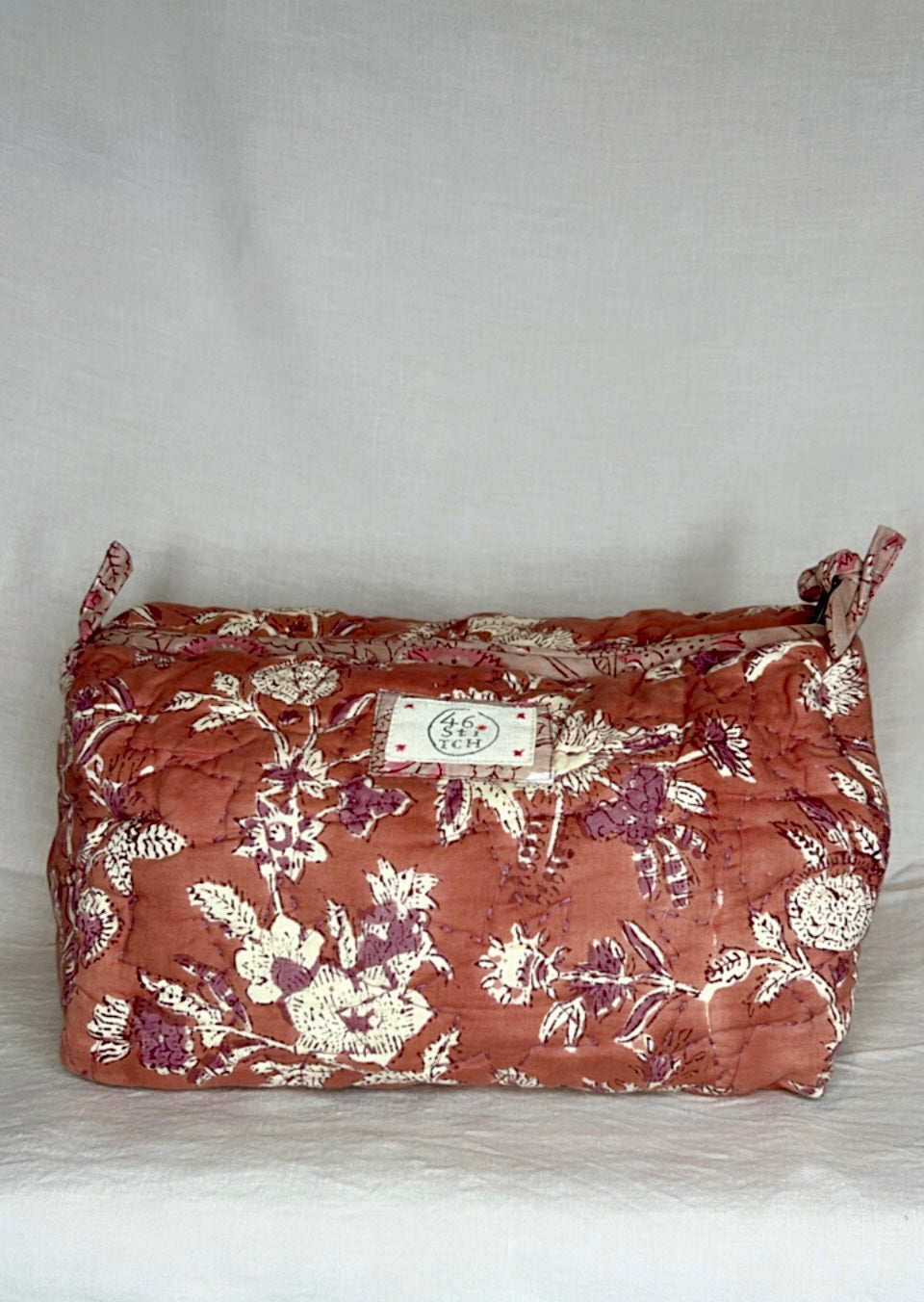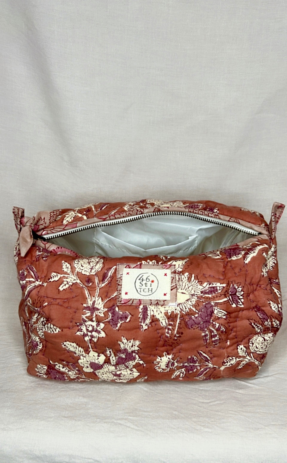 The Rose Jumbo Wash Bag in Terracotta is a capacious wash bag made from upcycled quilted remnants, colourful, practical and planet-minded.