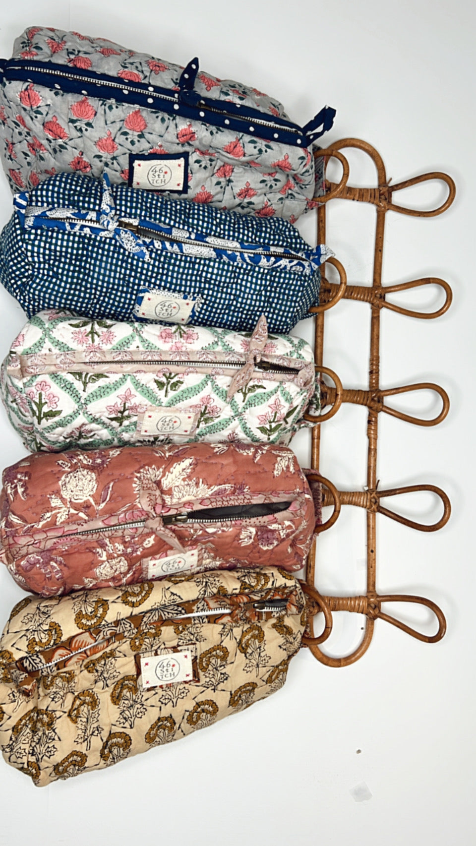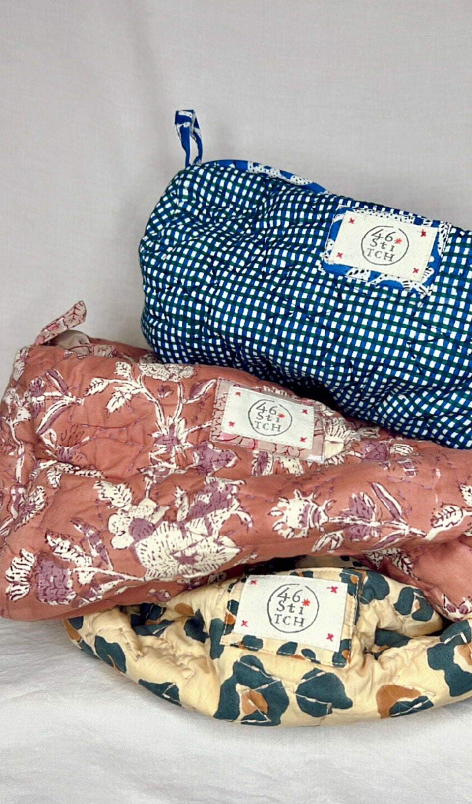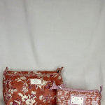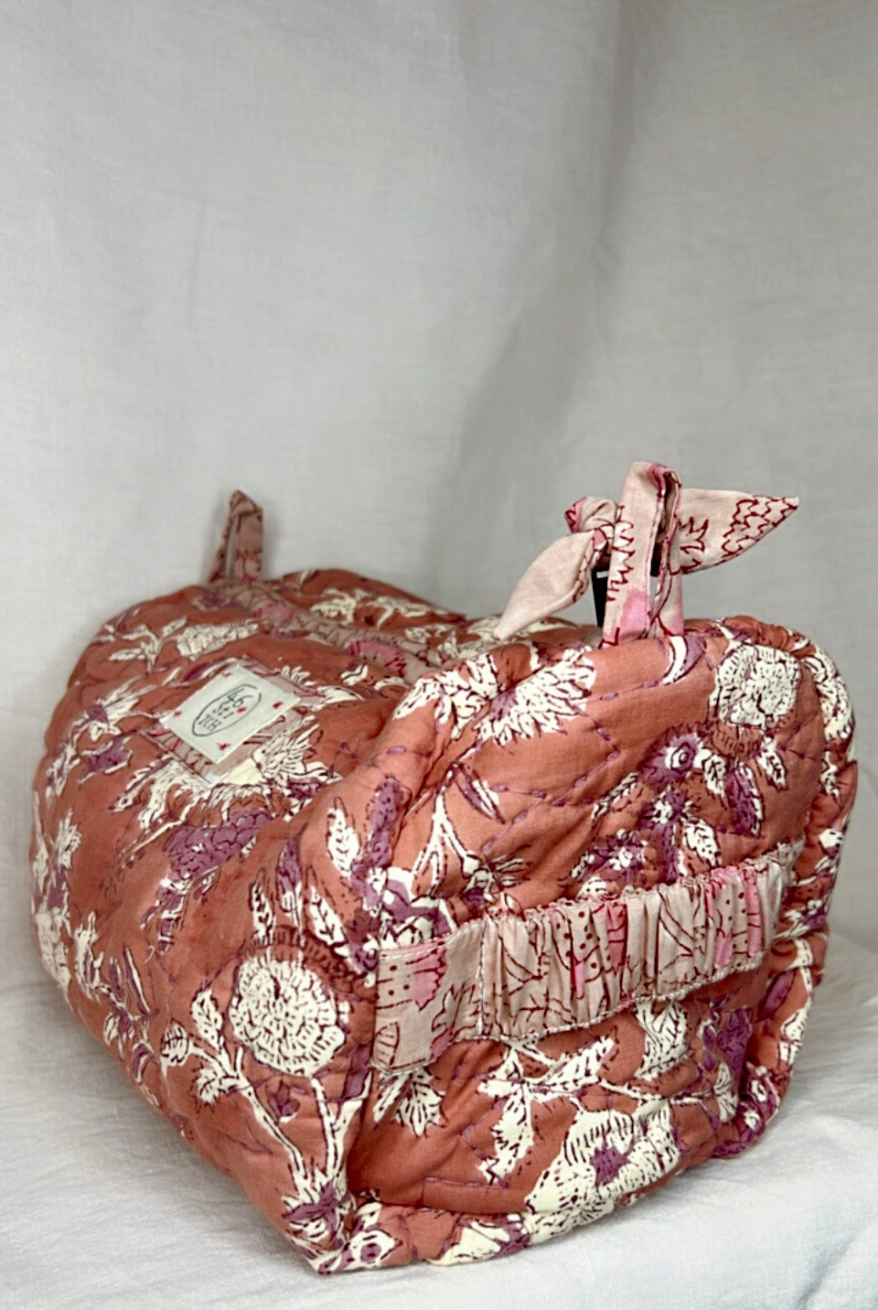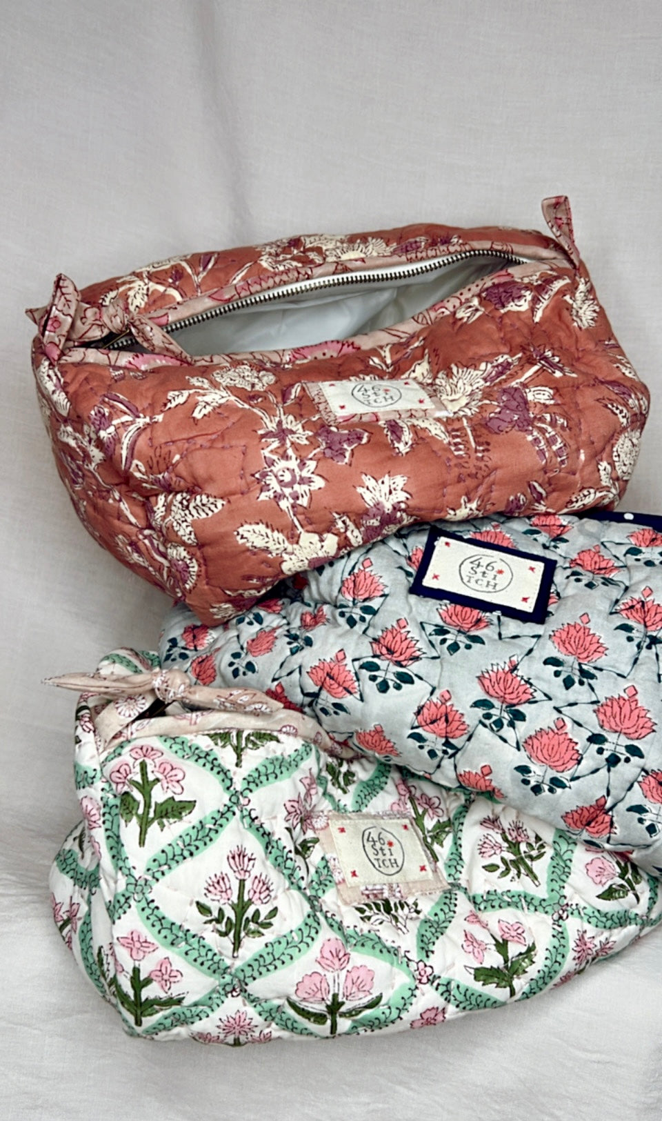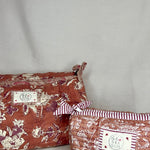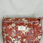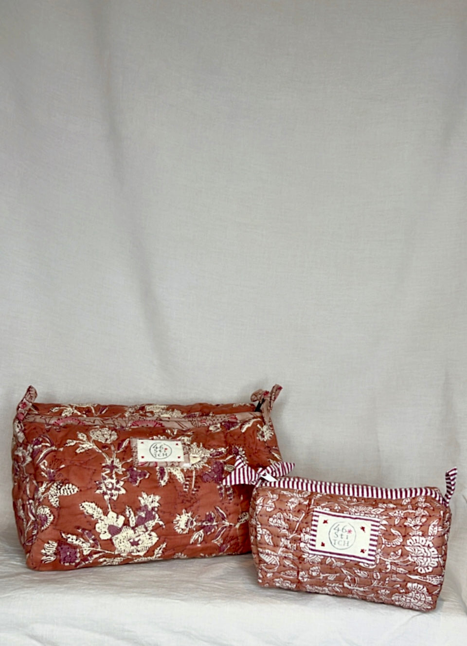 The Rose Jumbo Wash Bag in Terracotta is a capacious wash bag made from upcycled quilted remnants, colourful, practical and planet-minded.