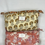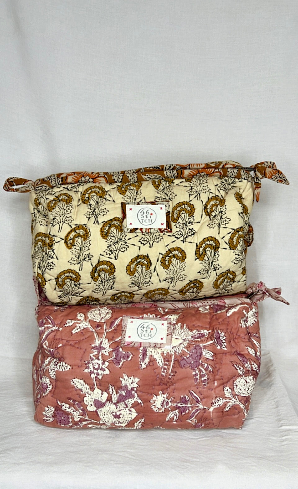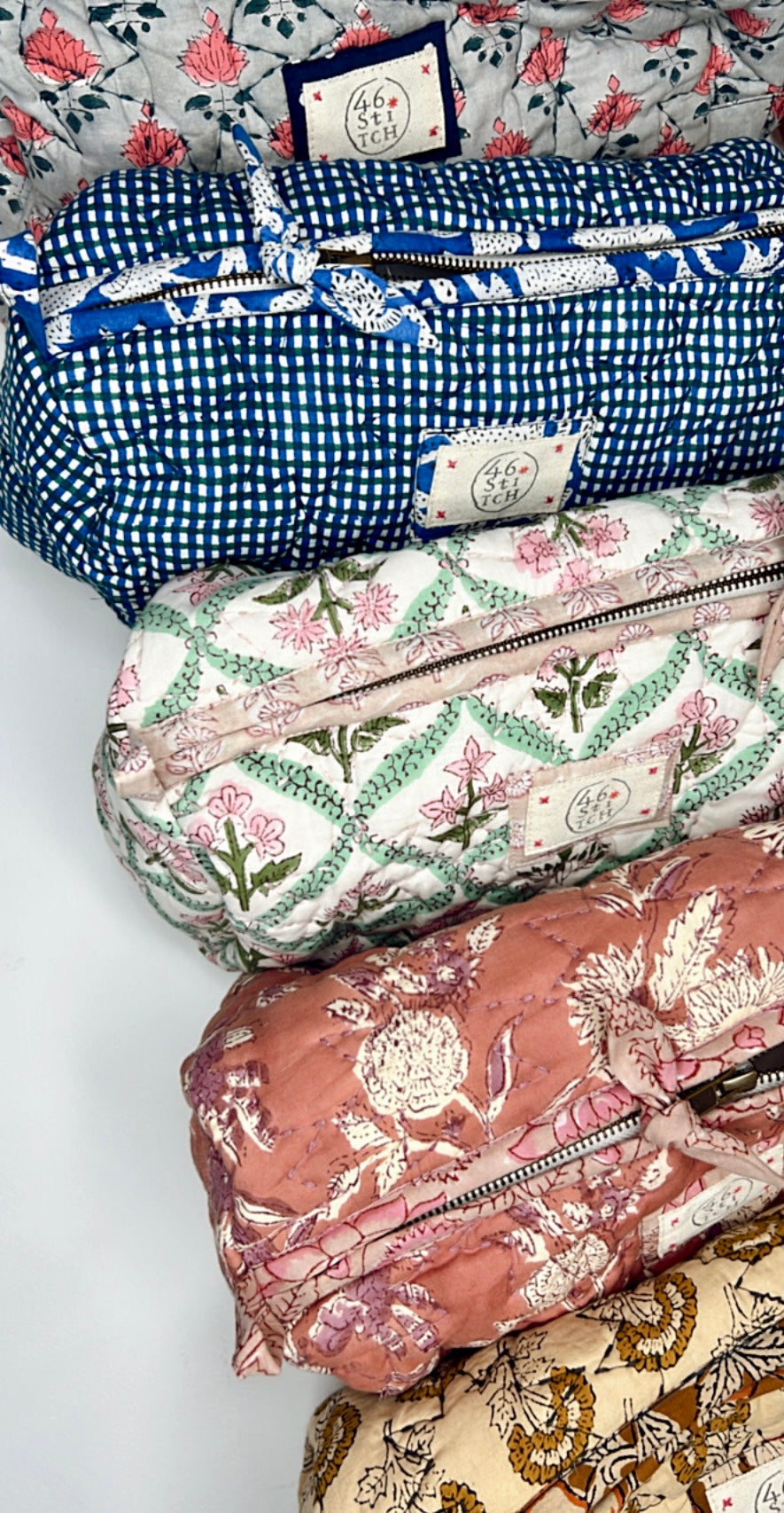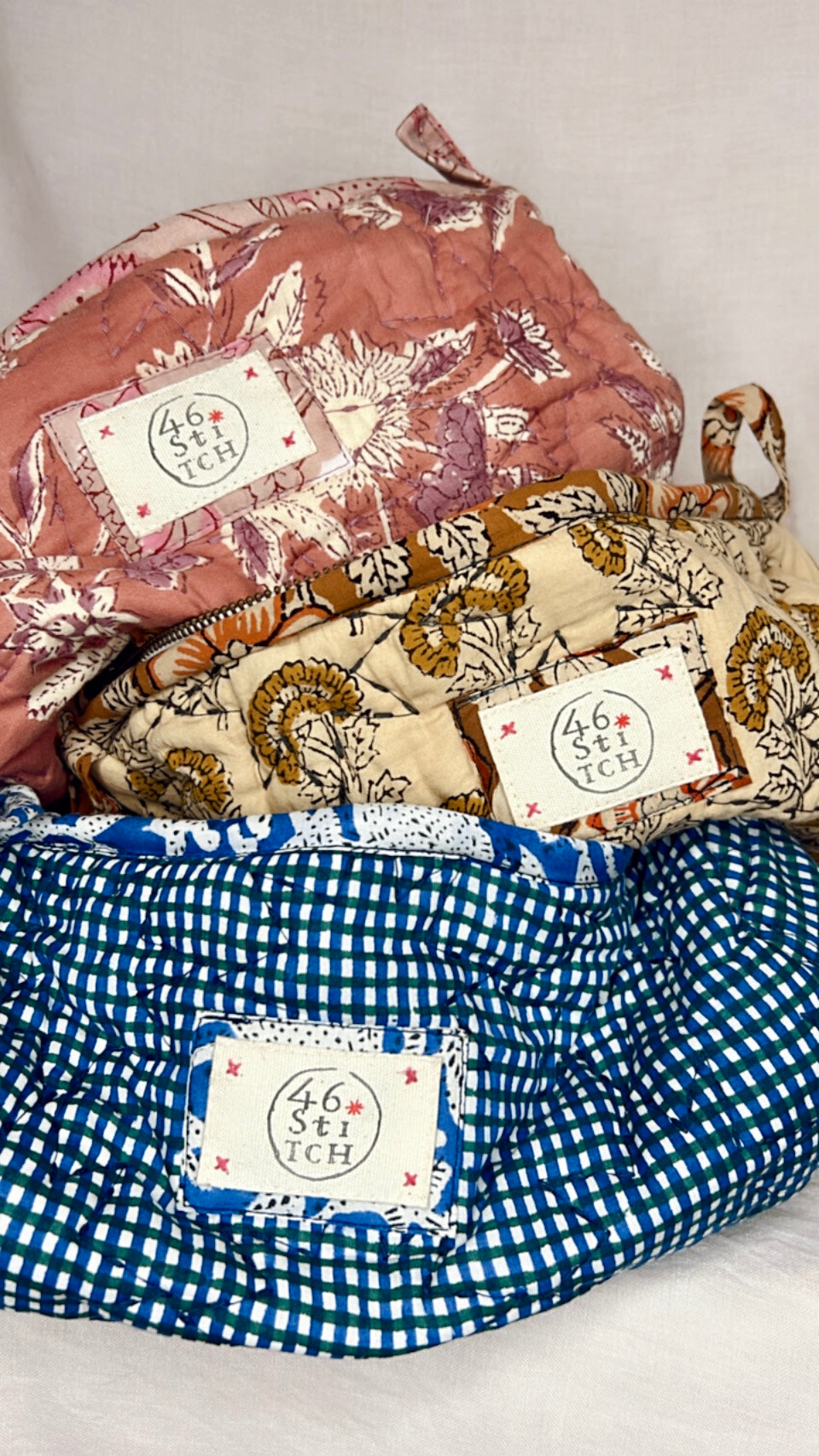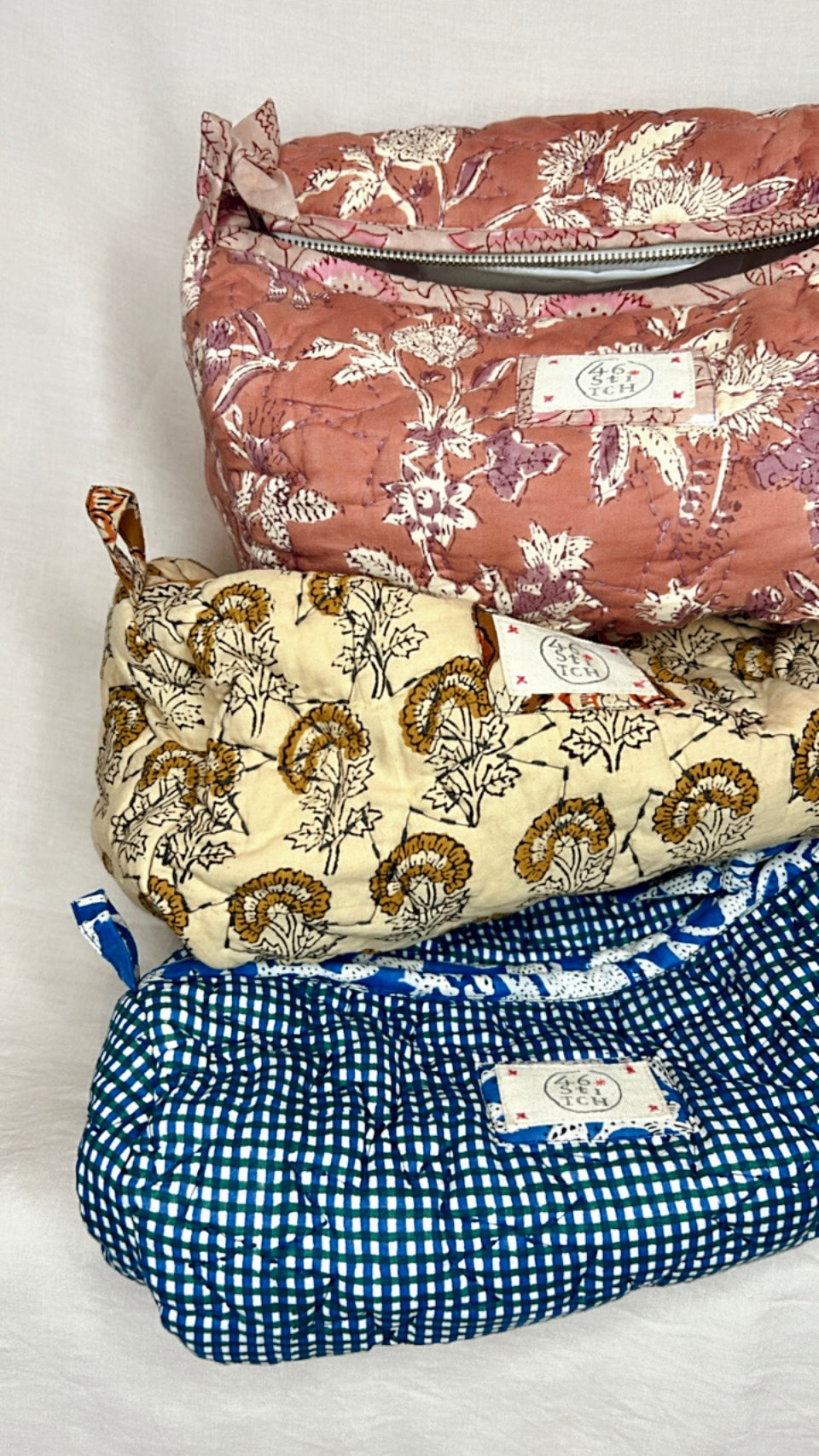 The Rose Jumbo Wash Bag in Terracotta is a capacious wash bag made from upcycled quilted remnants, colourful, practical and planet-minded.