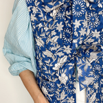 The Sa Pa Quilted Bow Gilet in Blue Floral by 46 Stitch is a joyful, limited-edition layering piece with a cropped, boxy fit and romantic detailing. Handmade from hand-printed cotton remnants with soft cotton wadding, it combines comfort with artisanal craft.