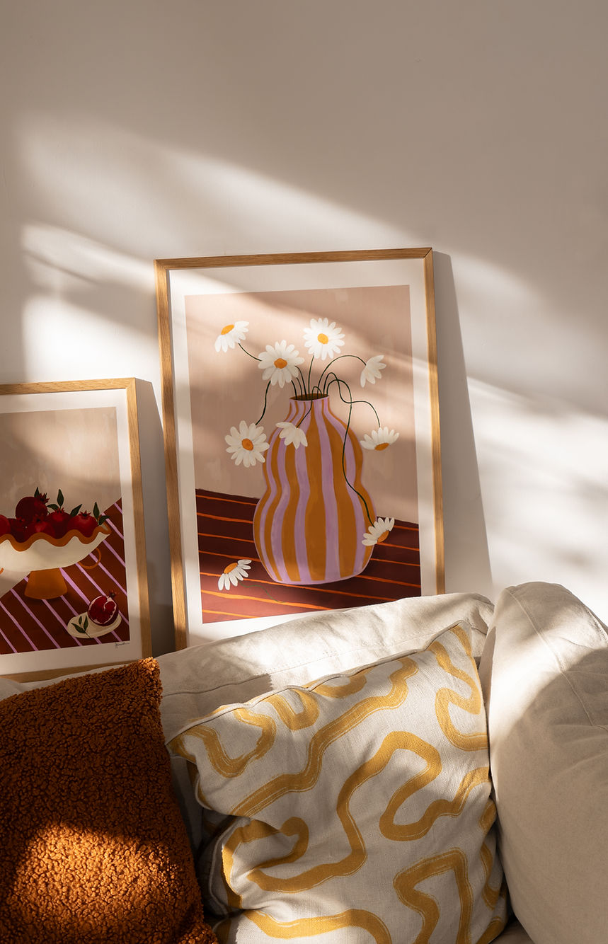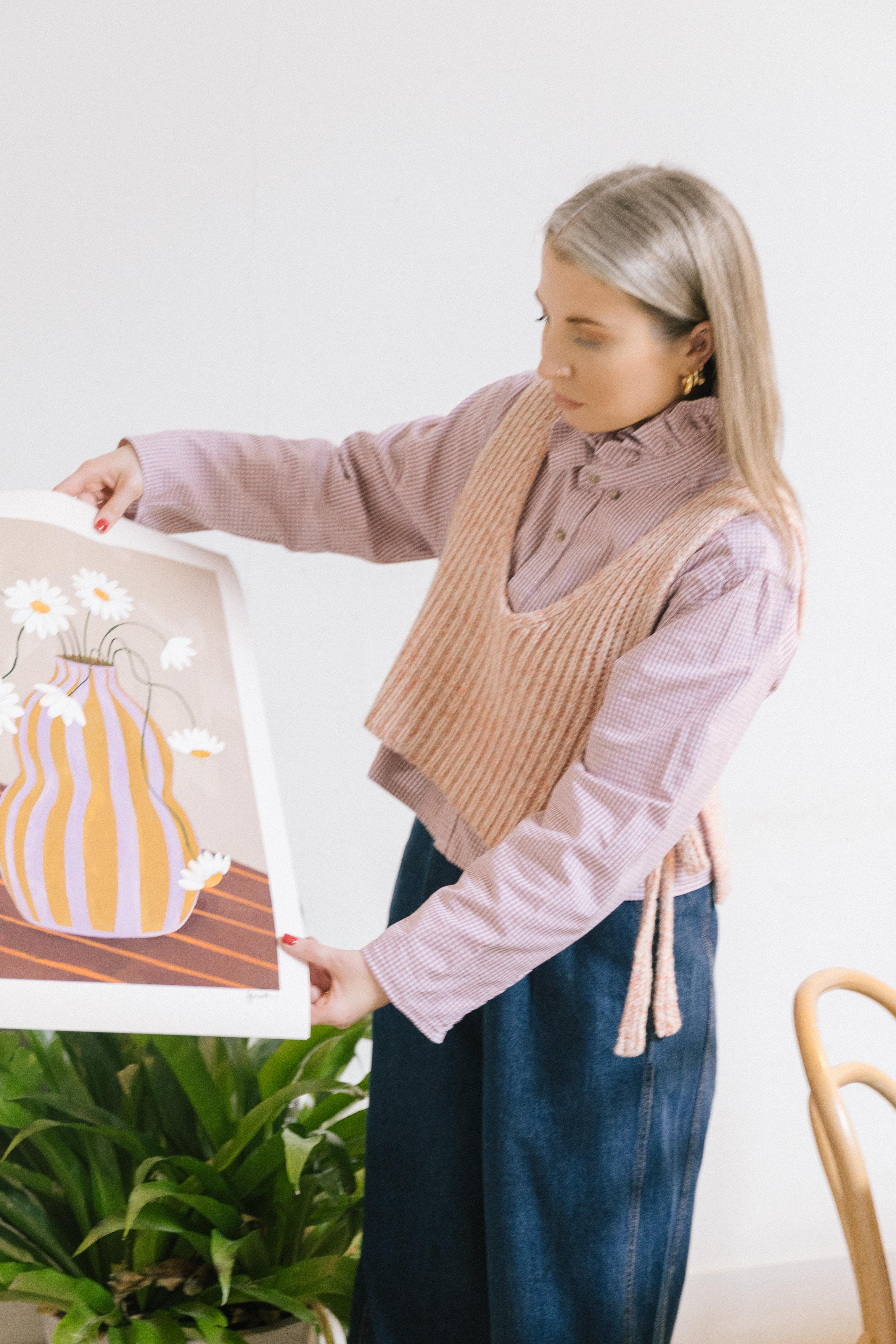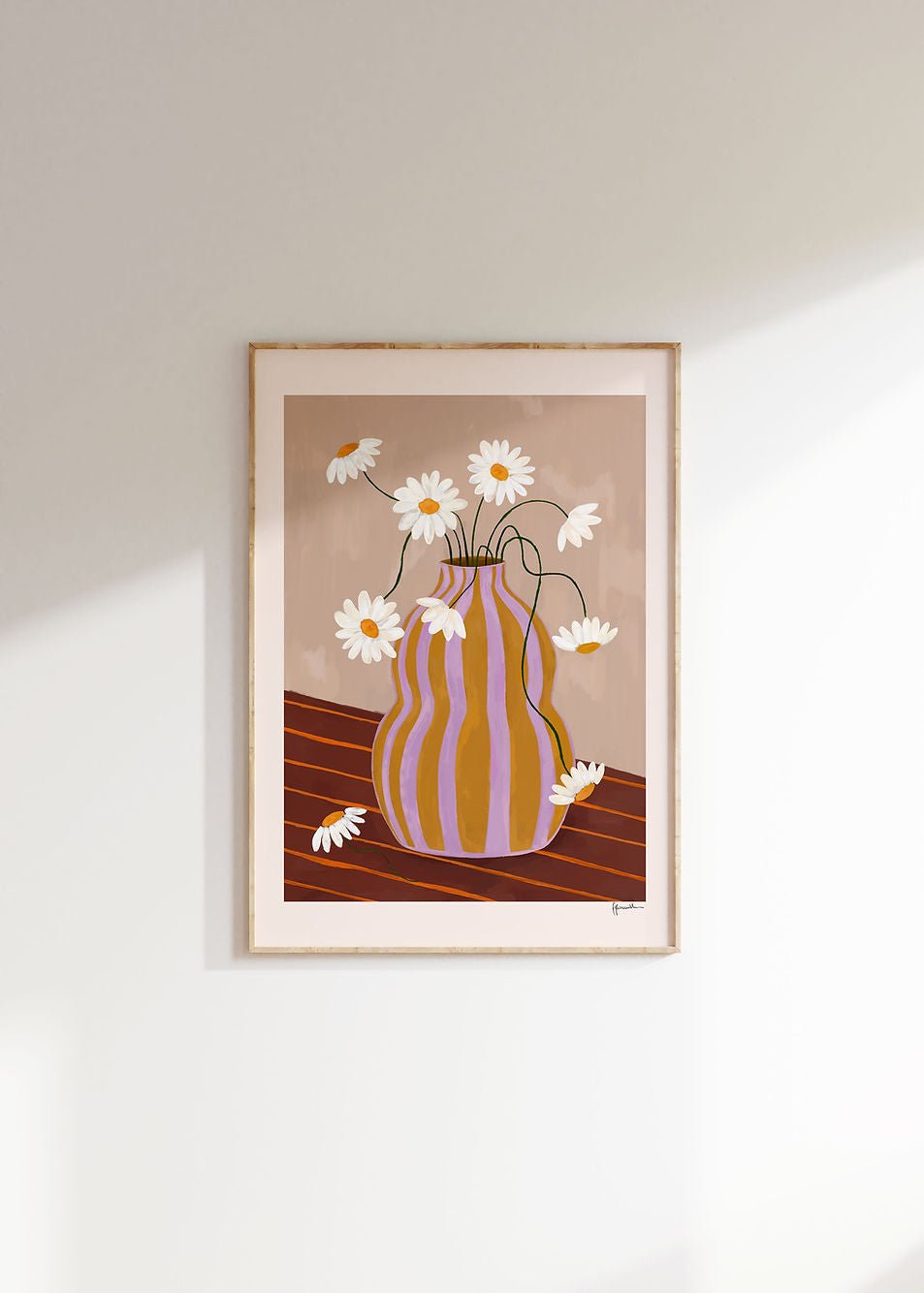 Daisies in Lilac & Yellow Striped Vase print by artist Frankie Penwill