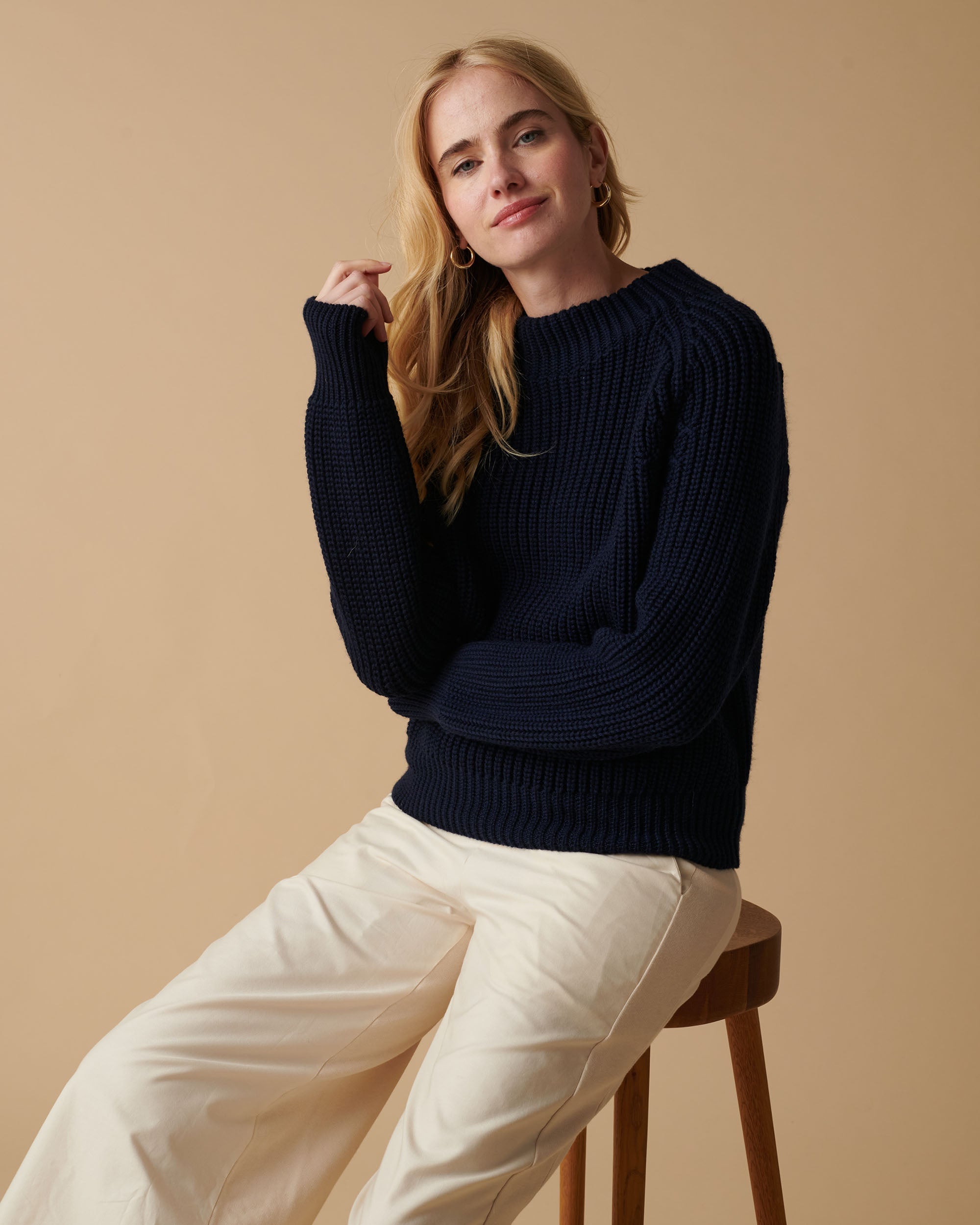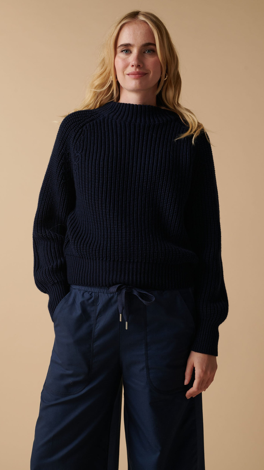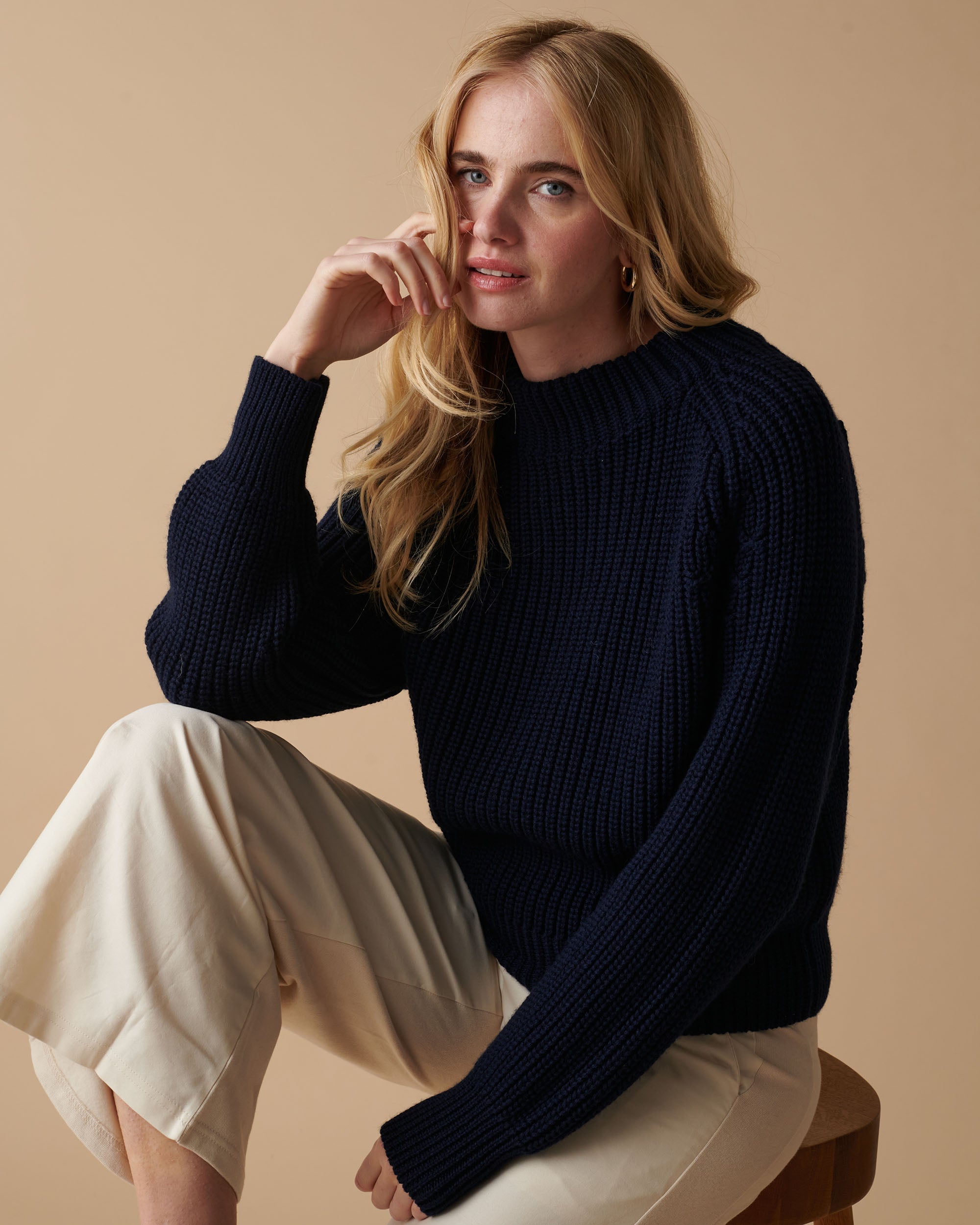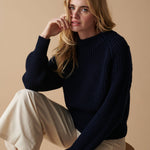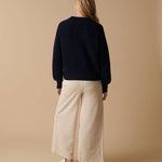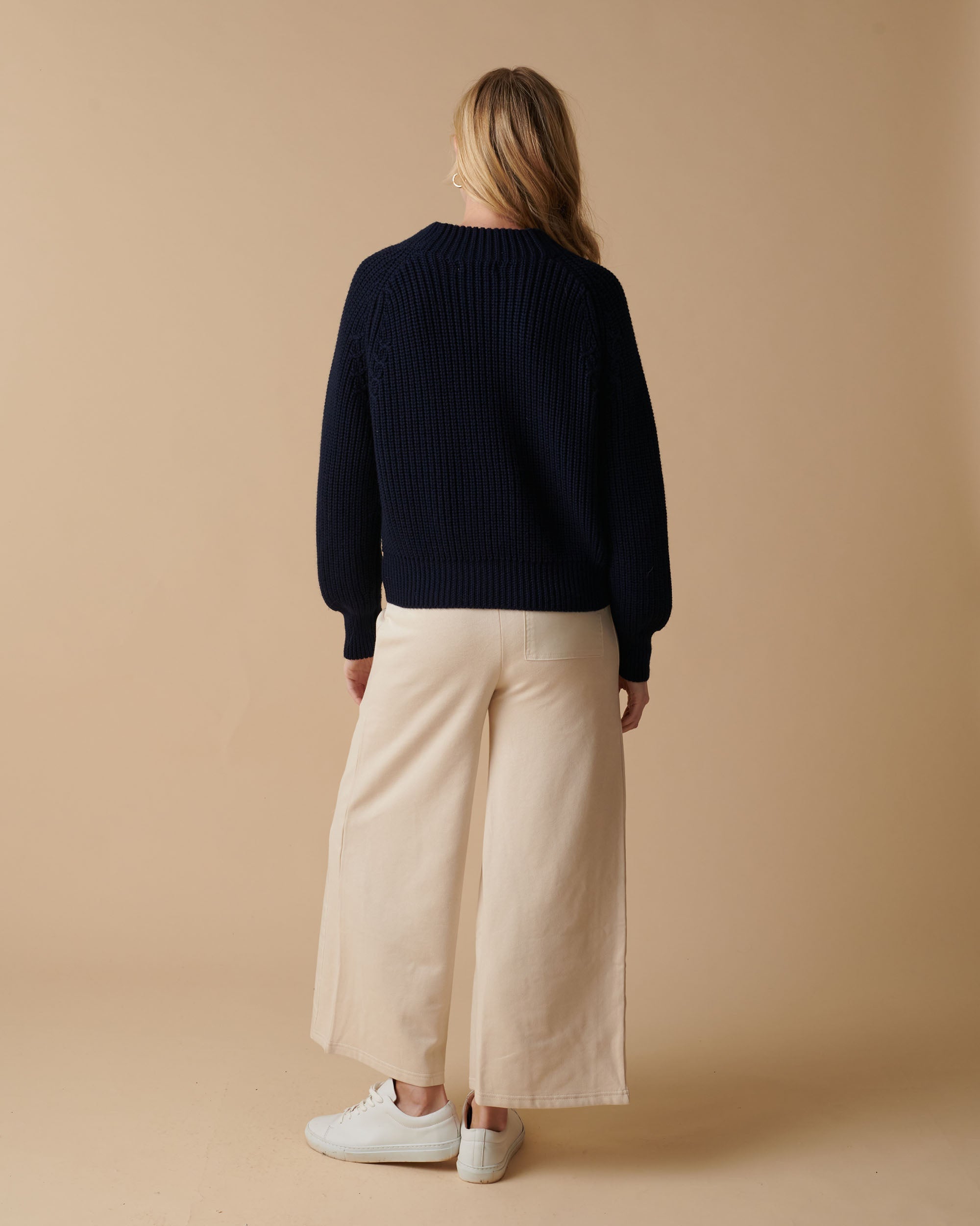 Crafted in Italy from 100% Merino Wool, this luxuriously soft, deep navy jumper is perfect whatever the weather. Complete with a feminine cable detail on the sleeves for a modern twist on the traditional fisherman's sweater. It is the perfect layering piece for all seasons.
