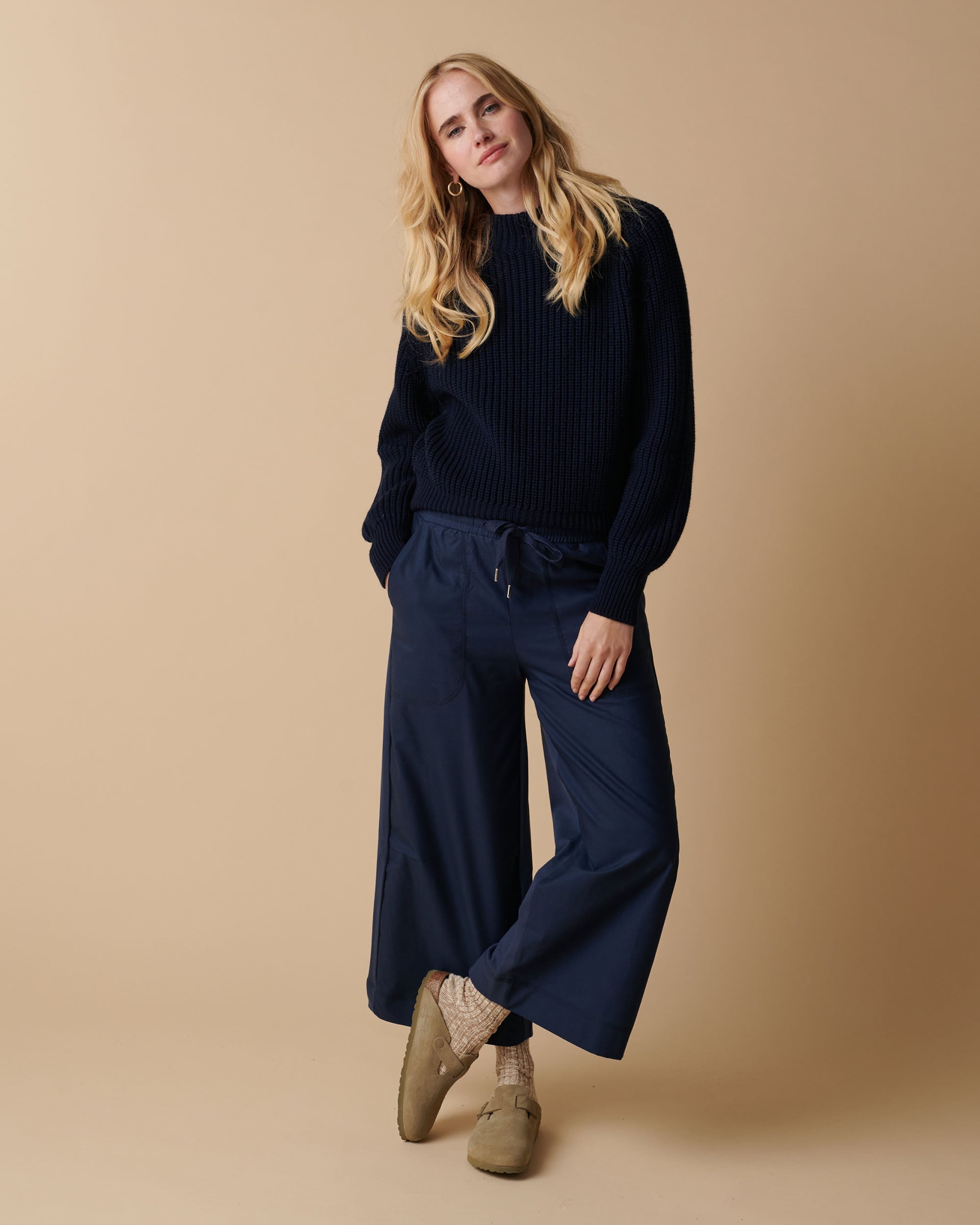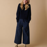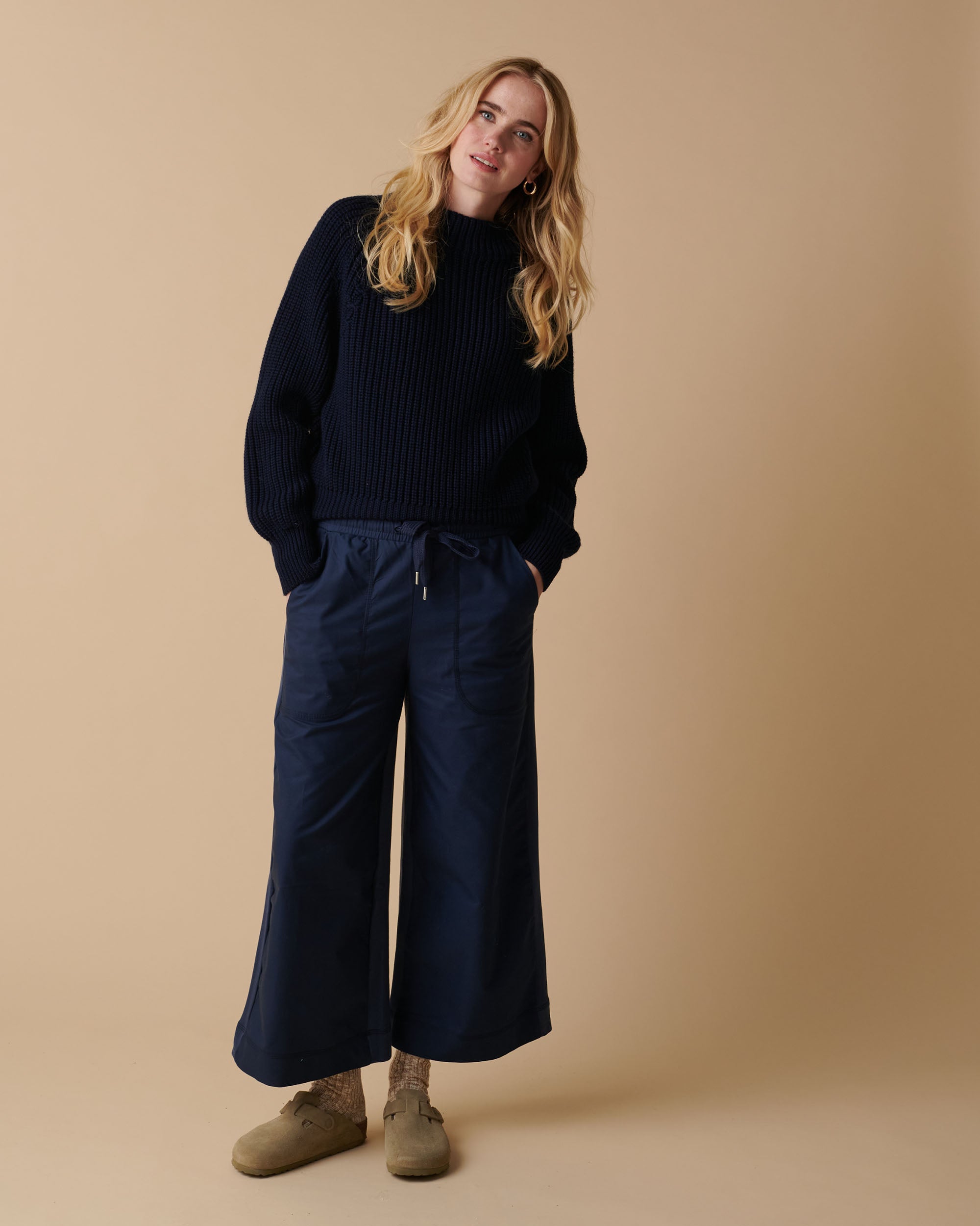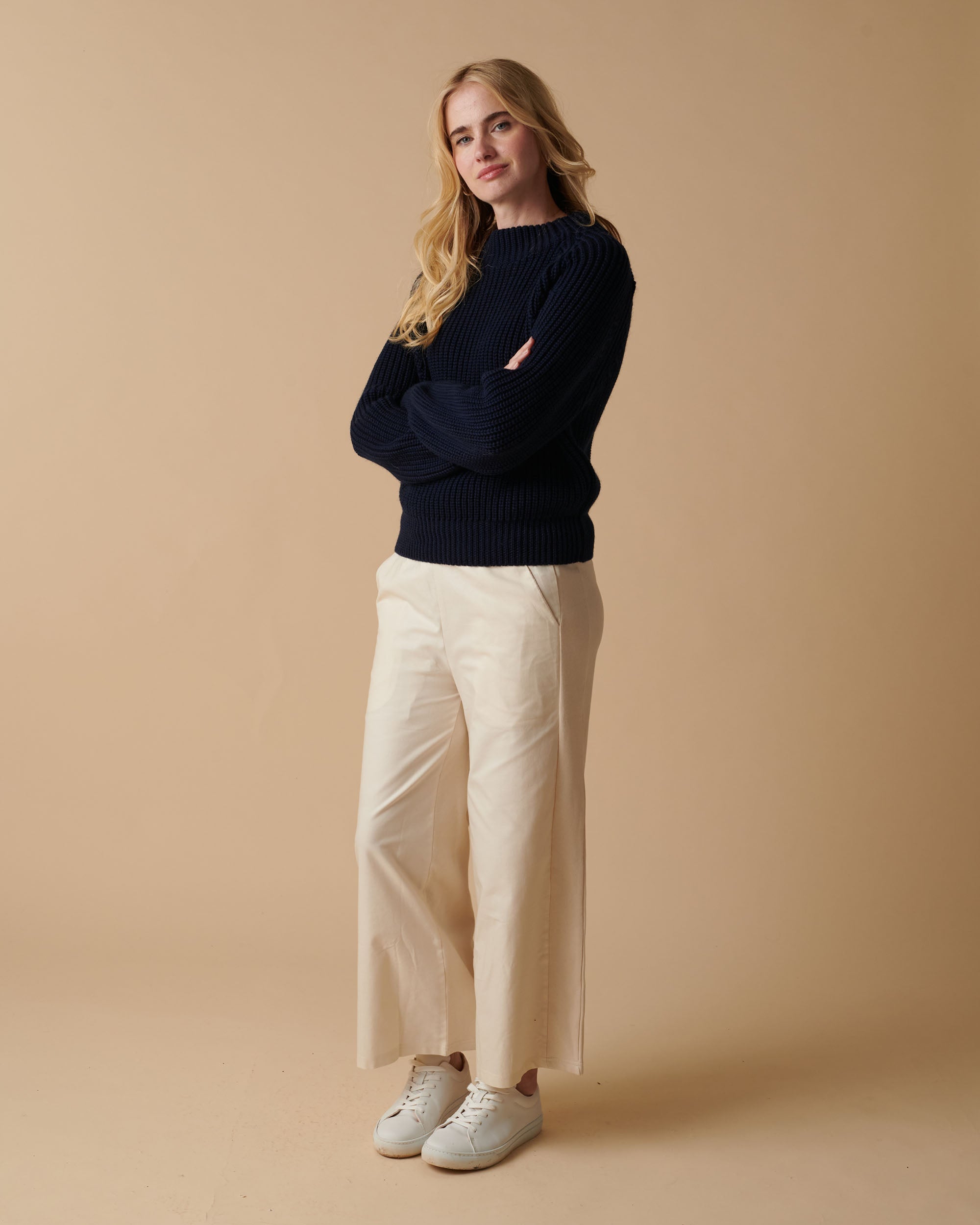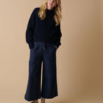 Crafted in Italy from 100% Merino Wool, this luxuriously soft, deep navy jumper is perfect whatever the weather. Complete with a feminine cable detail on the sleeves for a modern twist on the traditional fisherman's sweater. It is the perfect layering piece for all seasons.