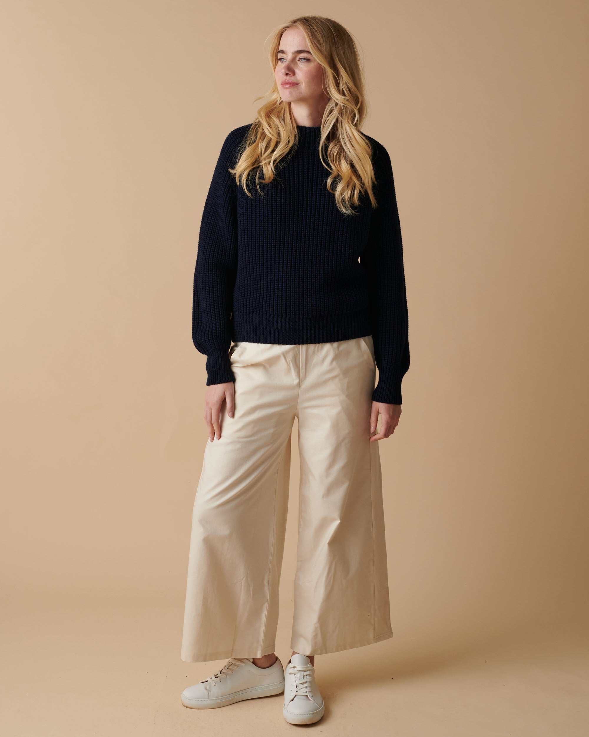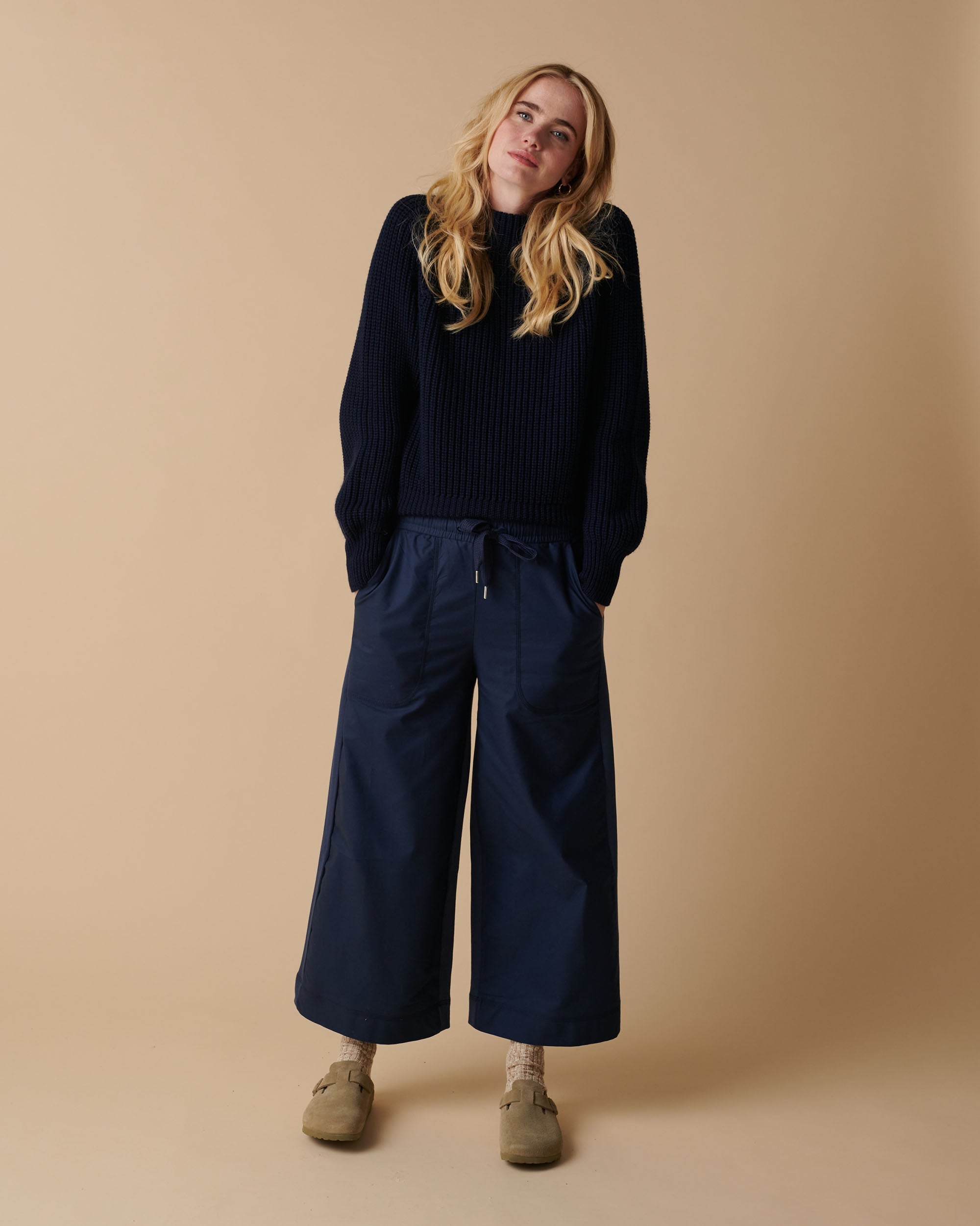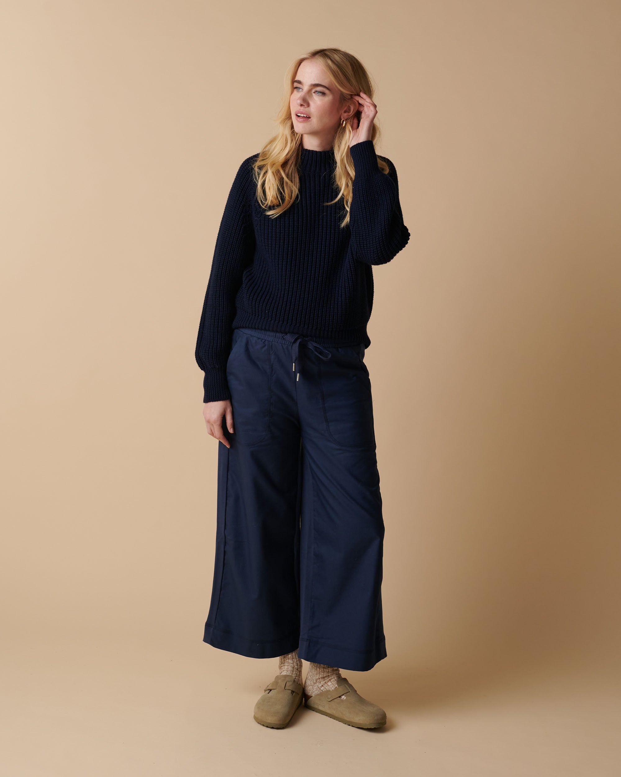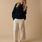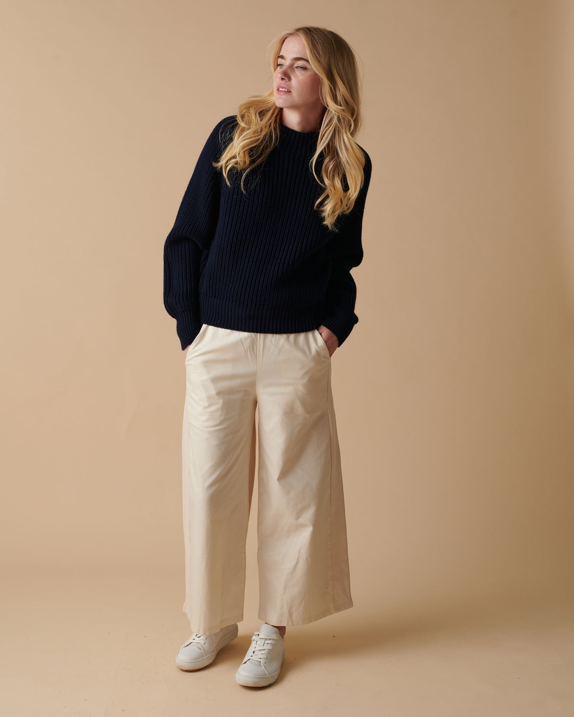 Crafted in Italy from 100% Merino Wool, this luxuriously soft, deep navy jumper is perfect whatever the weather. Complete with a feminine cable detail on the sleeves for a modern twist on the traditional fisherman's sweater. It is the perfect layering piece for all seasons.