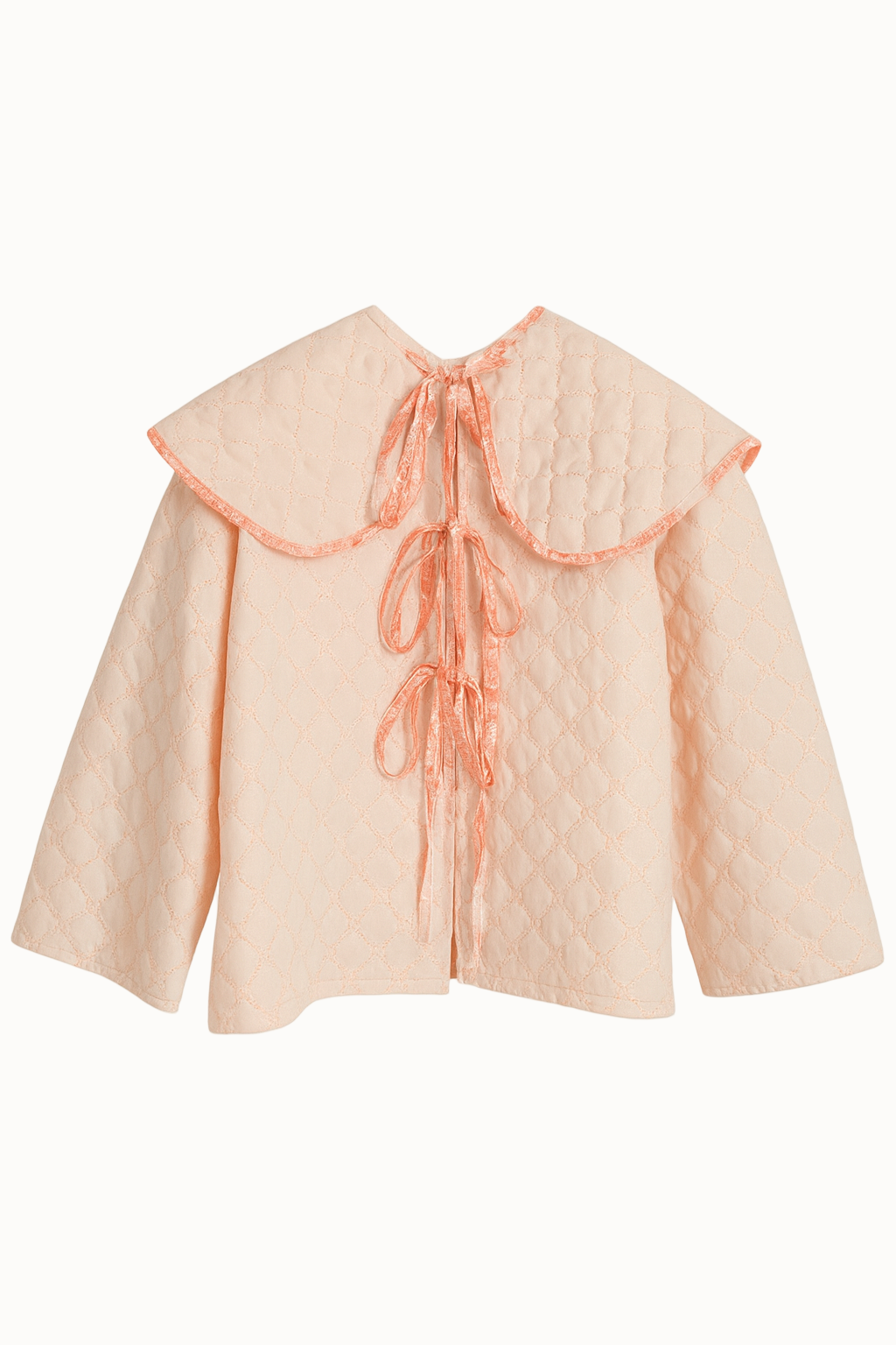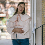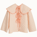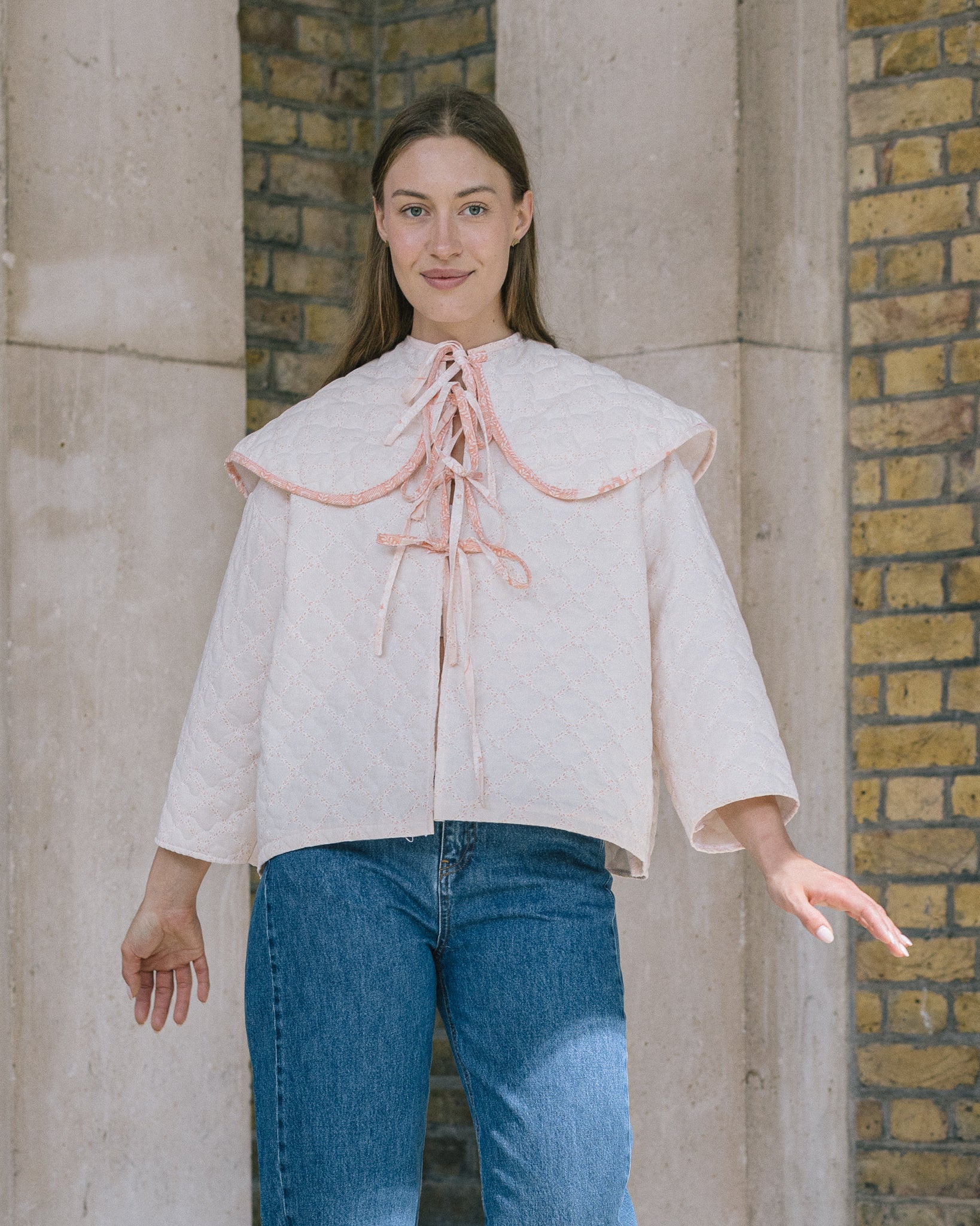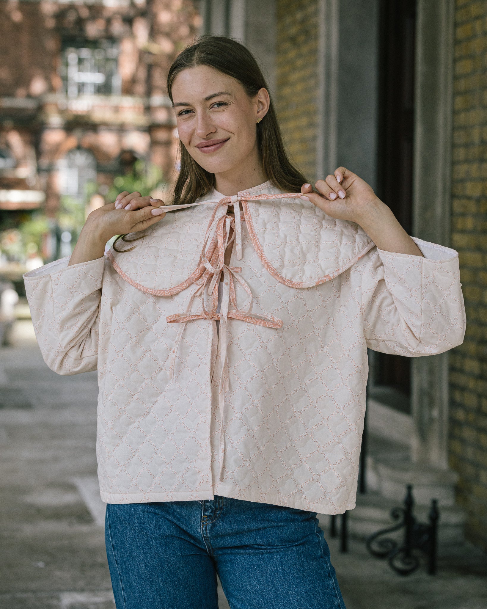 The Eleanor Jacket is designed with a detachable collar, tie-front closure and apricot trims. Its floral print and quilted texture add character and charm while staying true to its sustainable origins.