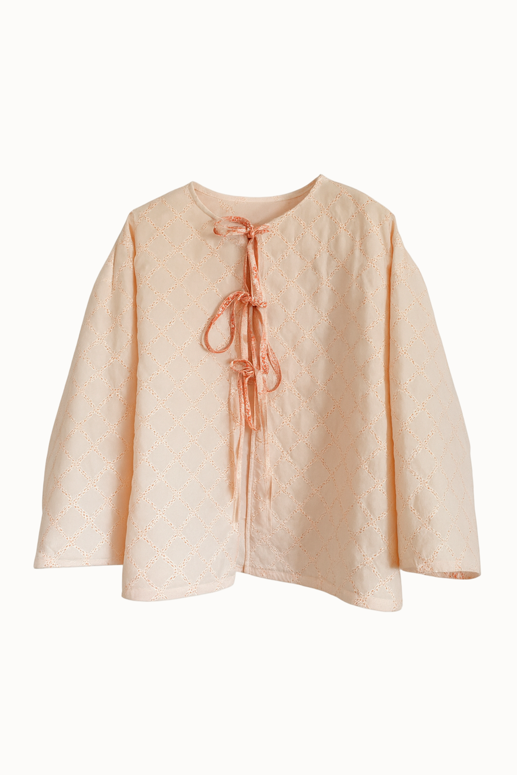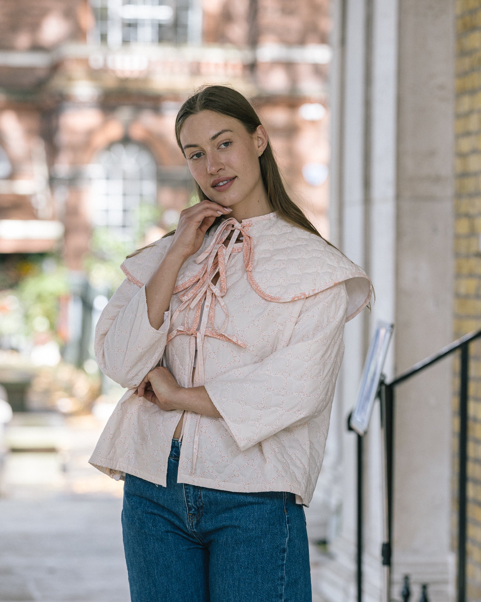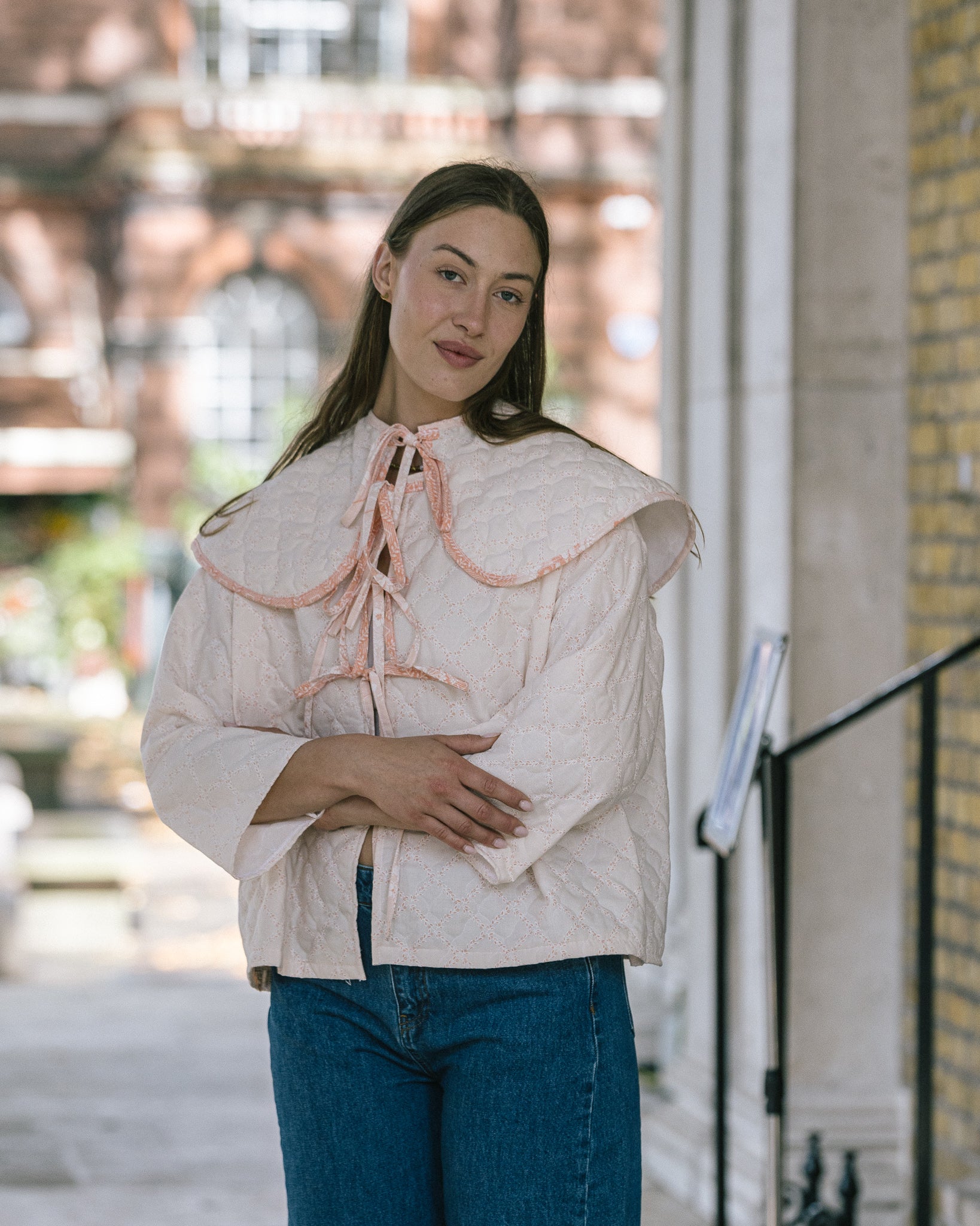 The Eleanor Jacket by Lydia Ellen is a boxy fit jacket reimagined from a vintage quilt. In a soft light apricot orange with a delicate white floral print, this piece blends comfort, sustainability and timeless design.