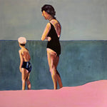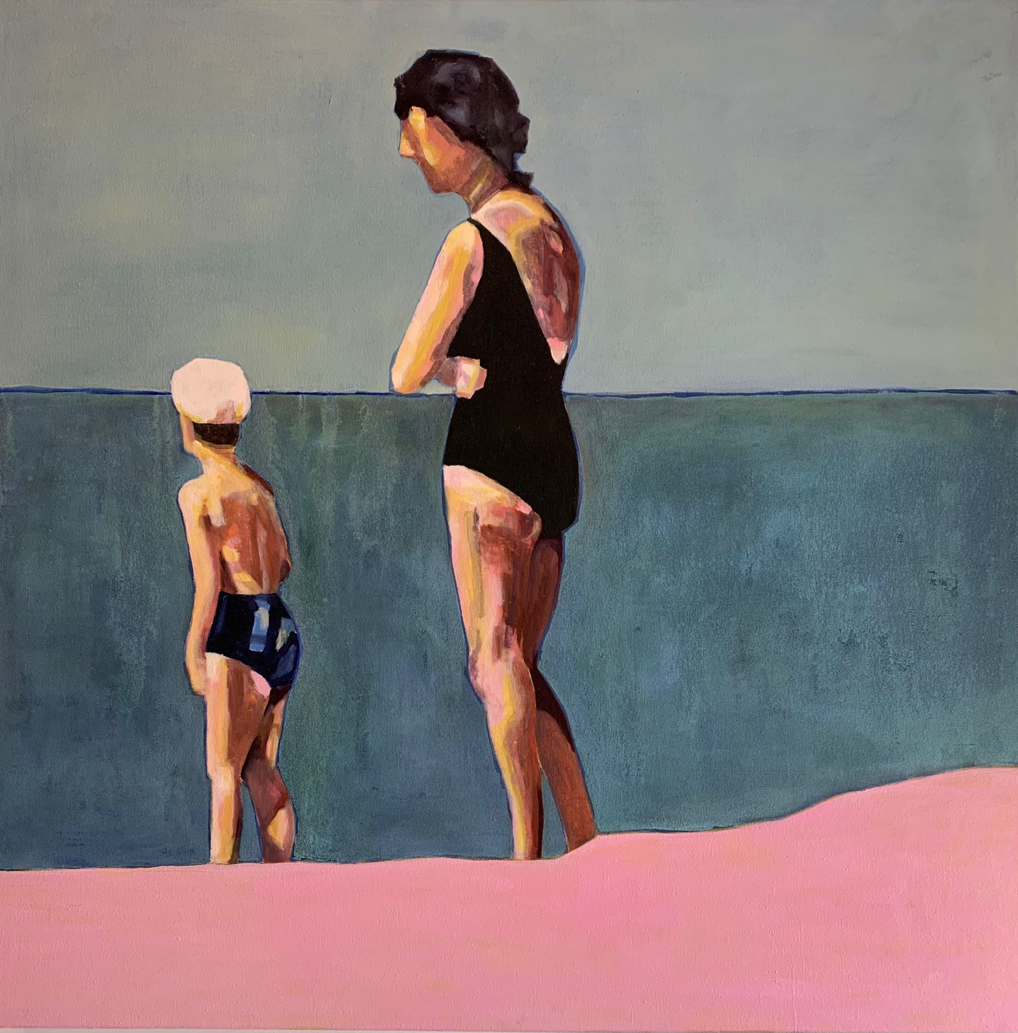 Land, sea and sky often offer a backdrop to anonymous figures, which are painted in a semi-abstract, expressive style. Bernie's work regularly features the English coastline, where the beach is symbolic of arrival or departure. Notions of home appear regularly as small totemic images of cottages and lighthouses as markers of security and comfort.