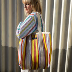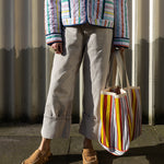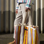 Colourful, conscious and crafted for everyday life - this oversized striped shopper by Raf and Grace is here to brighten your routine. Made from recycled plastic in a vibrant yellow, red and white stripe, it's designed for beach trips, market strolls, and everything in between.