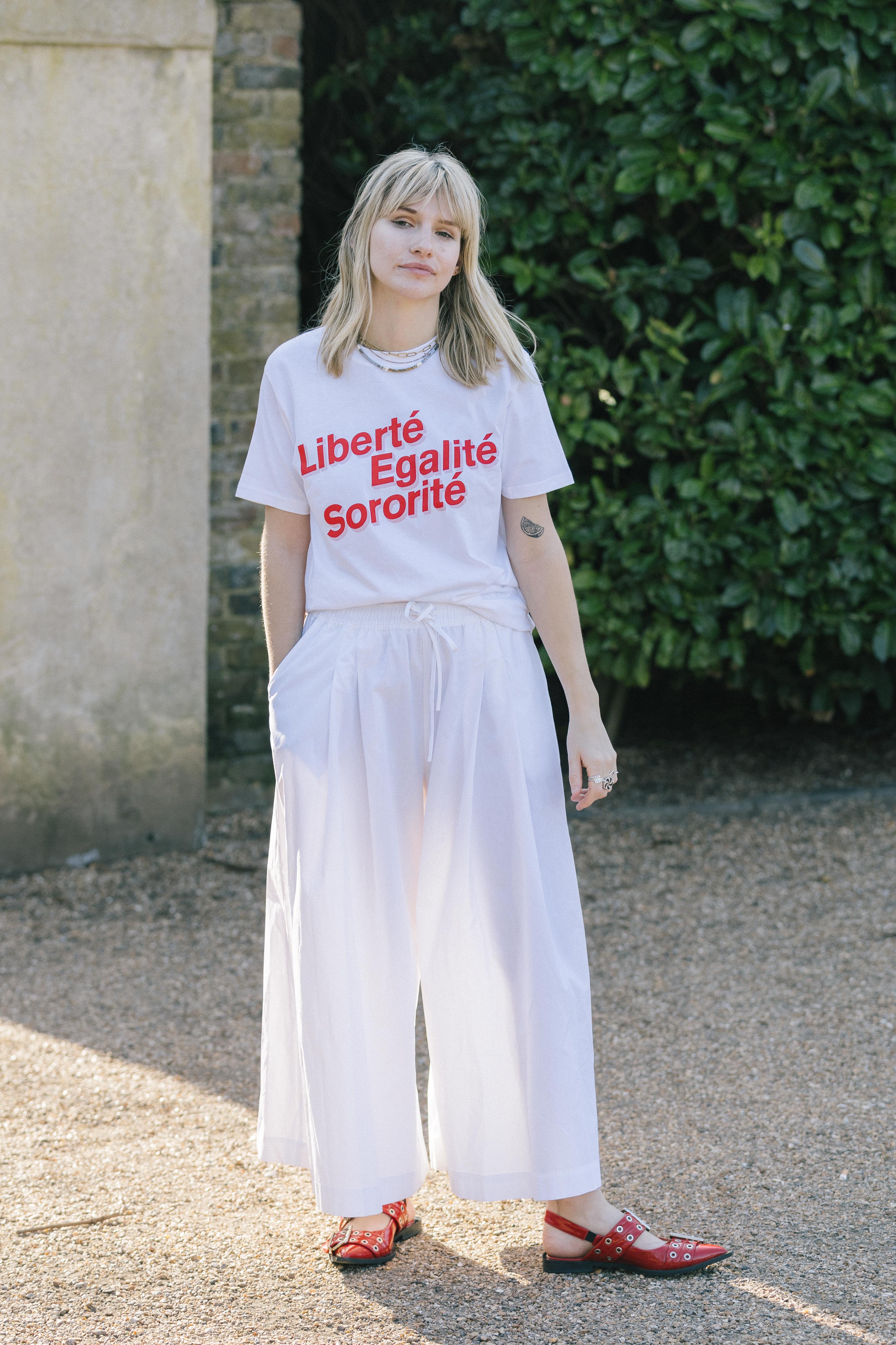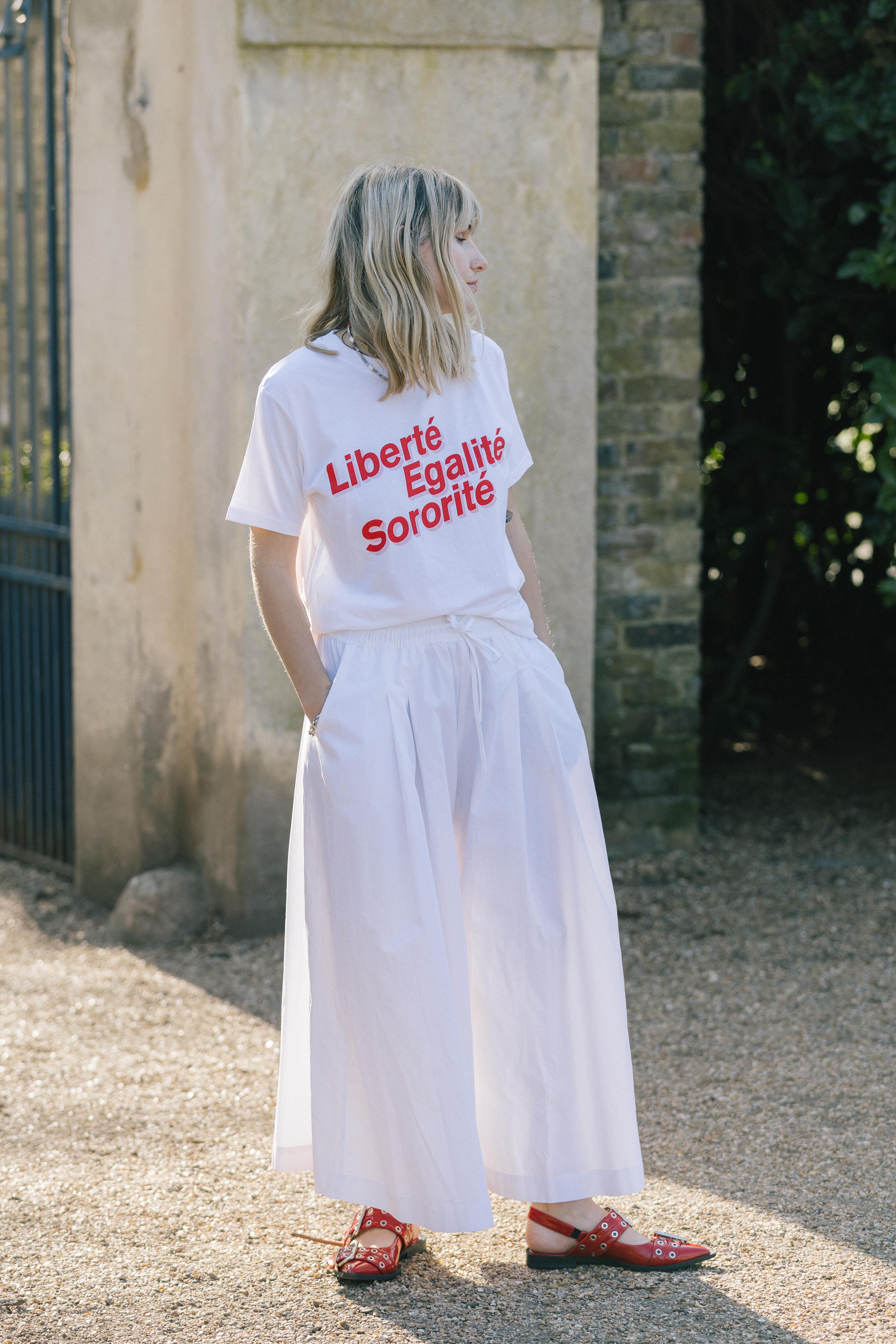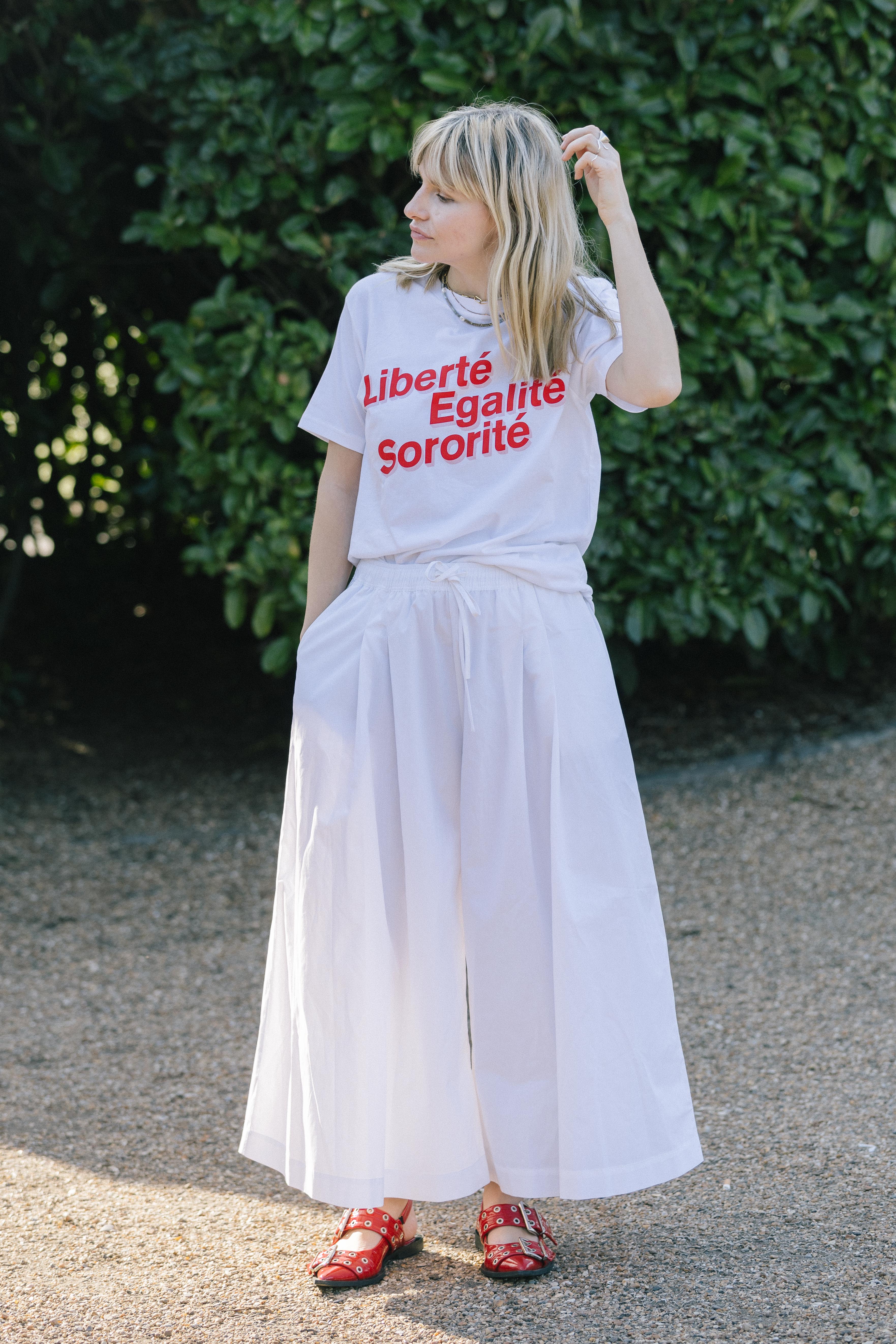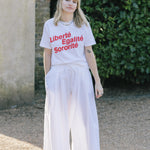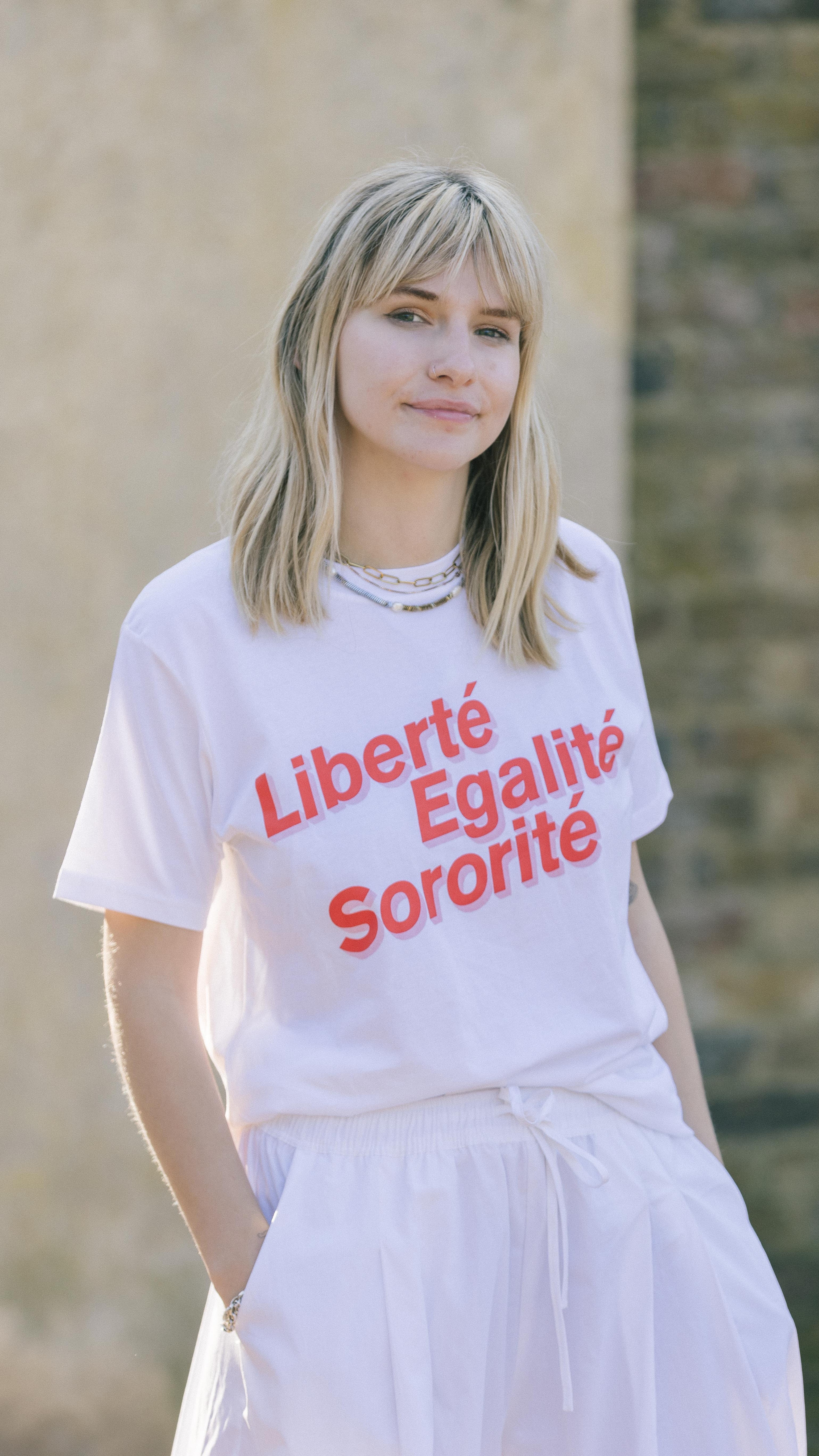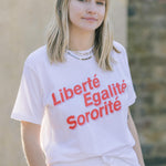 Featuring the phrase "Liberté Égalité Sororité," first adopted during the women’s liberation movement in 1970s Paris, this T-shirt carries a timeless message of solidarity and equality.
