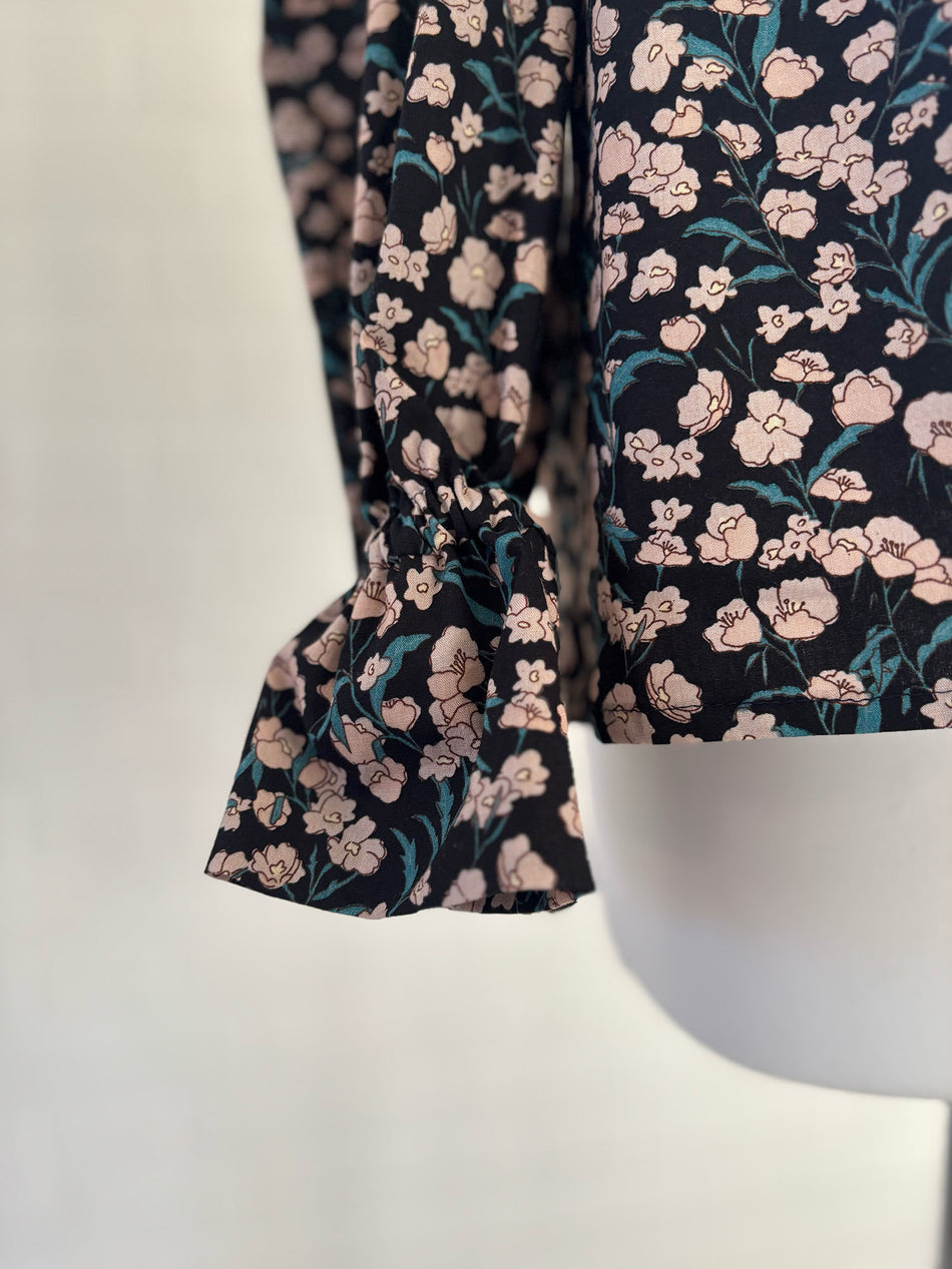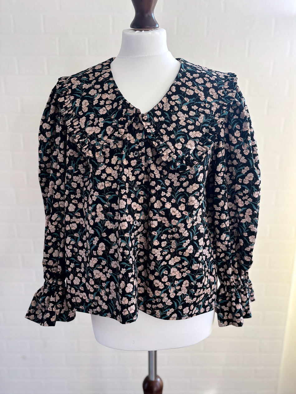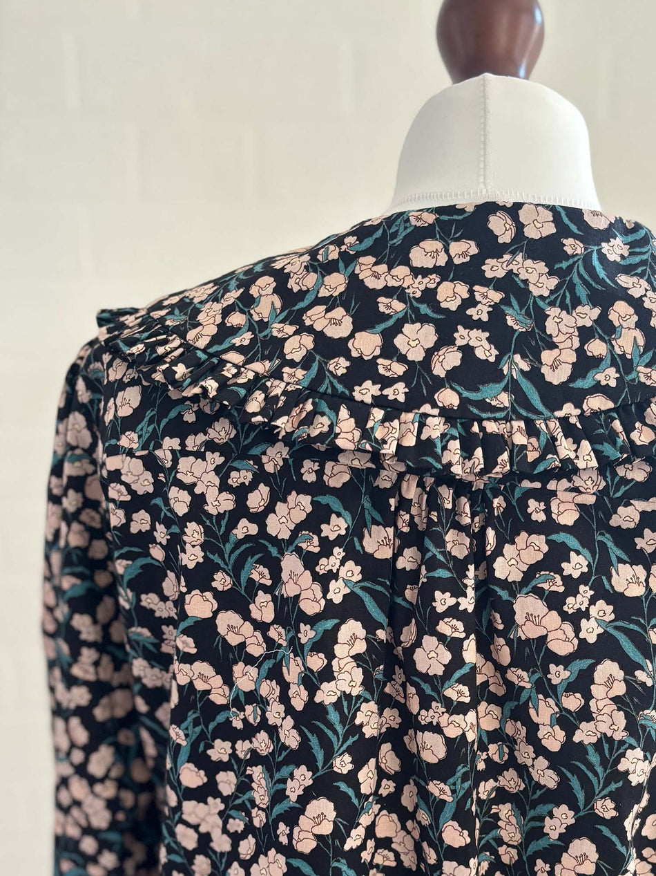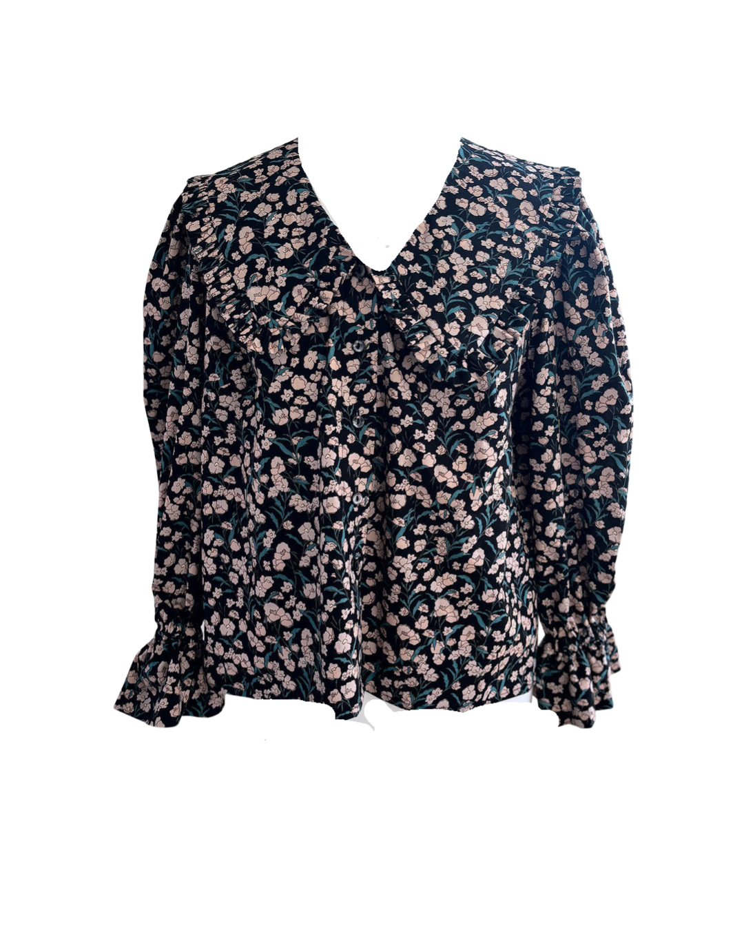 Designed with a statement oversized collar, vintage buttons and elasticated cuffs with bow ties, this blouse balances playful charm with thoughtful tailoring.