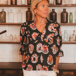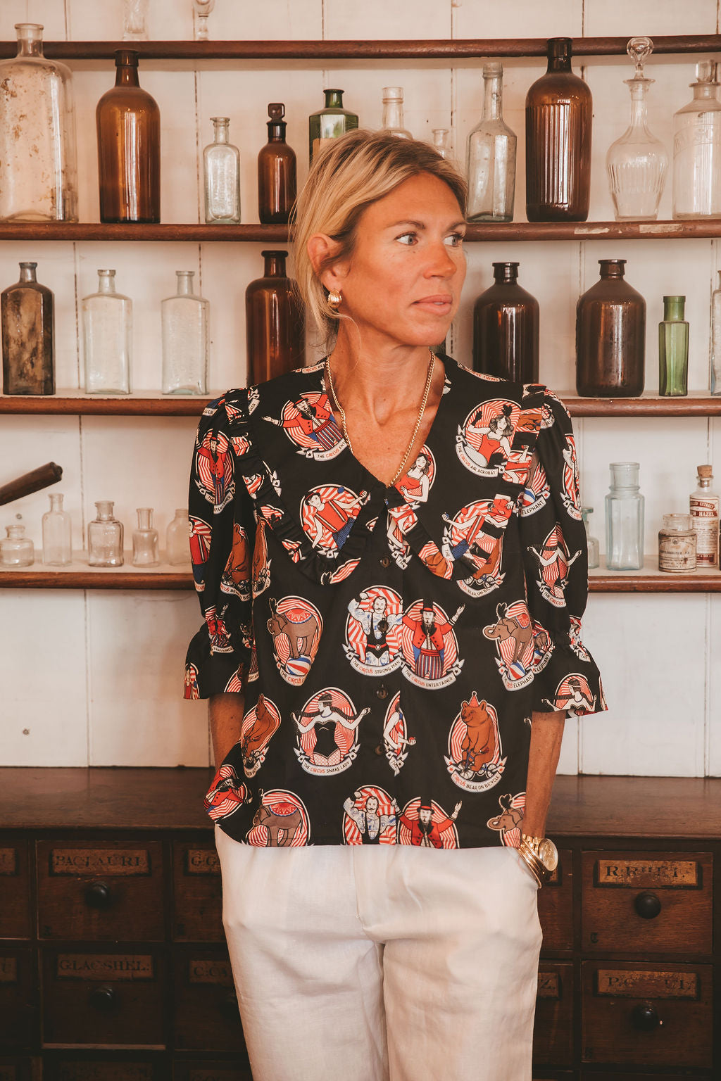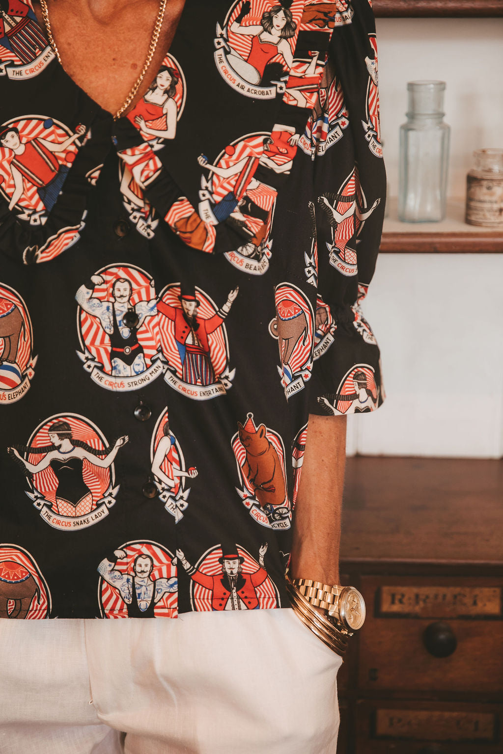 The Luna Circus Print Blouse, from The Well Worn. A joyful take on a timeless silhouette, reimagined in playful vintage circus print and crafted with care from sustainable deadstock fabric.