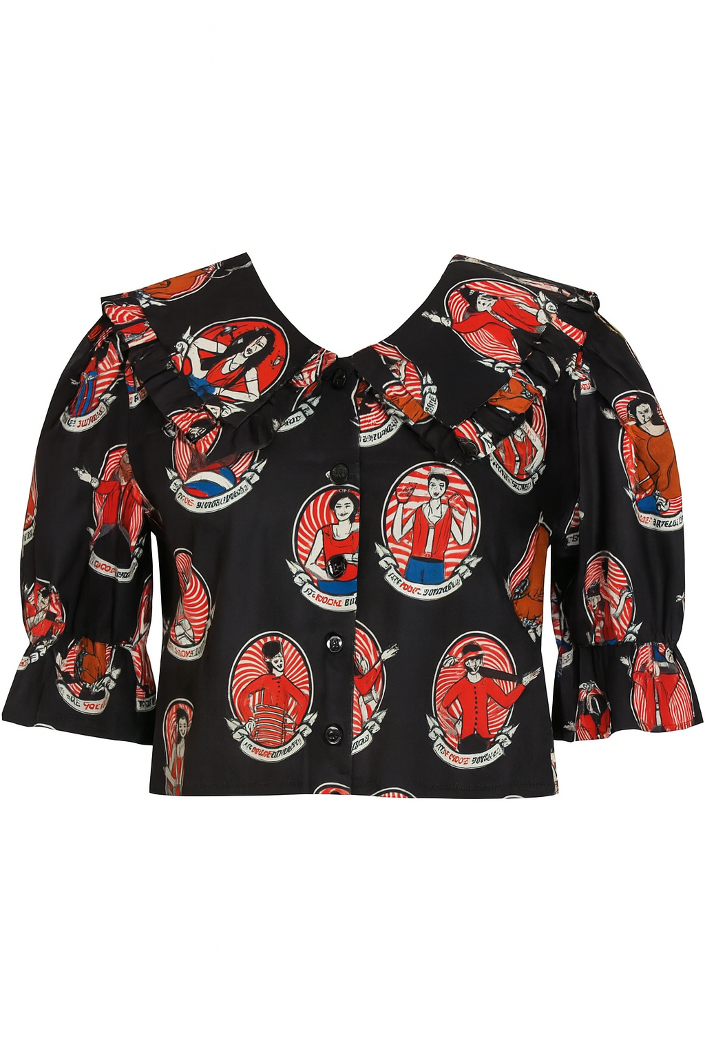 This standout blouse features an oversized ruffle collar, puff sleeves, and classic button fastening. The vintage-style circus print brings character and charm, while the breathable cotton keeps it effortlessly wearable season after season.