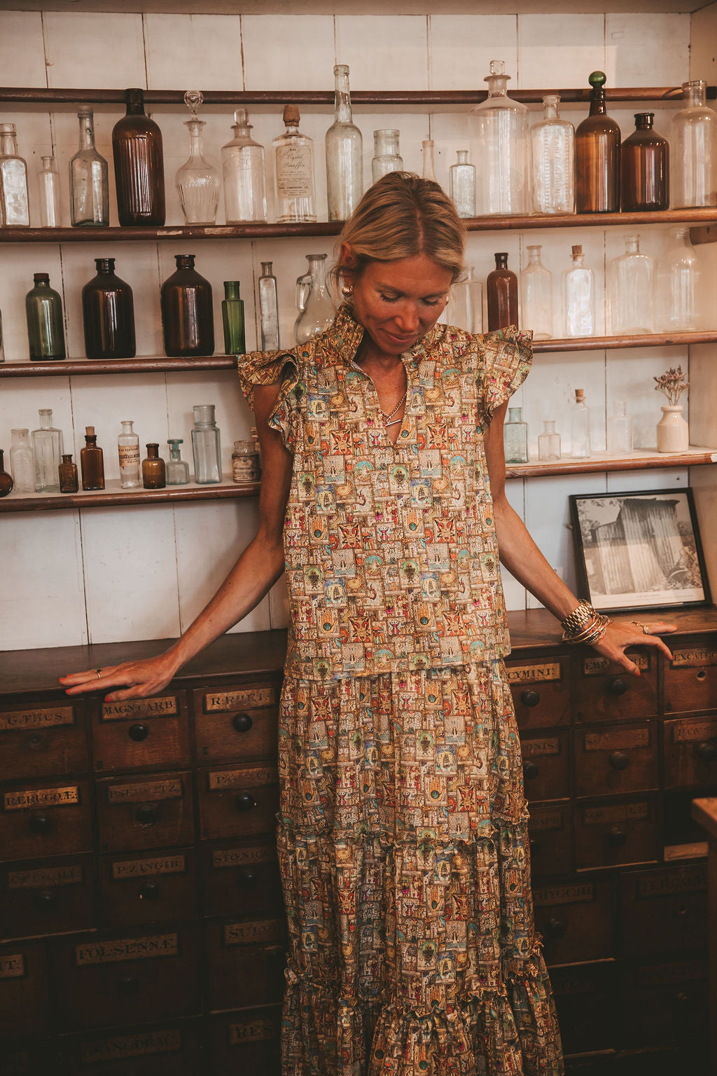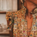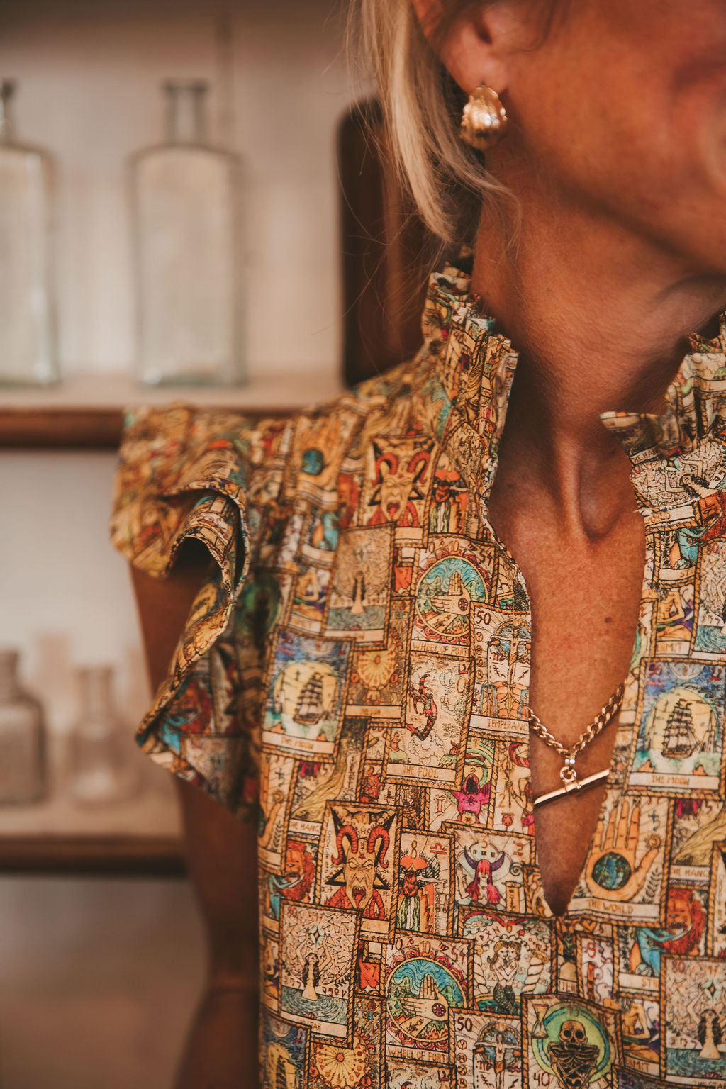 The Madison Tarot Print Top, from The Well Worn. A softly structured blouse in a mystical tarot card print, blending thoughtful design with everyday elegance.