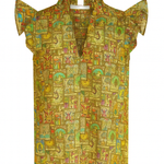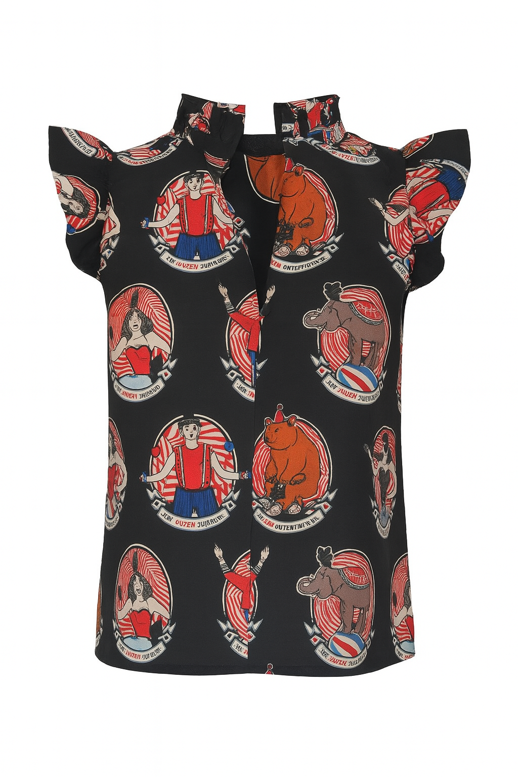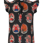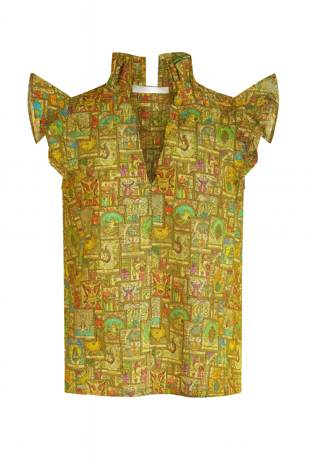 Made from breathable cotton in a richly detailed tarot motif, this top features a soft stand collar with ruffled trim, a subtle V-neckline, and flutter sleeves. The vintage-style print adds character and charm to this classic silhouette, perfect for dressing up or down.