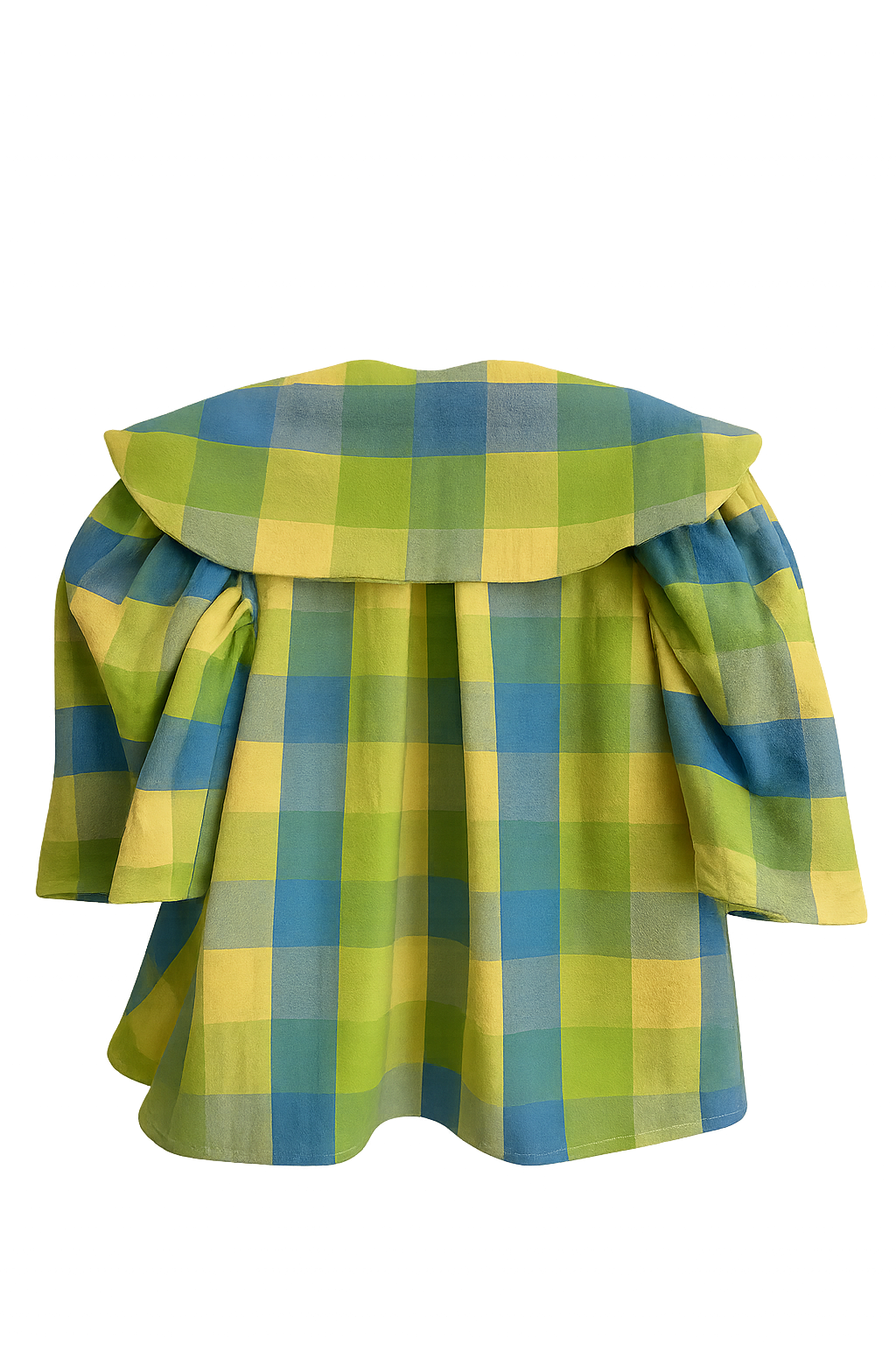 Crafted from repurposed brushed cotton bedding, this blouse blends softness with durability. The vibrant blue, yellow, and green check brings a fresh, eye-catching twist to a timeless silhouette.