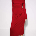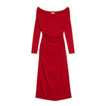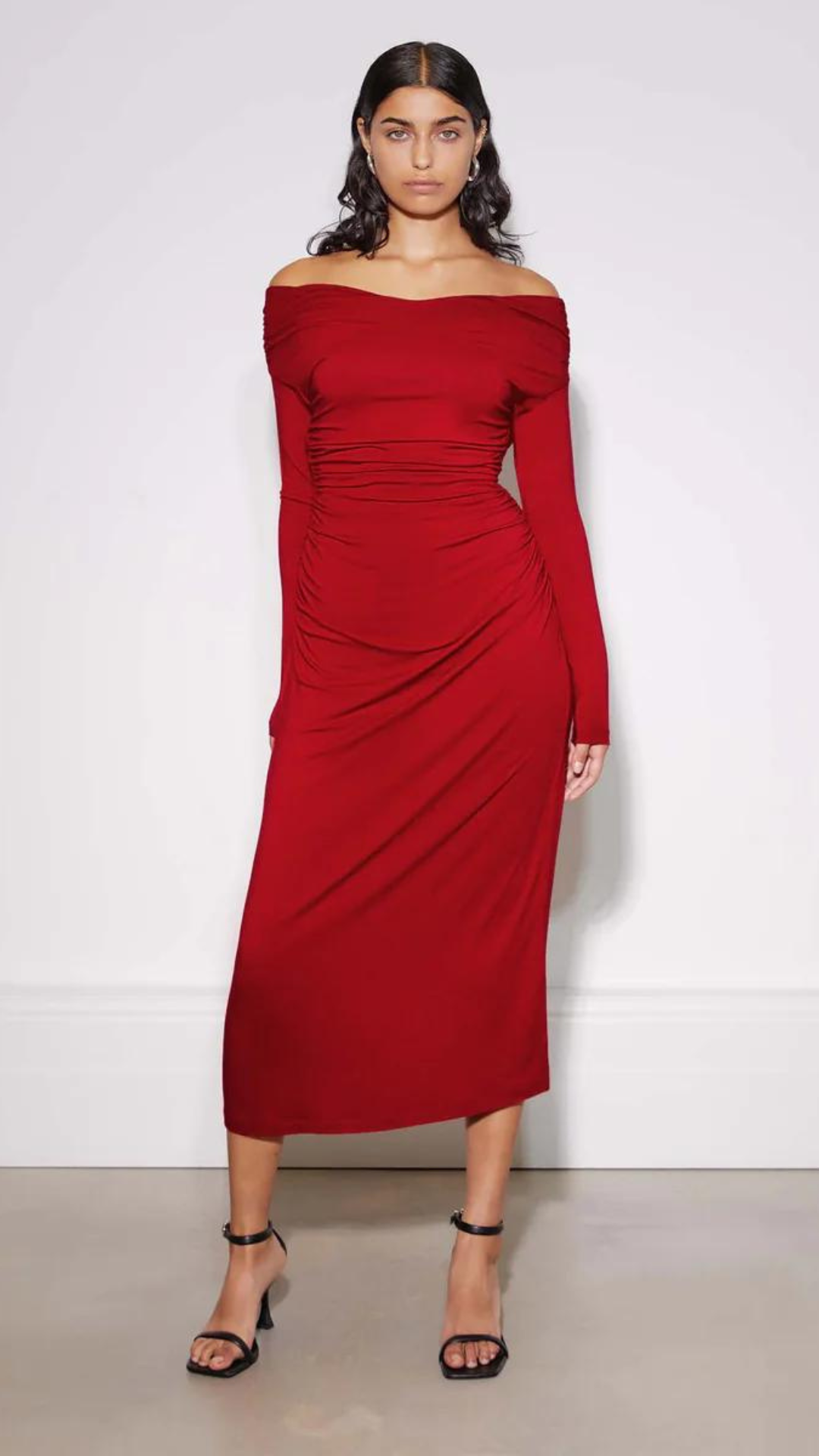Outlet stock, exchange only. A fitted jersey midi dress cut with a flattering ruched off-the-shoulder neckline and ruched waist.