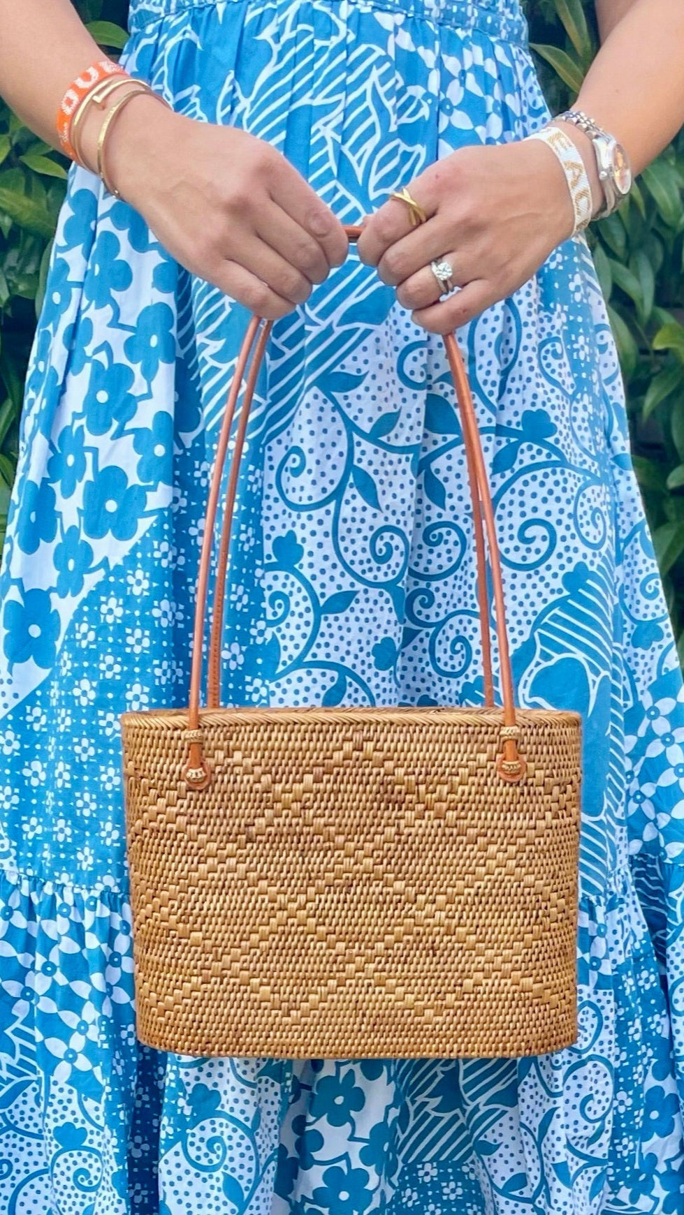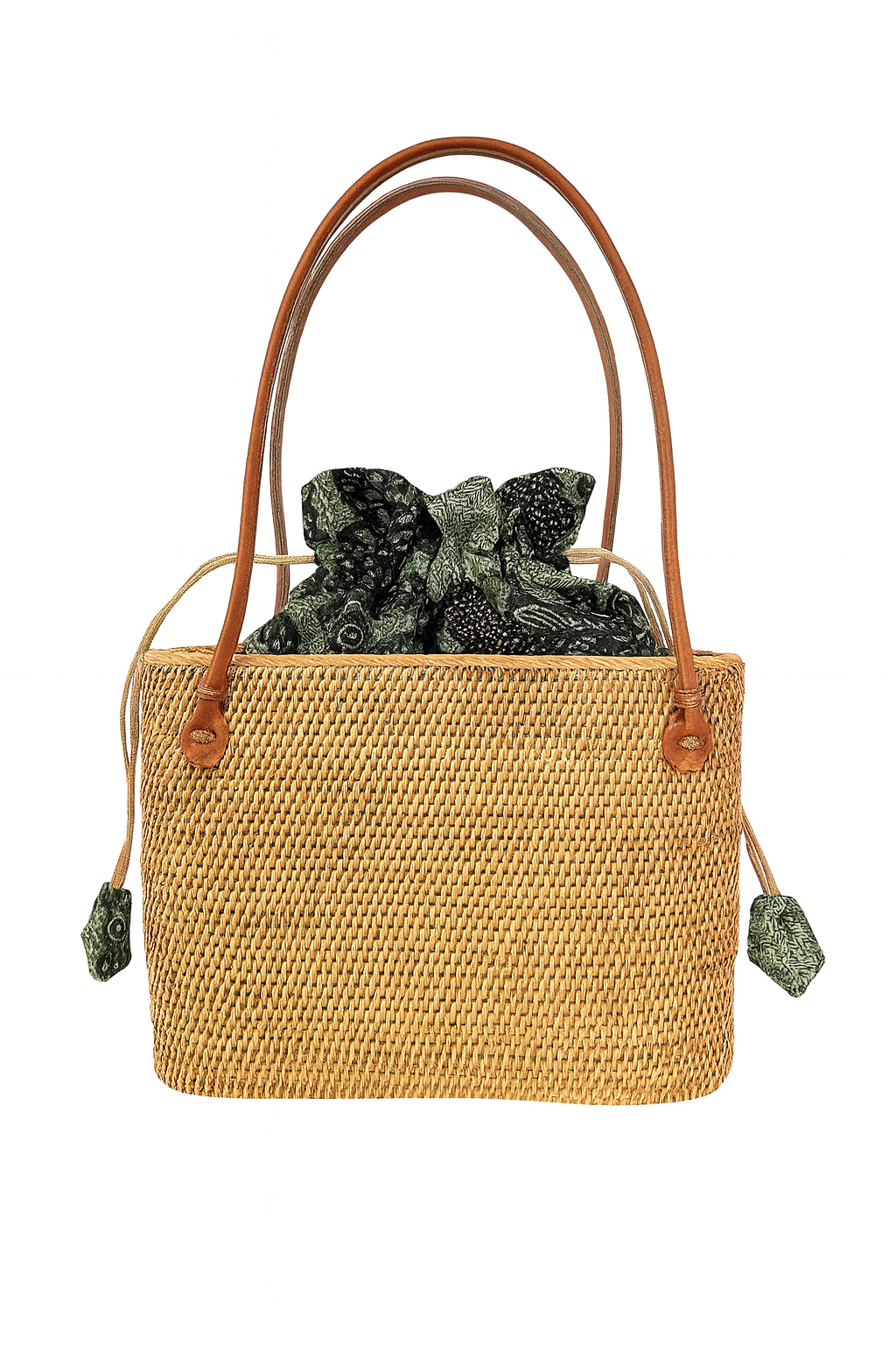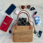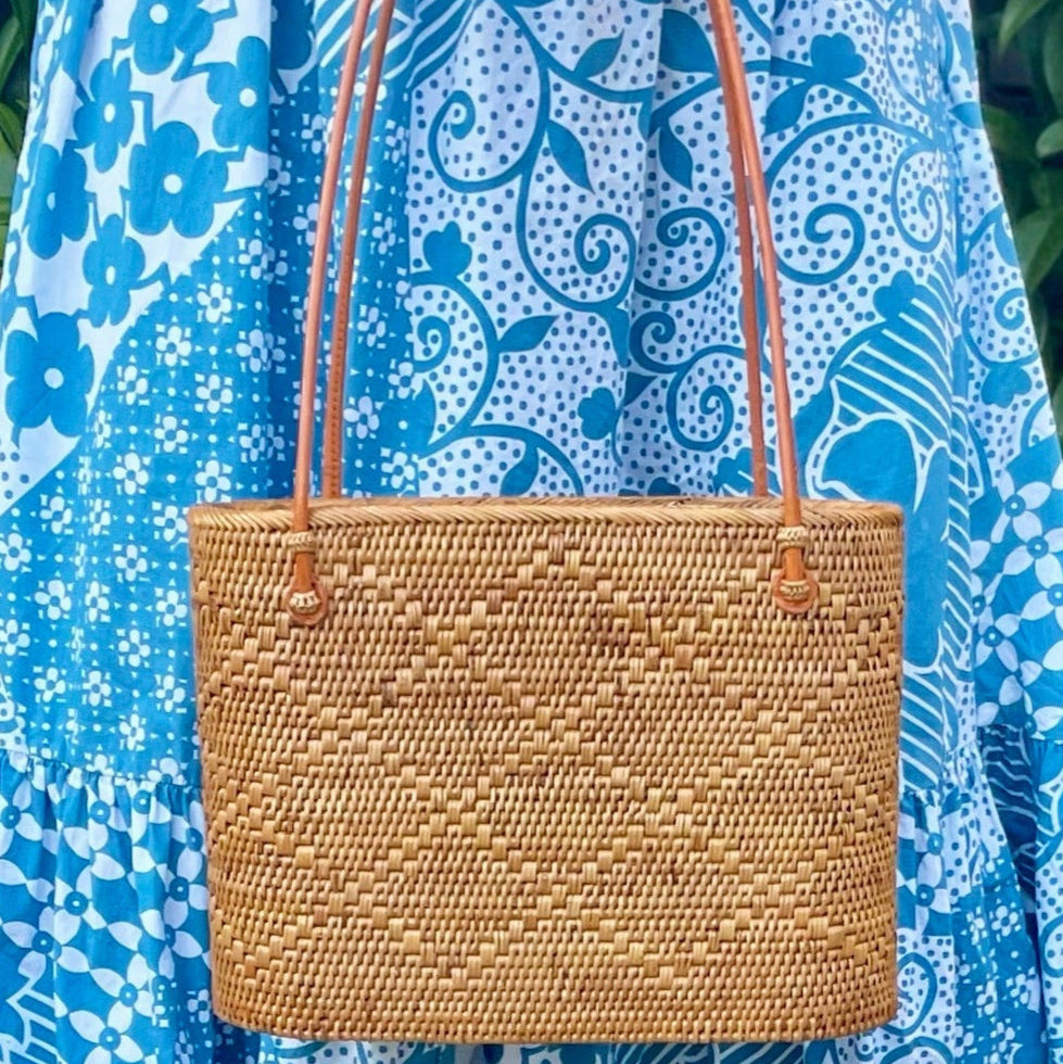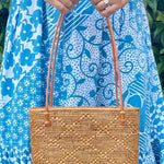 The Medium Ata Bag by Arifah Studio is a versatile and easy-to-wear bag that will effortlessly transition from city to beach. Hand-woven by women artisans using natural ata grass from Bali, it is strong, durable, and water-resistant. The bag's cotton batik lining and leather handles and clasps add to its stylish and functional design. With a generous size and dimensions of H: 20cm, W:33cm, D:10cm, it can hold all your essentials.