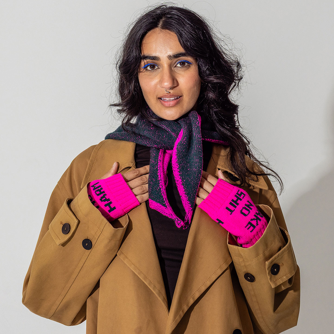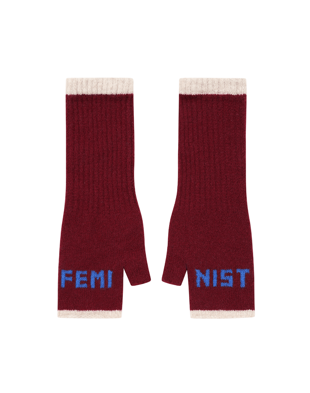 Feminist Fingerless Mittens in Claret & Klein