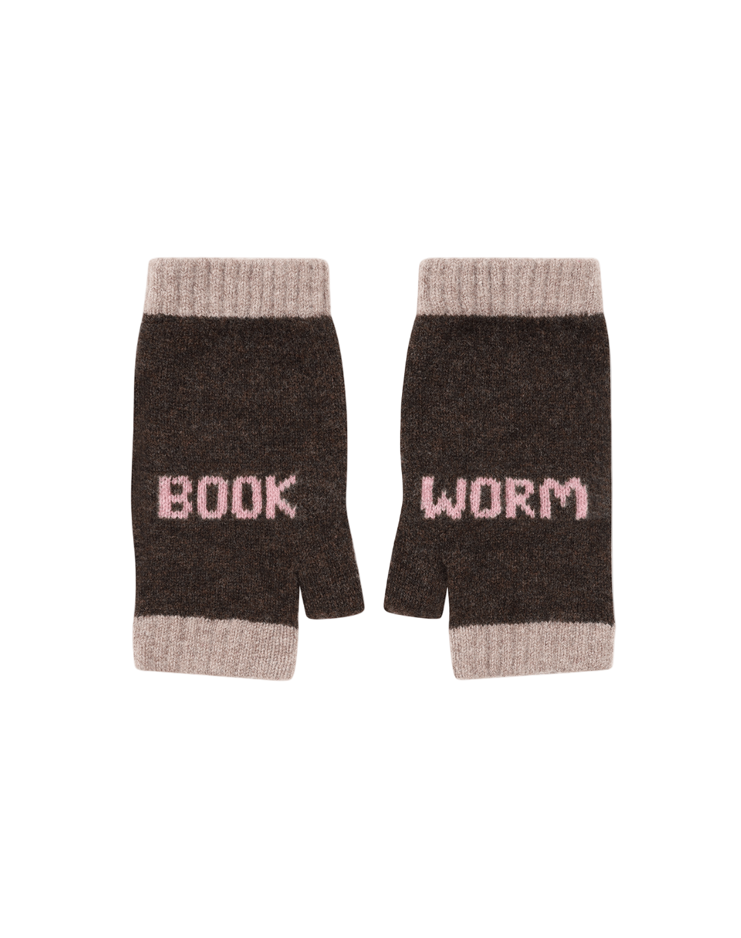 Featuring the "Book Worm" slogan in warm cocoa and pale calamine tones, these mittens blend literary wit with everyday functionality.