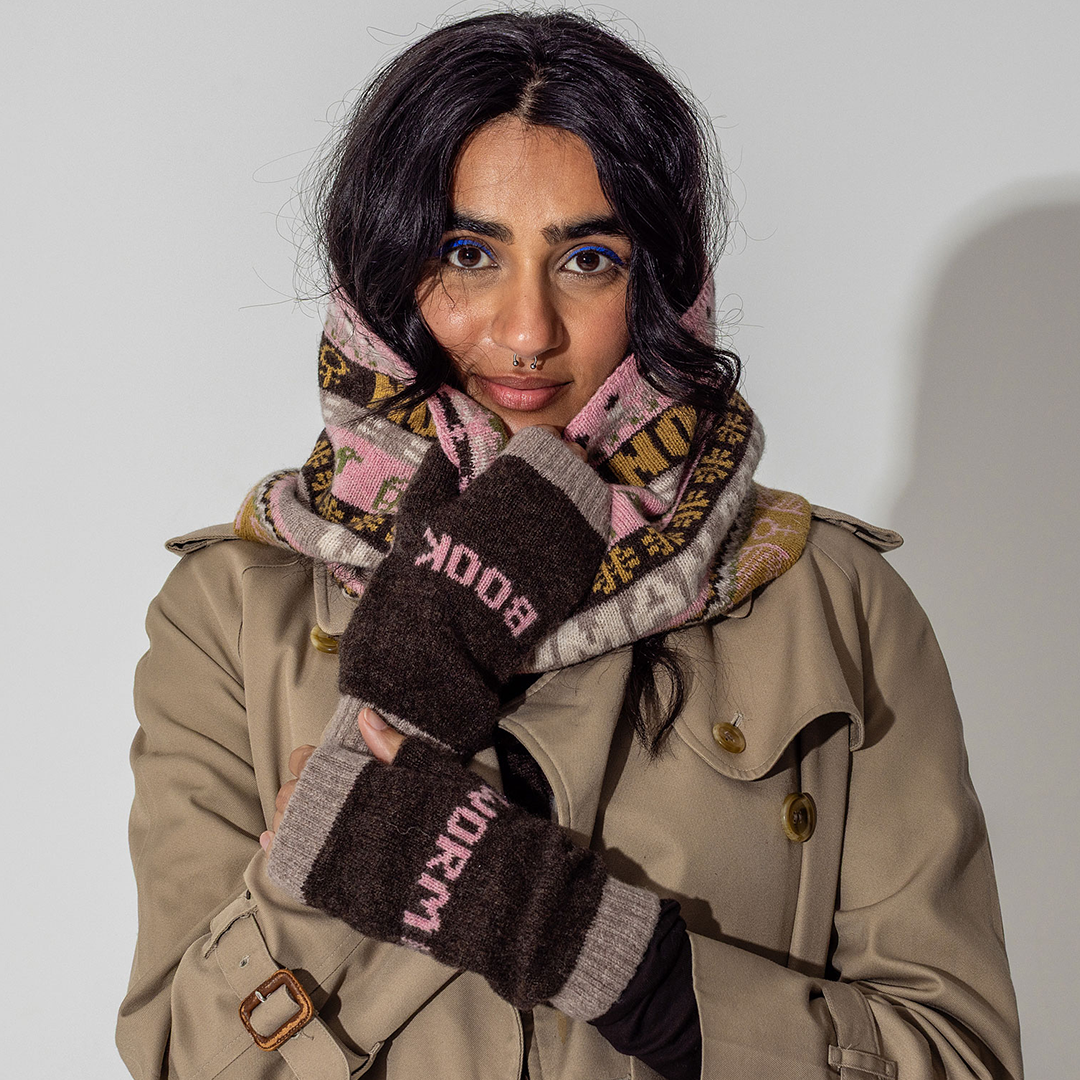The Book Worm Mittens in Cocoa & Calamine by Black & Beech are soft, statement-making accessories for thoughtful readers. Knitted in Scotland from fine merino lambswool, they're cosy, practical, and beautifully made.