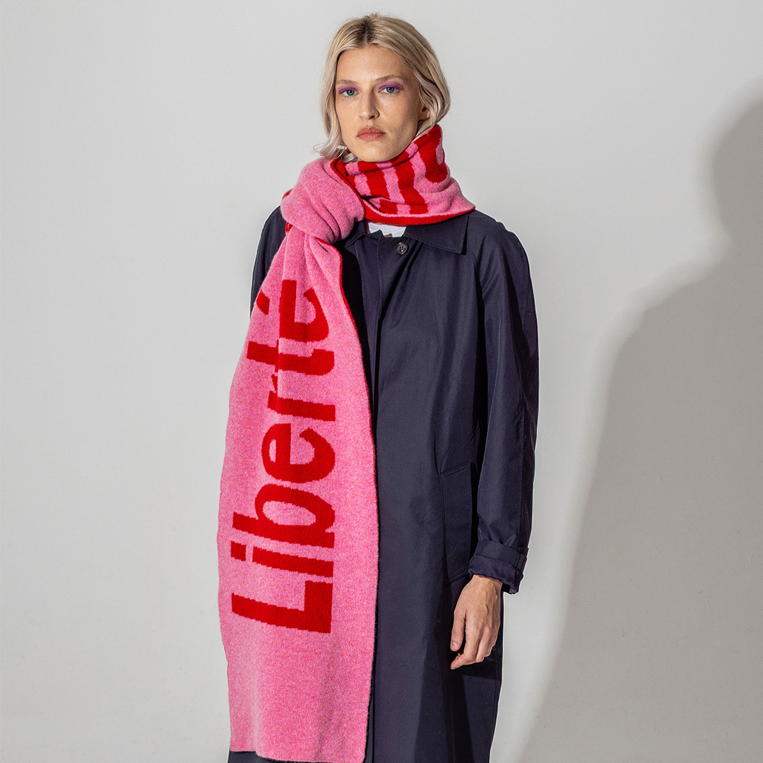 Liberté Egalité Sororité Lambswool Feminist Slogan Scarf in French Rose & Rouge Scarves Black & Beech