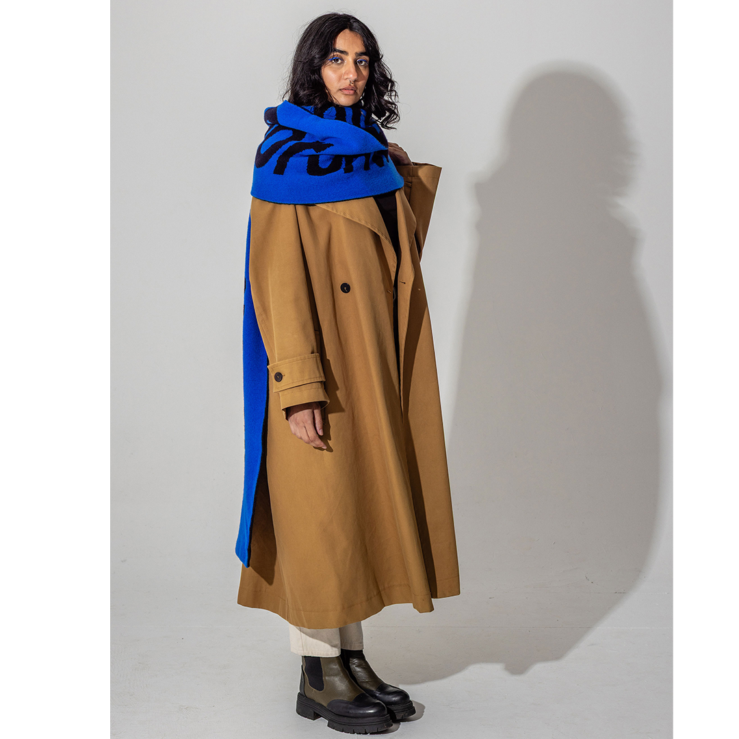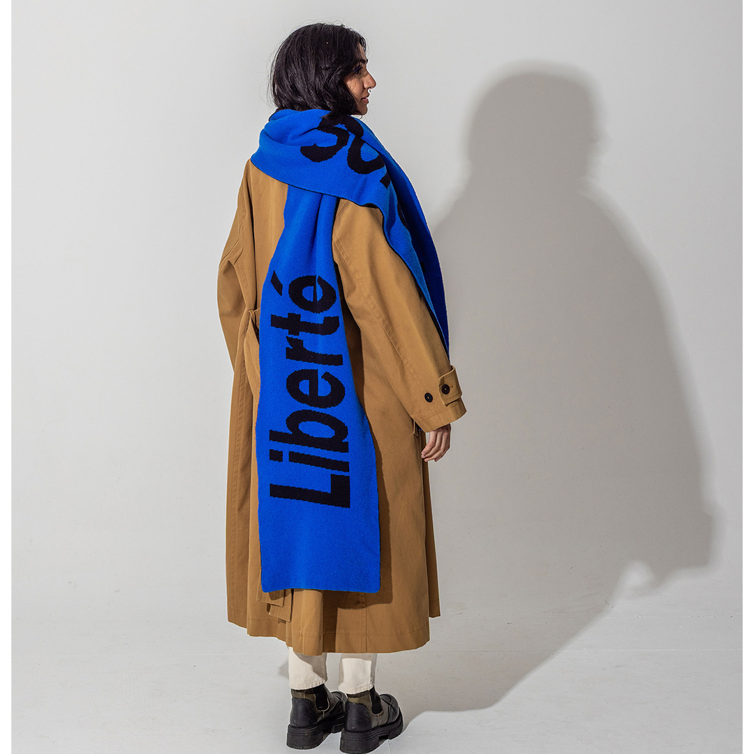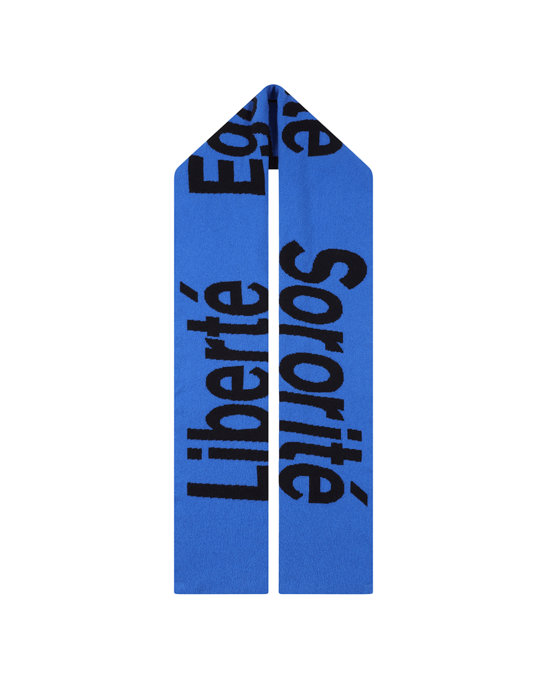 The Liberte, Egalite, Sororite Lambswool Scarf in Klein & Navy by Black & Beech combines striking slogan design with luxurious warmth. Knitted in Scotland from 100% merino lambswool, it's a bold, empowering piece of modern knitwear.