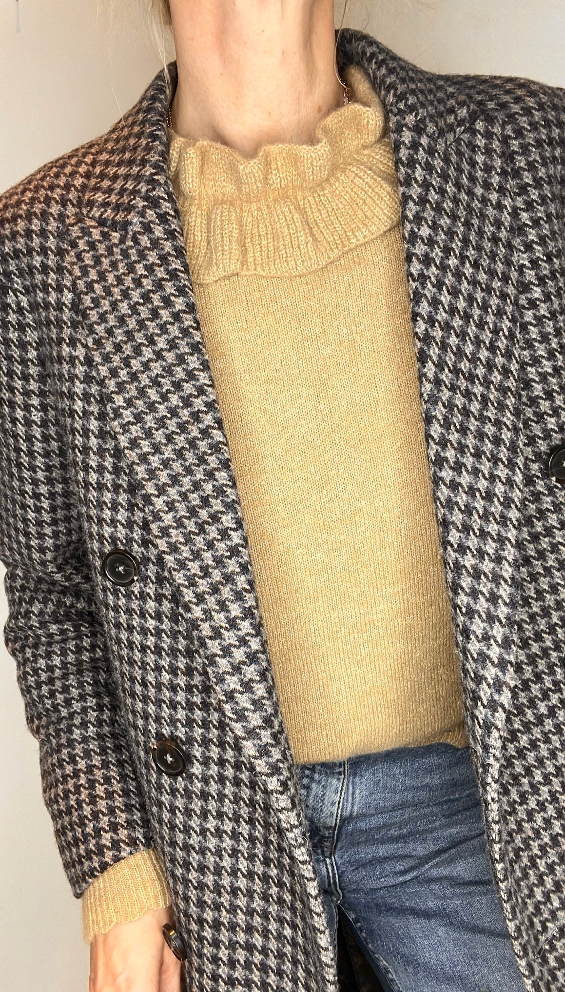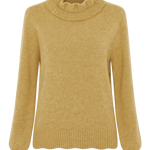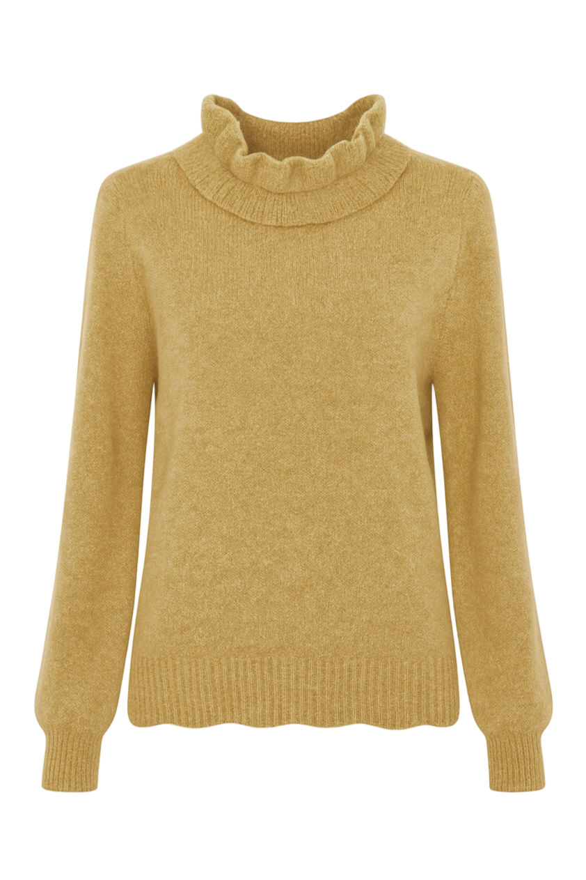 A ribbed frill collar frames the neckline beautifully, adding a soft romantic touch to an otherwise simple silhouette. Ribbed cuffs and hem complete the look with gentle shaping.
