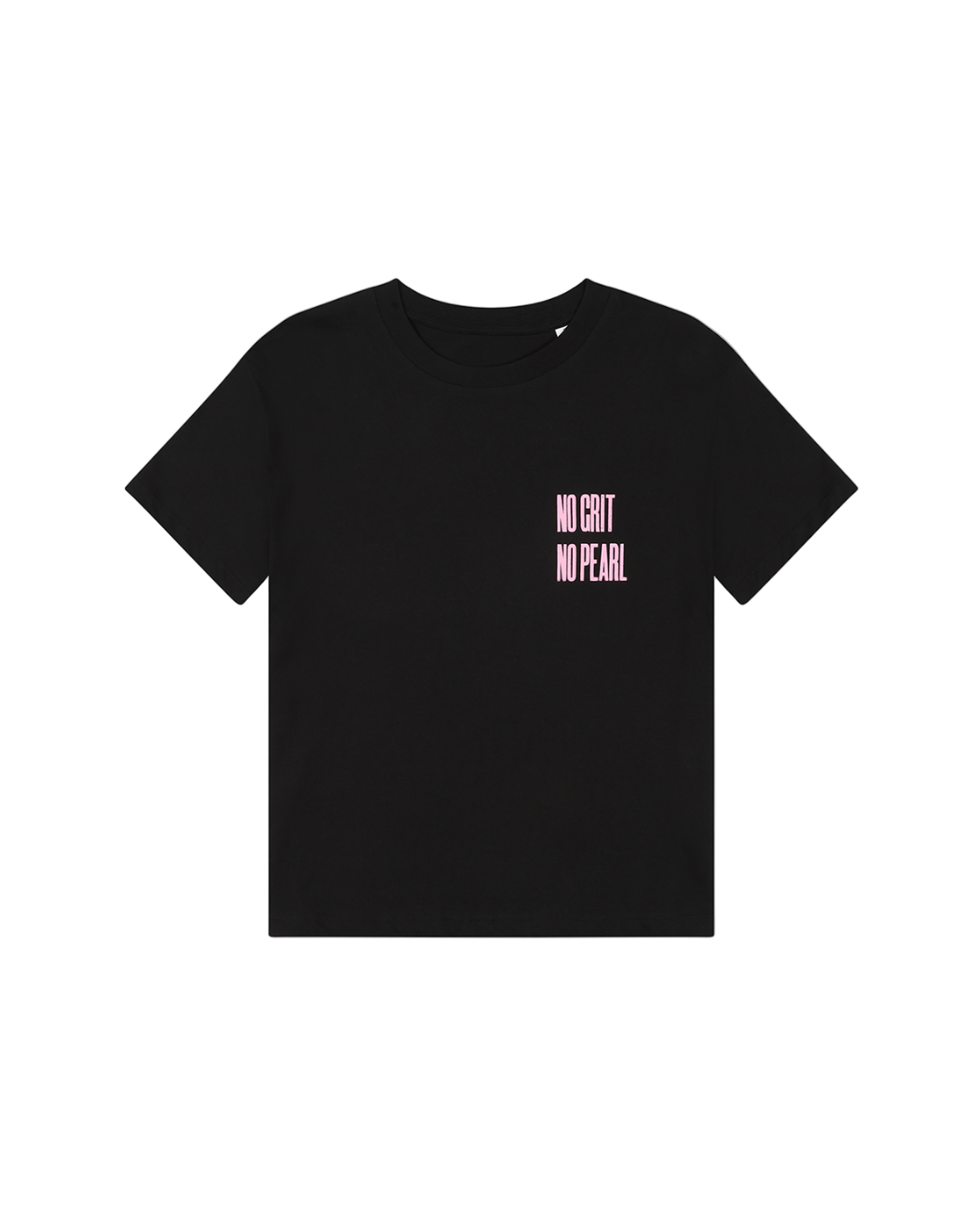 The "No Grit No Pearl" Organic Cotton T-Shirt by Black & Beech in classic black. A powerful reminder that beauty and resilience are born from challenge.