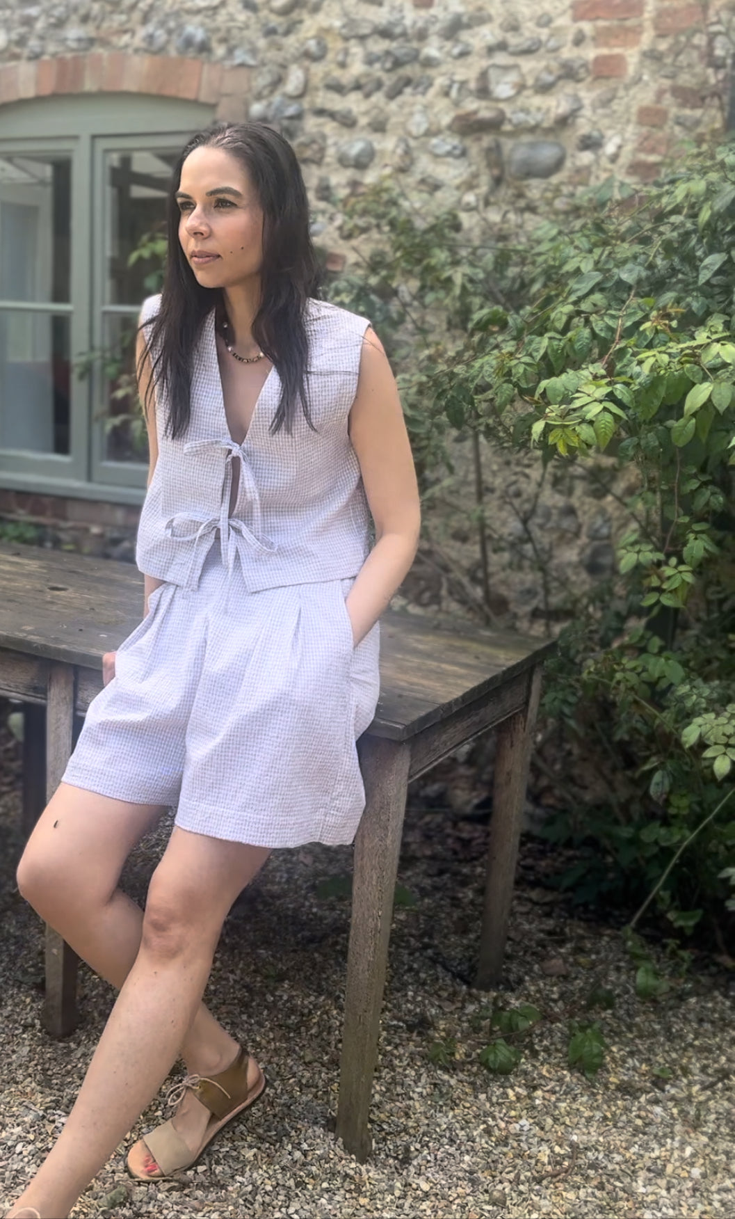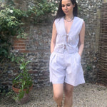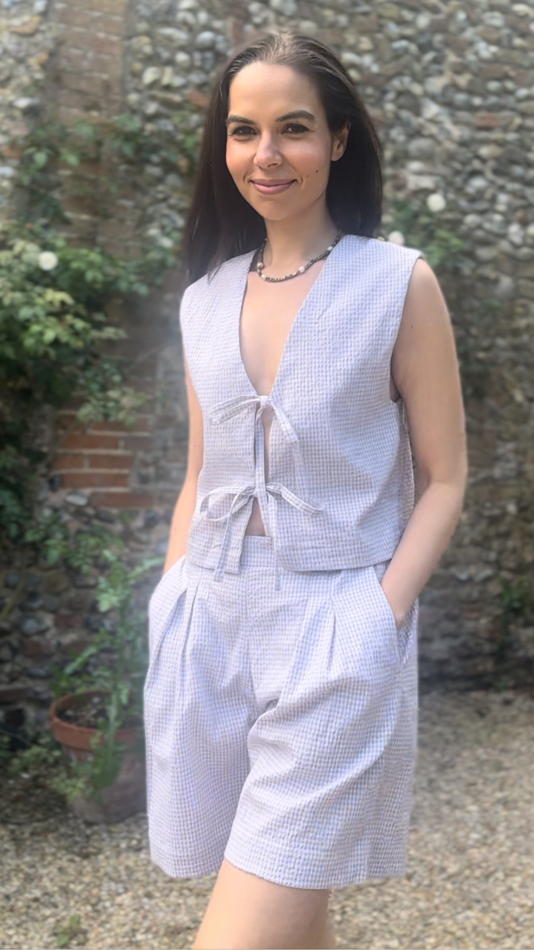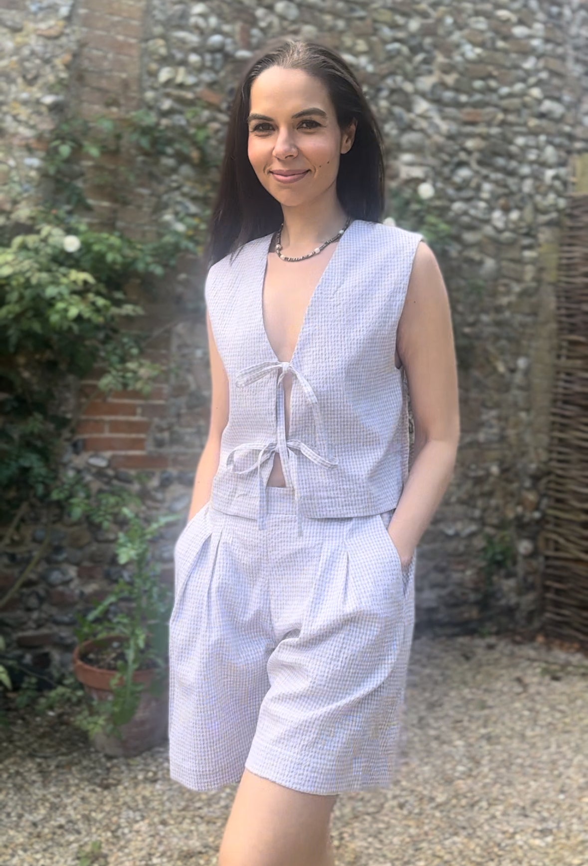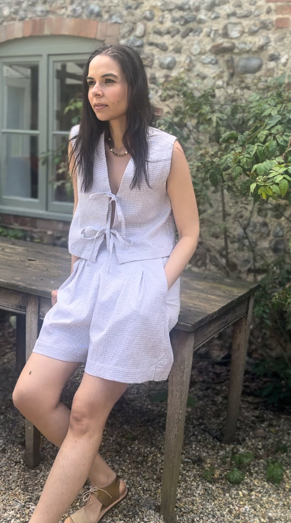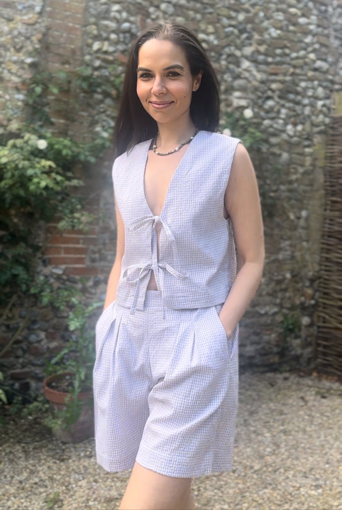 The Gracie Mushroom Gingham Bow Vest is handmade in London from deadstock earthy gingham seersucker fabric. This versatile tie front top makes a great layering piece or can be worn on its own as a beautiful high summer top.