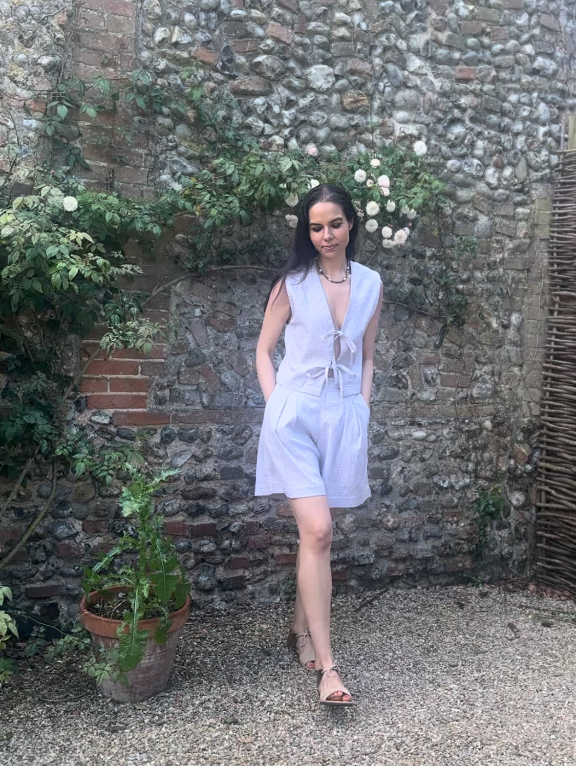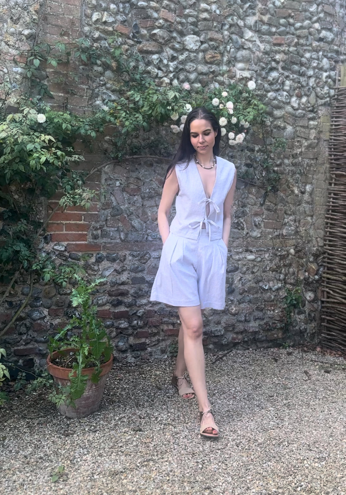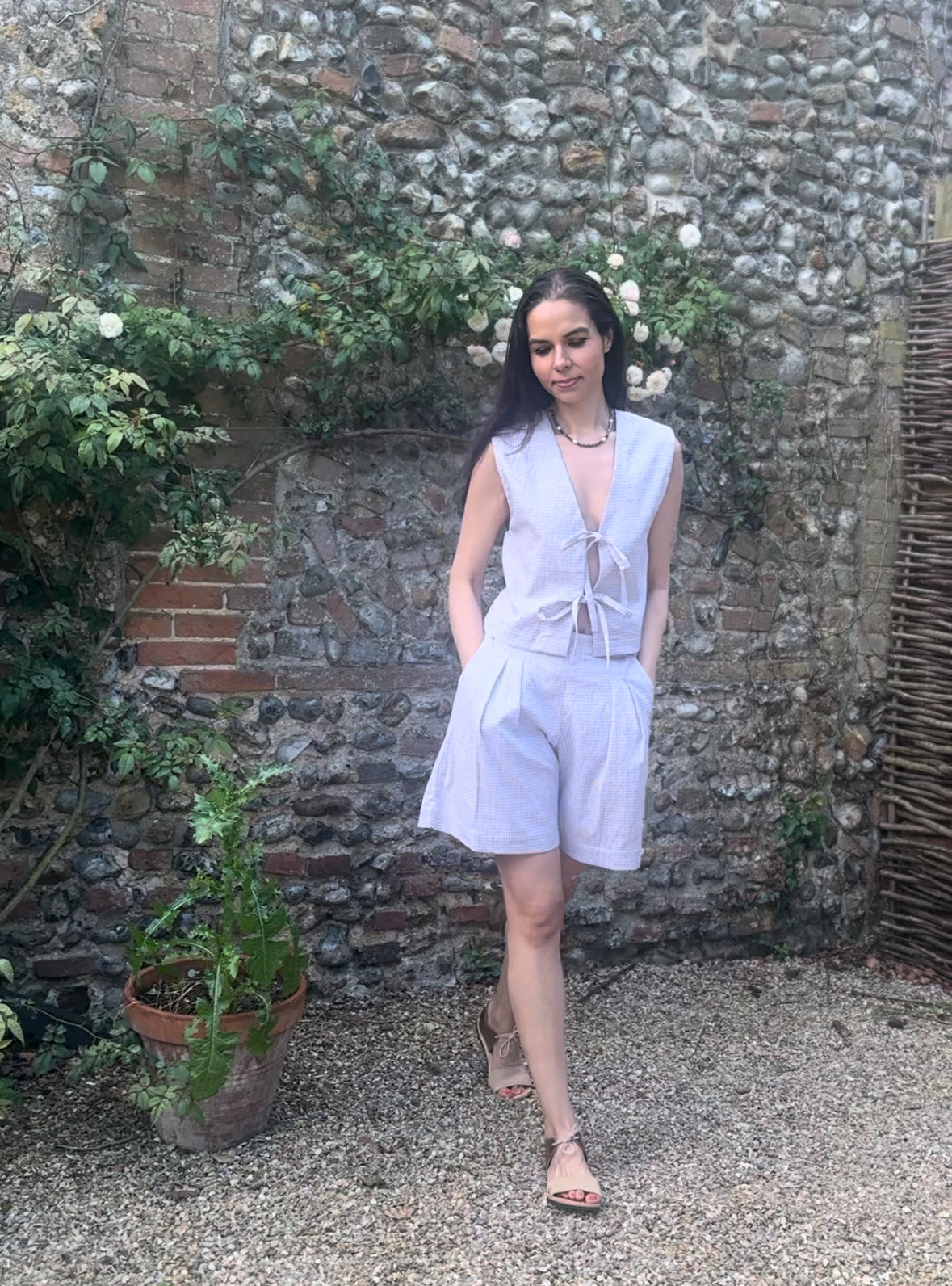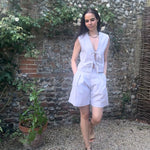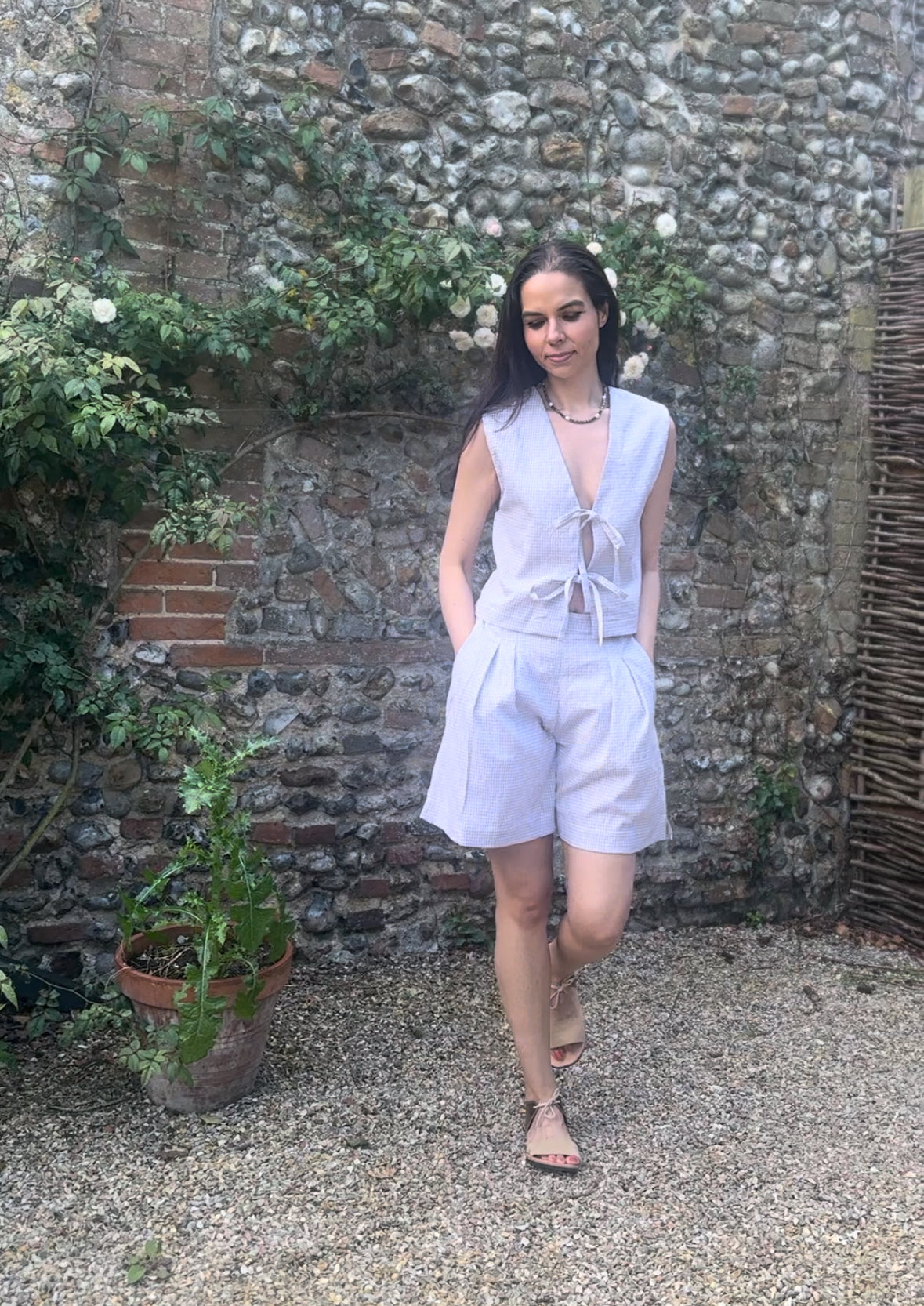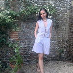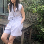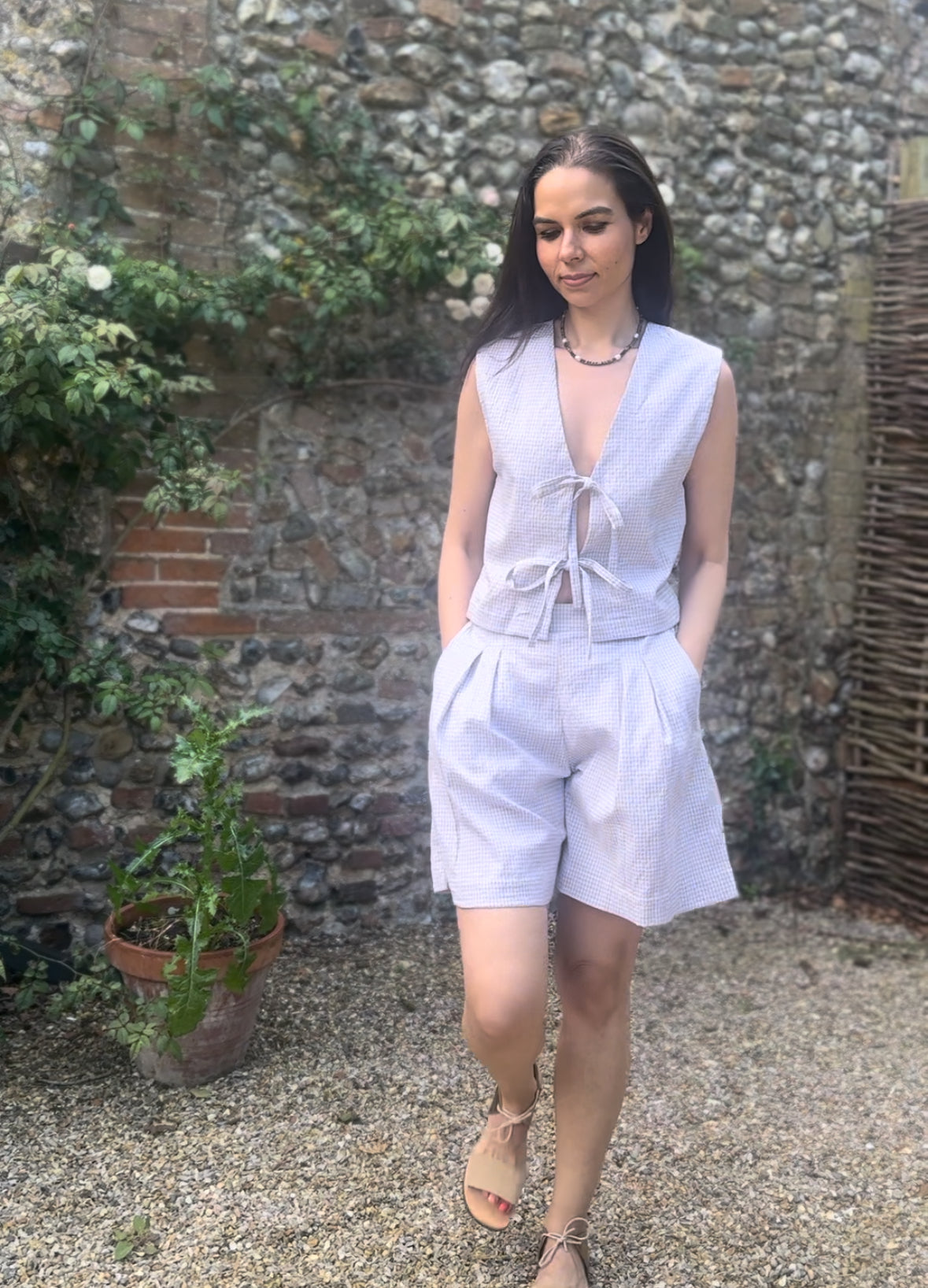 The Gracie Mushroom Gingham Bow Vest is handmade in London from deadstock earthy gingham seersucker fabric. This versatile tie front top makes a great layering piece or can be worn on its own as a beautiful high summer top.