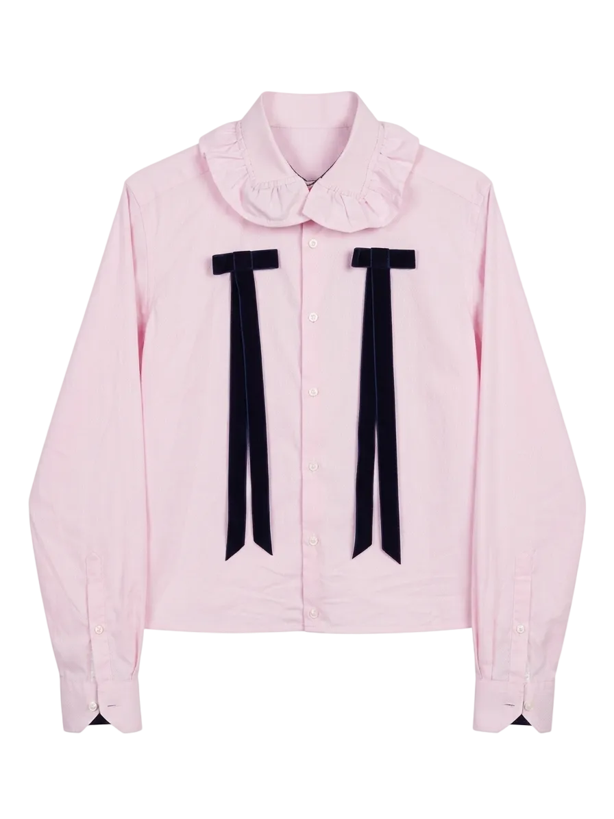 This Pink Cotton Shirt with Navy Bows is an upcycled cotton shirt designed to bring playful detail to everyday dressing. Reworked from a men’s shirt, it features a soft frill collar and statement navy bow ties for a distinctive, feminine finish. Crafted from 100% cotton, this upcycled shirt is a unique piece that adds personality and charm to simple outfits.