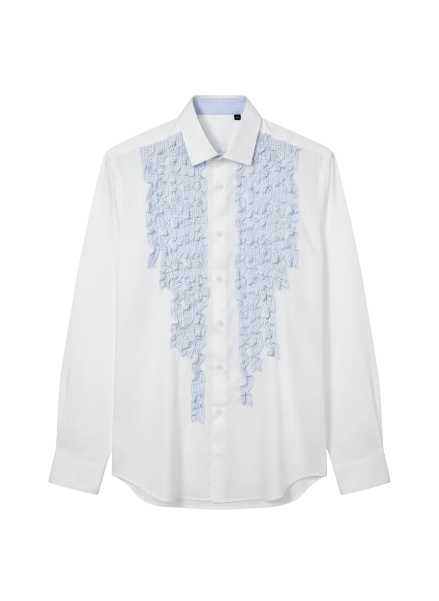 This ruffle shirt reimagines classic tailoring with playful texture. Designed with cascading ruffles through the front, it adds softness and character to a timeless button-down silhouette. The crisp cotton structure keeps the look polished, while the statement frill detailing makes it perfect for styling with tailoring or denim.