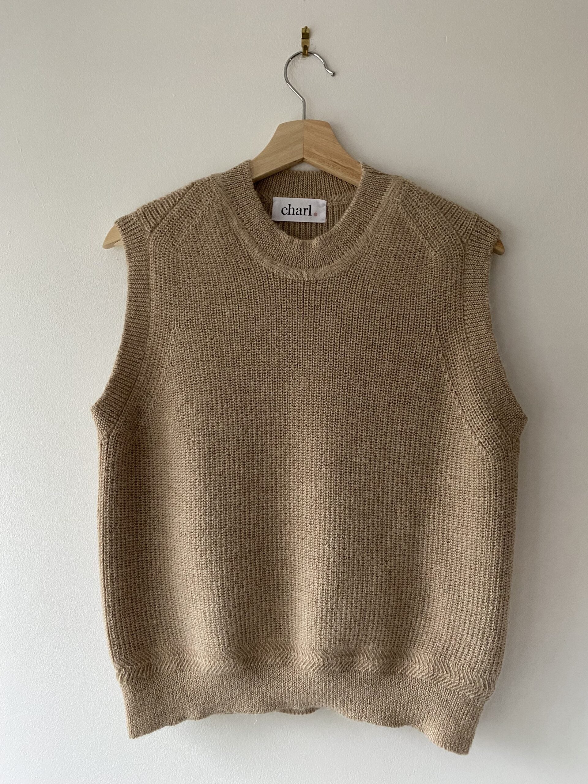 The Salter Vest in Almond by Charl expertly blends traditional Italian knitting expertise with beloved Norfolk heritage stitch patterns. Lovingly produced in Italy, this exceptional tank top is knit from the softest Peruvian Alpaca yarn that provides both comfort and elegance for your wardrobe.