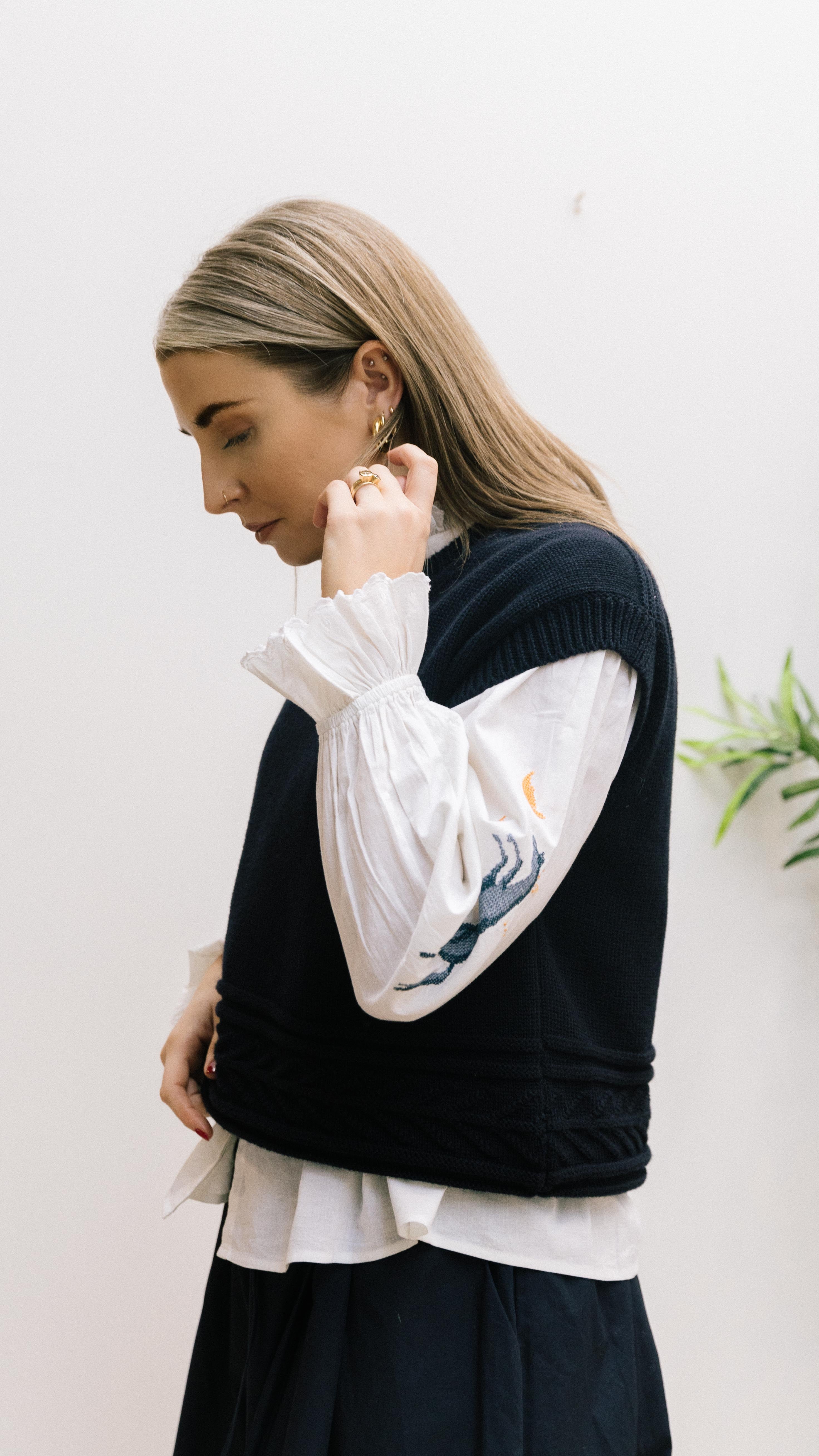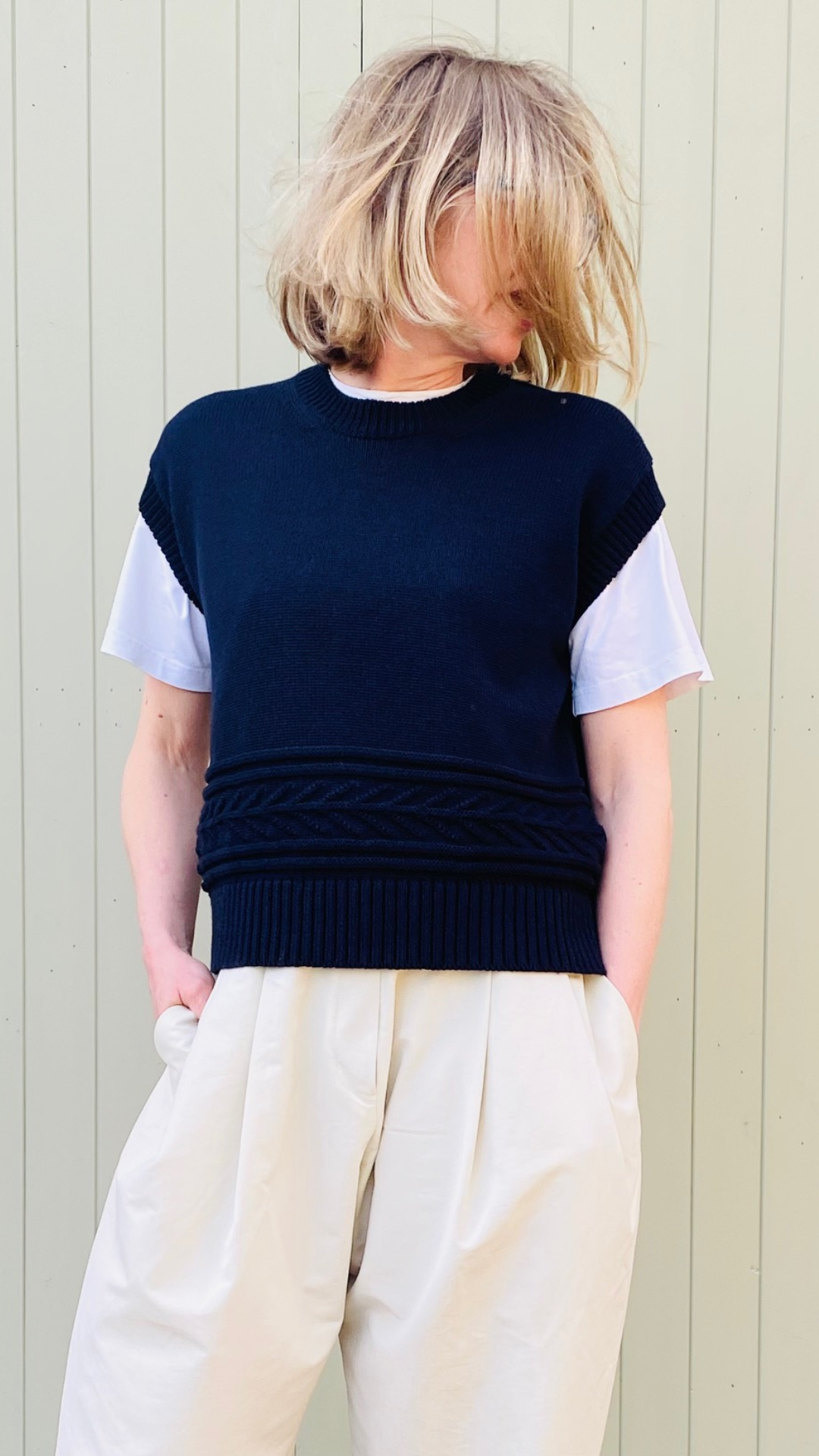 The West Spring weight vest by Charl is knitted in the highest quality merino and organic cotton yarn. Featuring fashion back shoulders, a neat crew neck and boxy silhouette, making it perfect for spring/summer styling. The arm hole is dropped for easy styling over dresses and blouses or on it’s own. Complete with an authentic Norfolk “Herringbone” panel that wraps around the bottom of the vest.