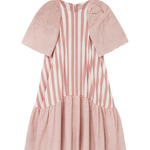 The Annie Dress by Lydia Ellen is a voluminous upcycled design crafted from white and pink striped cotton. This playful piece is made from 100% cotton upcycled bedding, giving new life to pre-loved textiles while offering a bold, striking look.