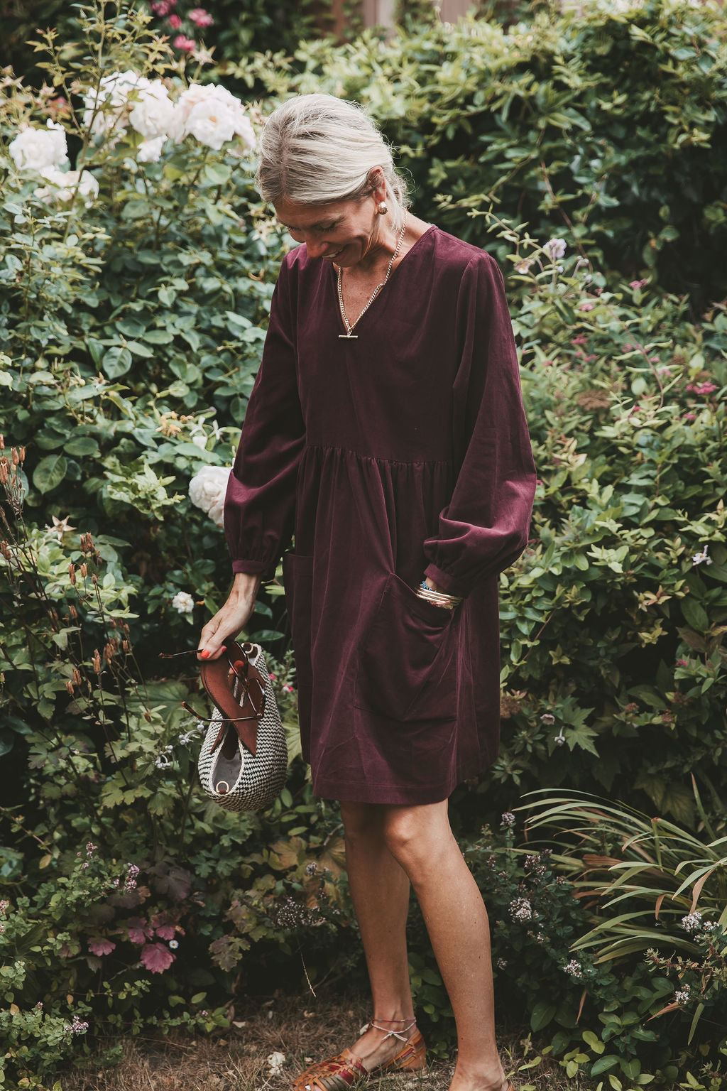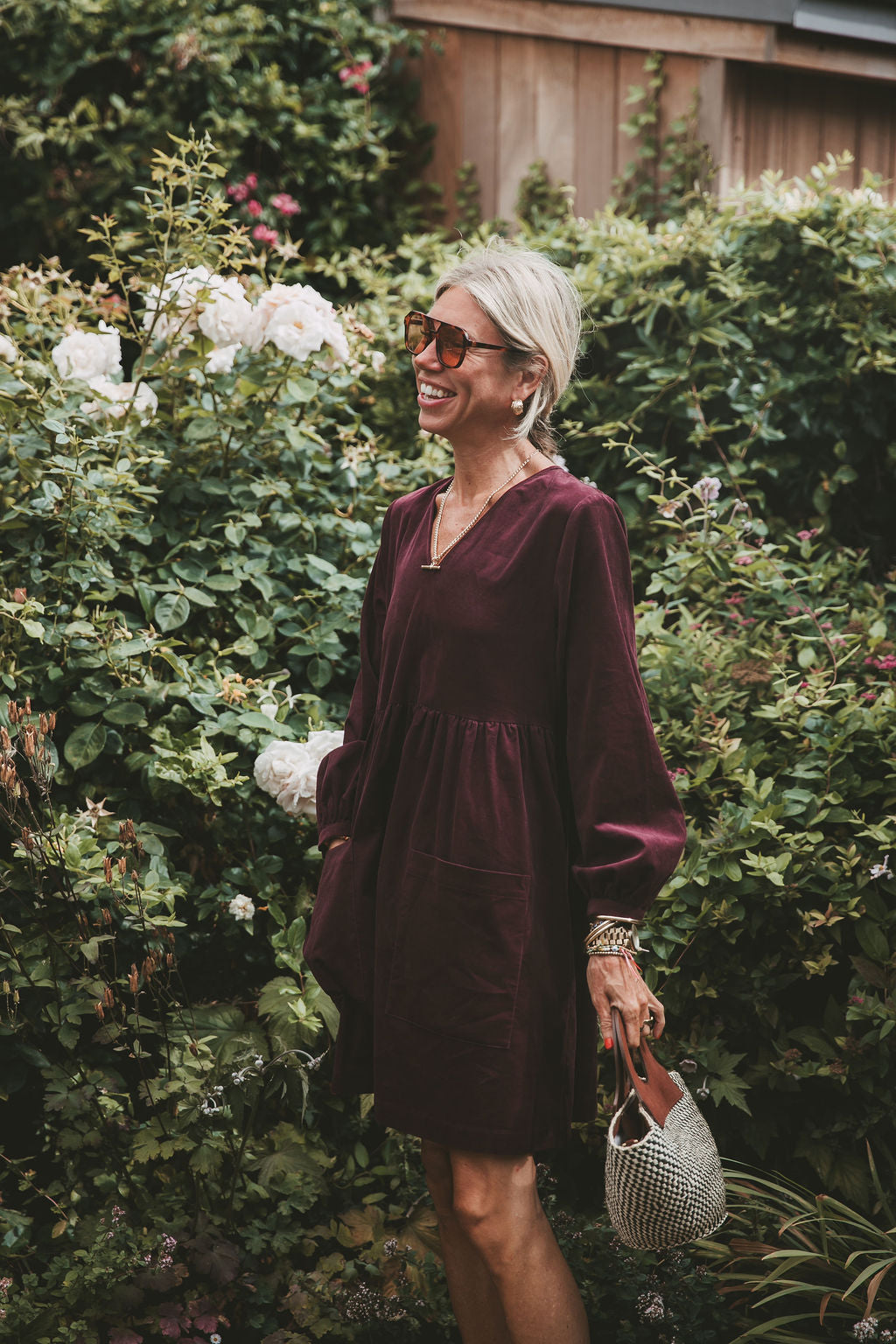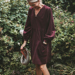 burgundy cord dress with V-neck and blouson sleeves, short corduroy mini dress with patch pockets
