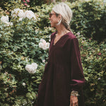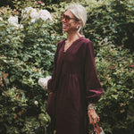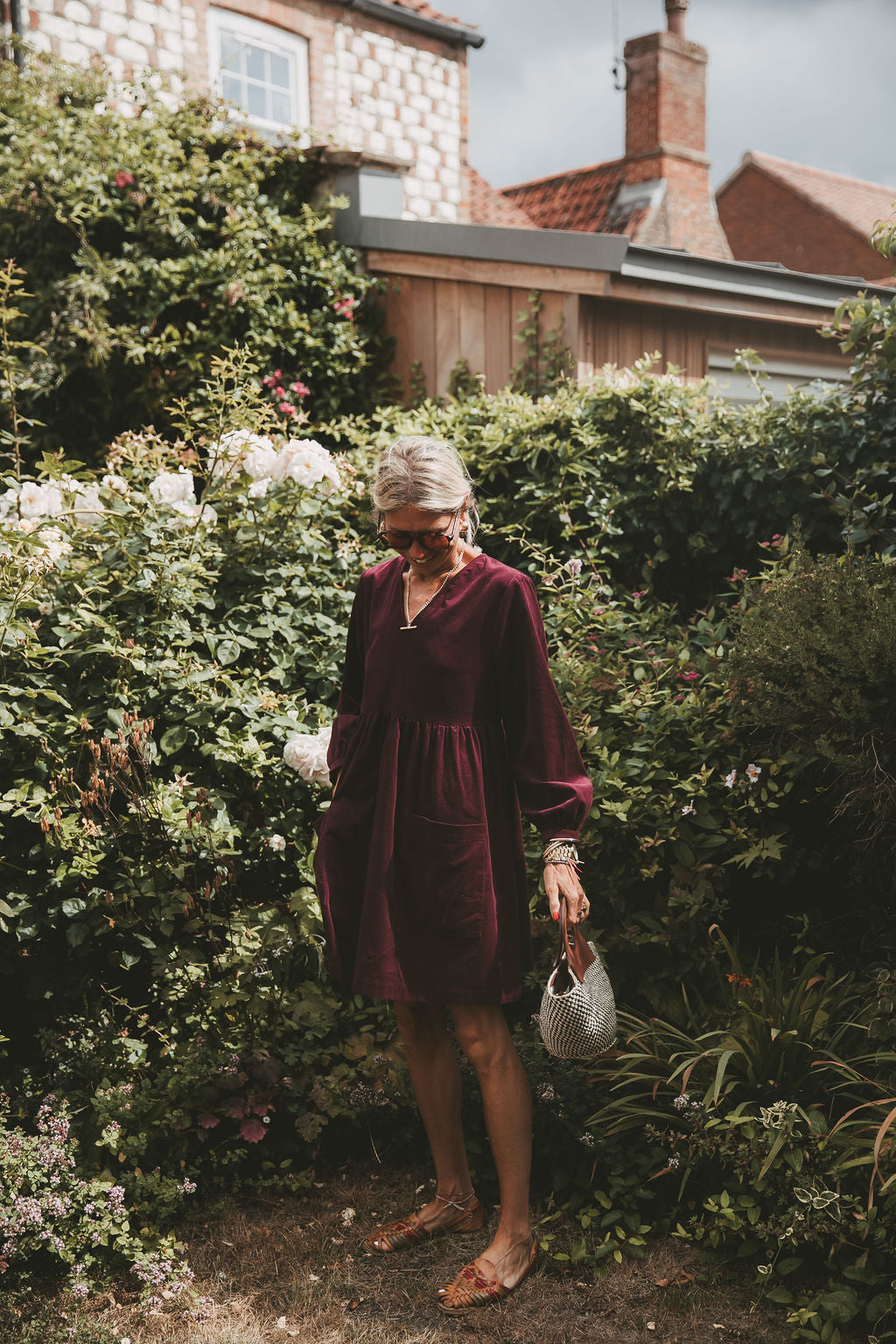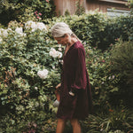 back detail of ethically made organic cotton corduroy dress in rich burgundy shade