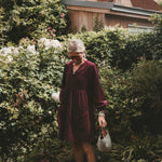 The Burgundy Corduroy Mini Dress by Albaray is a short corduroy dress in soft baby cord with a flattering V-neckline and voluminous sleeves for an effortlessly refined look.