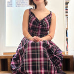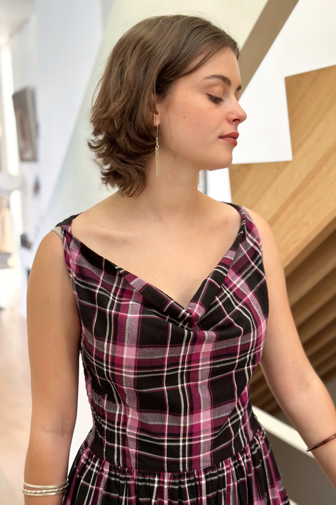 This checked maxi dress by Indilisi is a modern take on timeless tailoring. Handwoven from soft, breathable organic cotton in berry and black check, the Celia Cowl Neck Maxi Dress combines a flattering cowl neckline with an elegant drape and subtle shaping for comfort and confidence all day long.