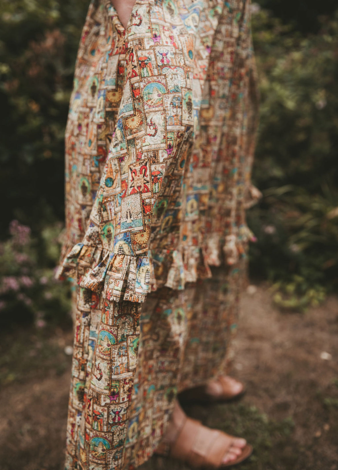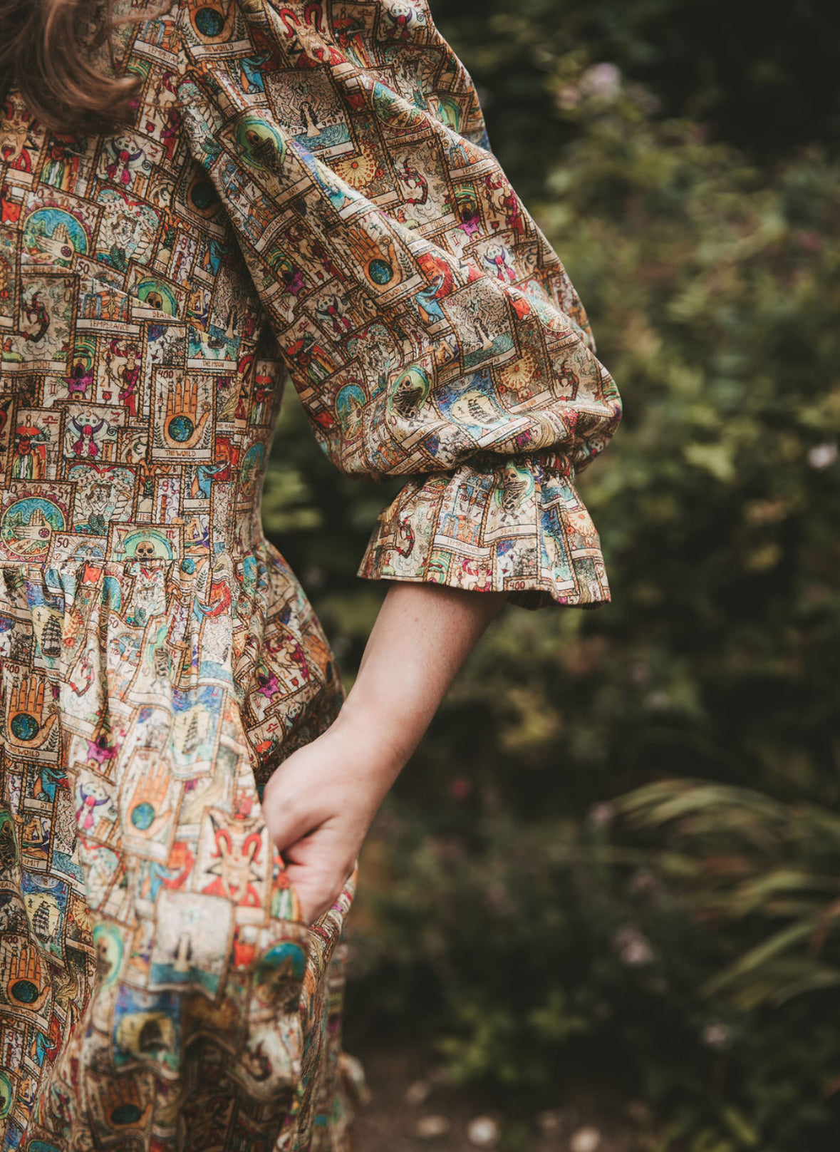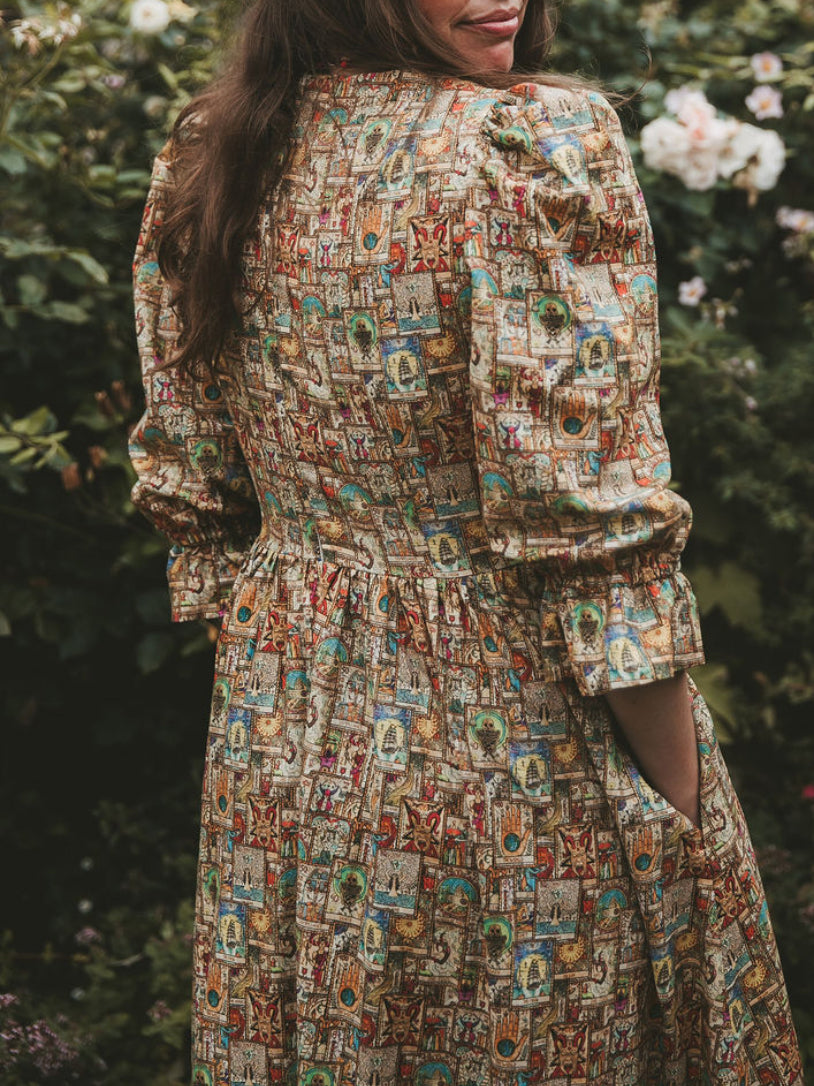 Crafted from soft cotton in an intricate tarot card print, this dress showcases colourful symbolic artwork across a vintage-inspired silhouette. We love the golden hues with flashes of neon and the quirky tarot card print gives this timeless shape a magical, storytelling quality.