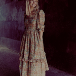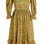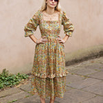 Features include a square neckline, softly gathered long sleeves with ruffled cuffs, a gently tiered midi skirt for graceful movement. The bodice offers subtle shaping for a flattering fit through the waist.