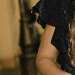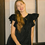 Large fluttering ruffles with an elegant pintuck hem. 3 beautiful covered buttons, and of course she has pockets!