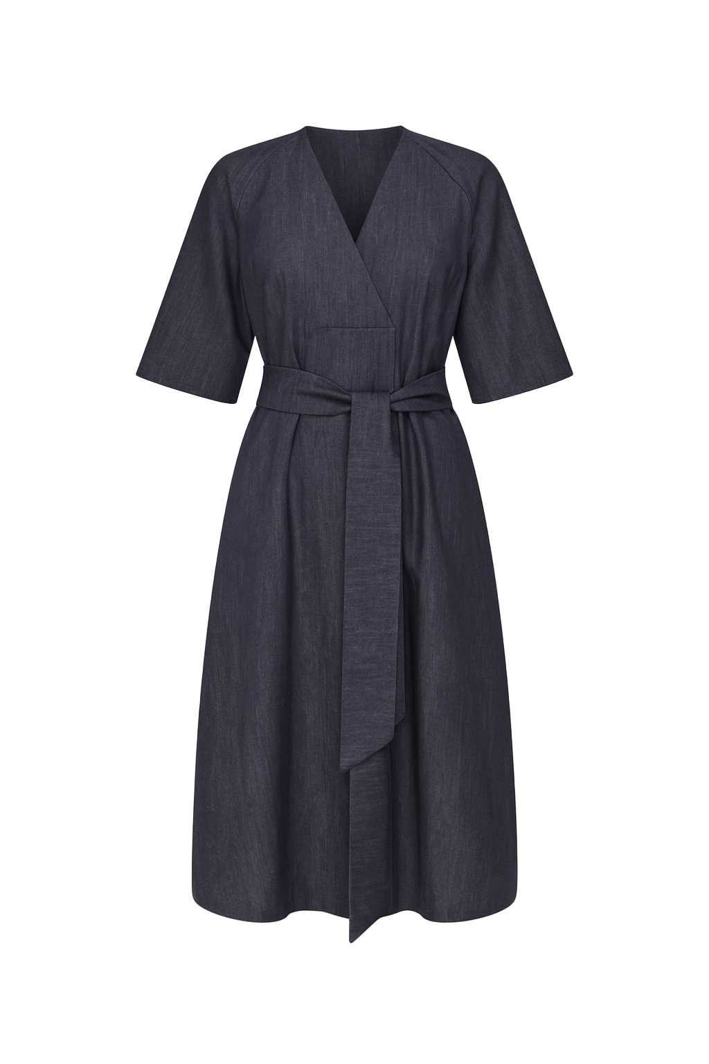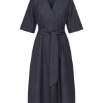 This denim dress by Indilisi is a modern wardrobe classic. Crafted in London from 100% organic cotton chambray, the Rebecca Denim Dress combines a flattering midi length and V-neckline with a relaxed structure and adjustable tie-belt for a naturally elegant silhouette that suits every shape.