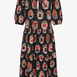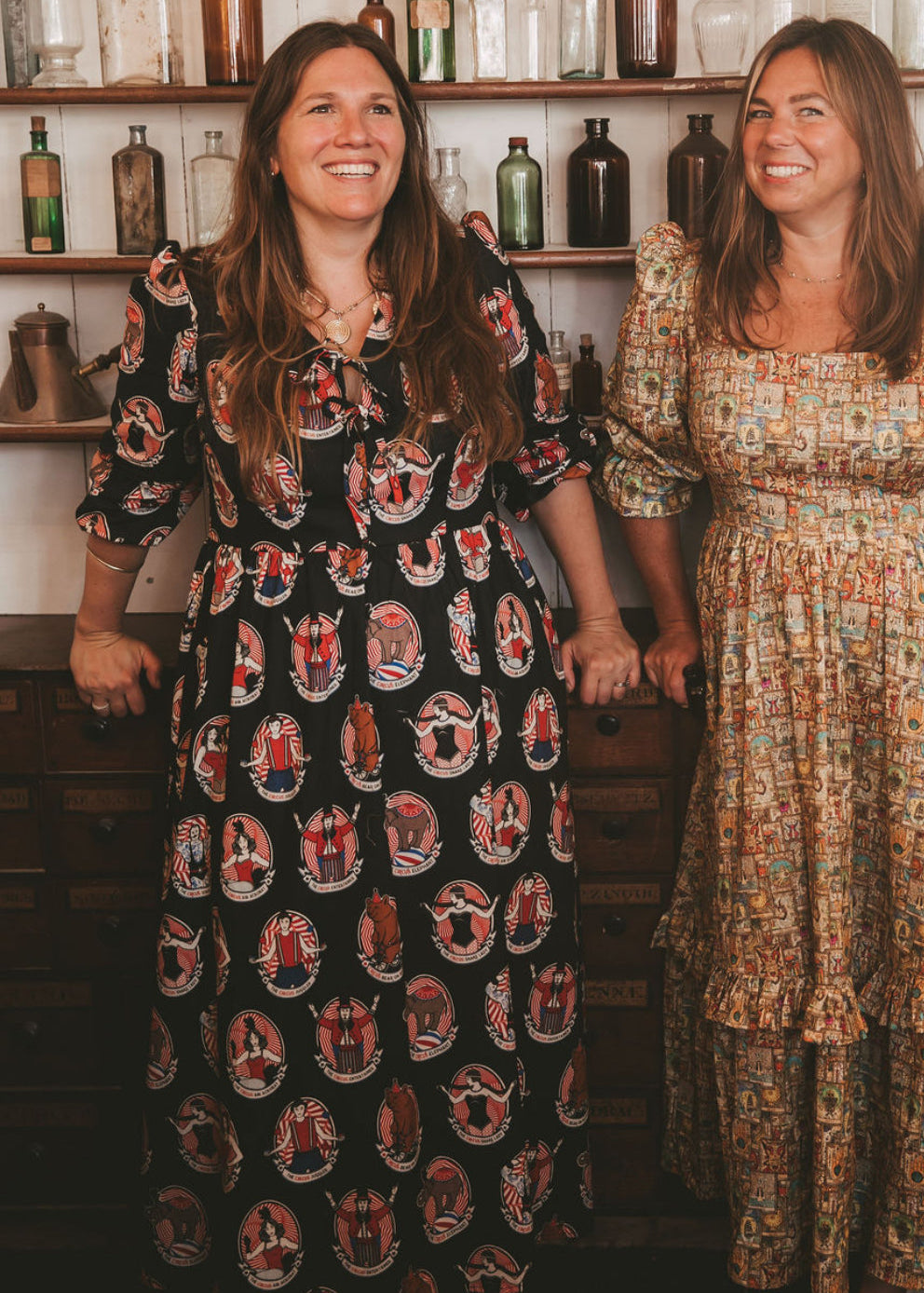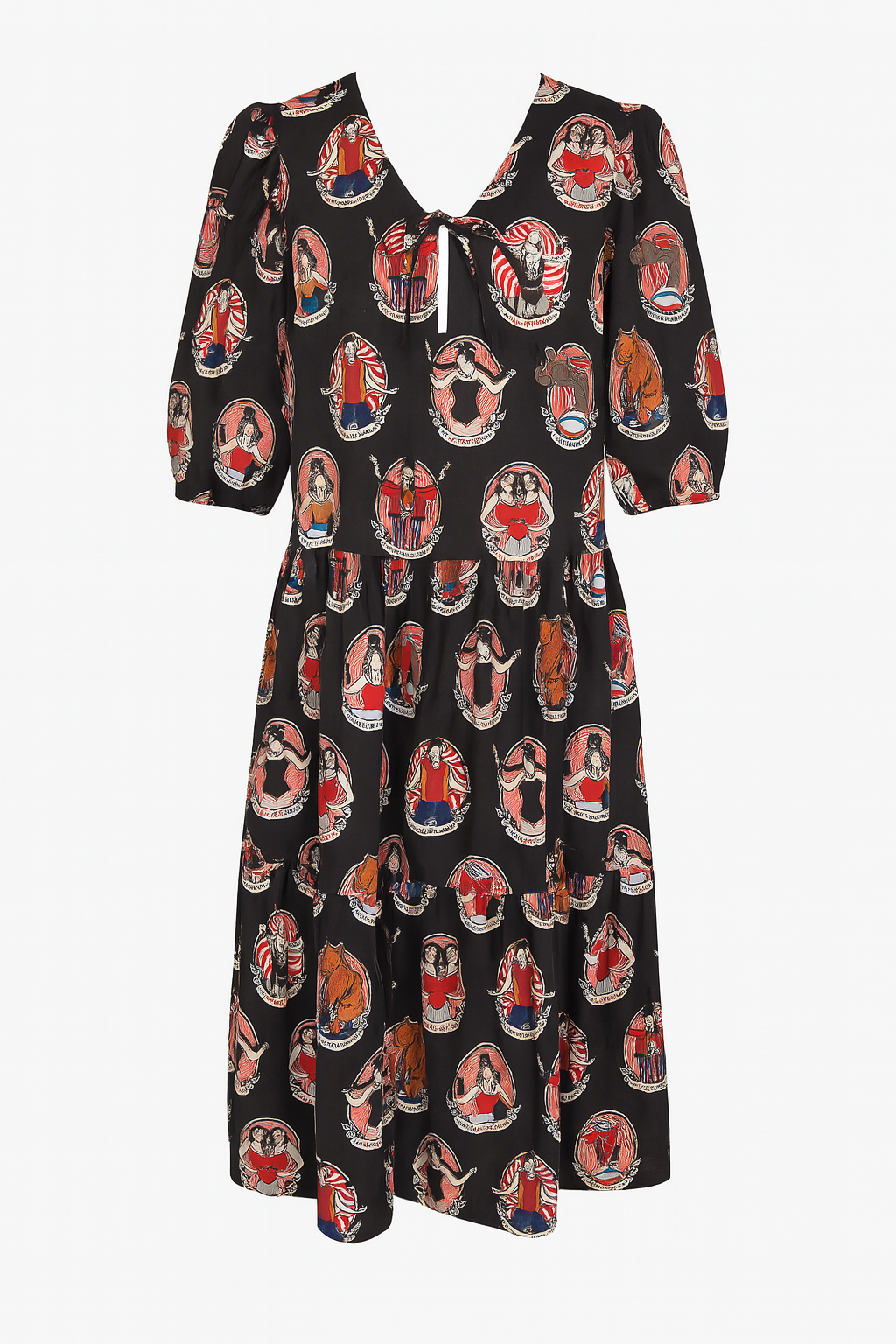 This long sleeve midi dress fits gently at the waist before flaring into a full skirt for elegant movement. The soft V-neckline is finished with two ties that can be knotted or bowed for a feminine touch. Cut from sustainable cotton in a bold vintage-style circus print, it offers standout character with timeless shape.