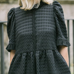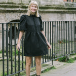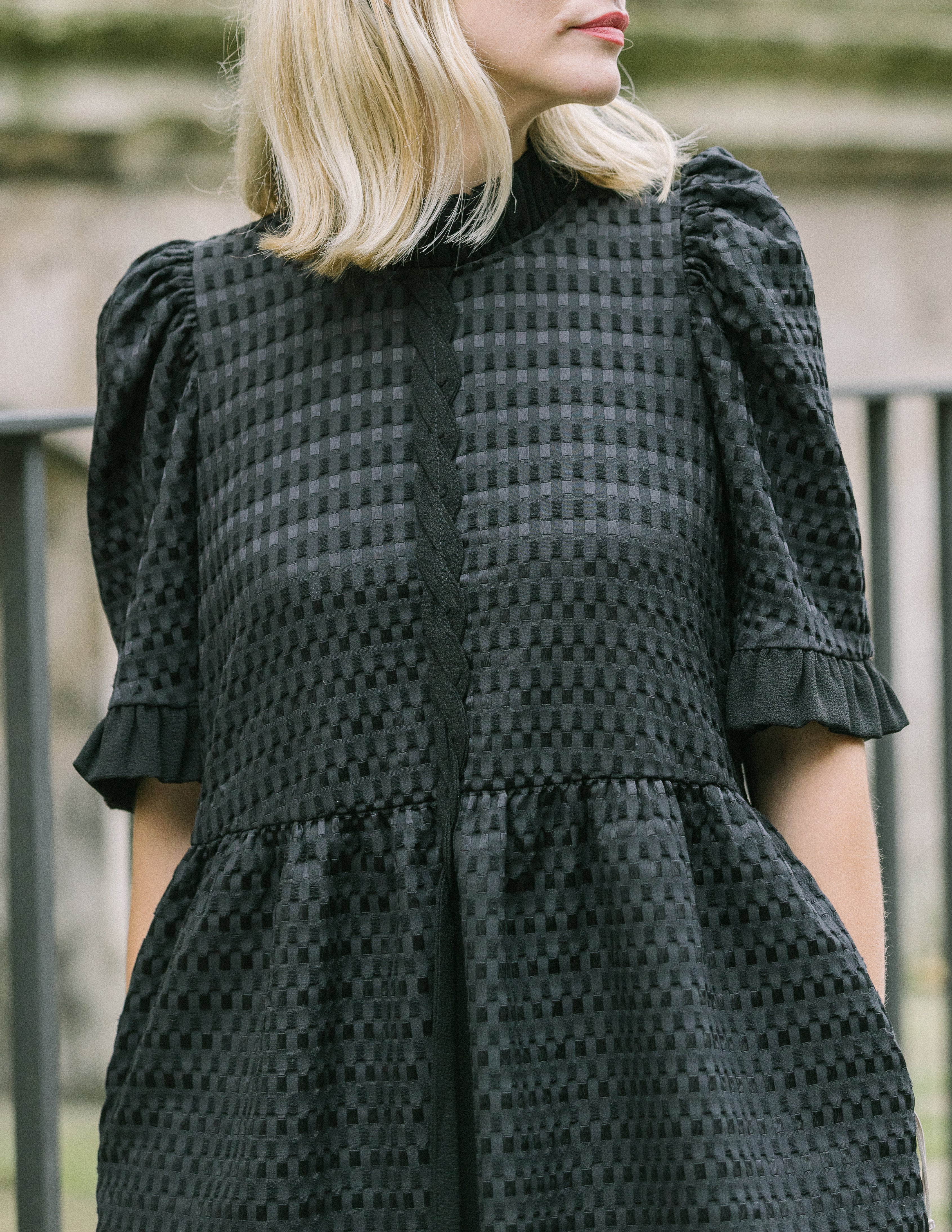 A beautifully shaped dress in an amazing vintage black check damask. It' the most fabulous handle and works a dream with the contrast black frill on the sleeve, neck and delicate twisted plait detailing . Length can be altered.